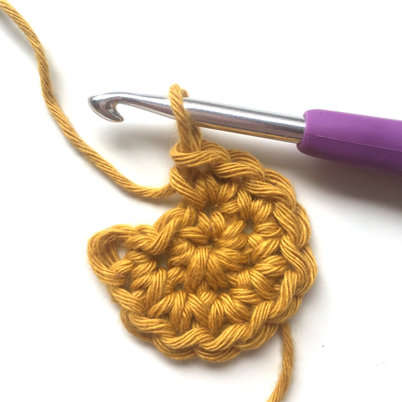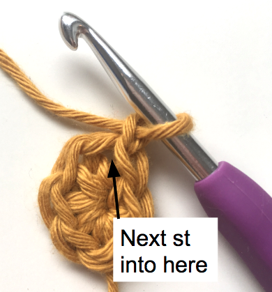 2) Now you start Round 2 of your pattern. Chain according to your pattern. The number of chains here will depend on your next stitch: dc=ch1 htr=ch1 tr=ch2 (similar to a turning chain when working in rows)