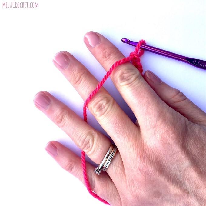 The yarn needs to be held with tension so that the stitches are a regular size, this comes with practice but it is a good habit to raise either your index or middle finger and hold the work with the other so that you can easily progress to more advanced stitches.