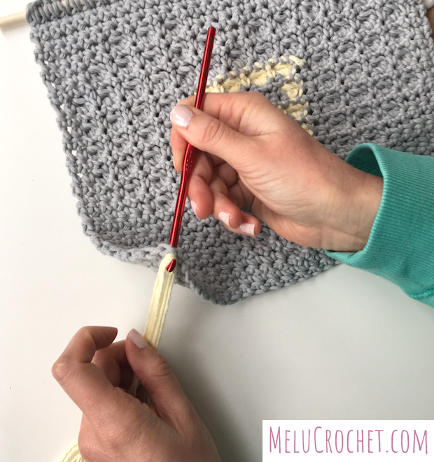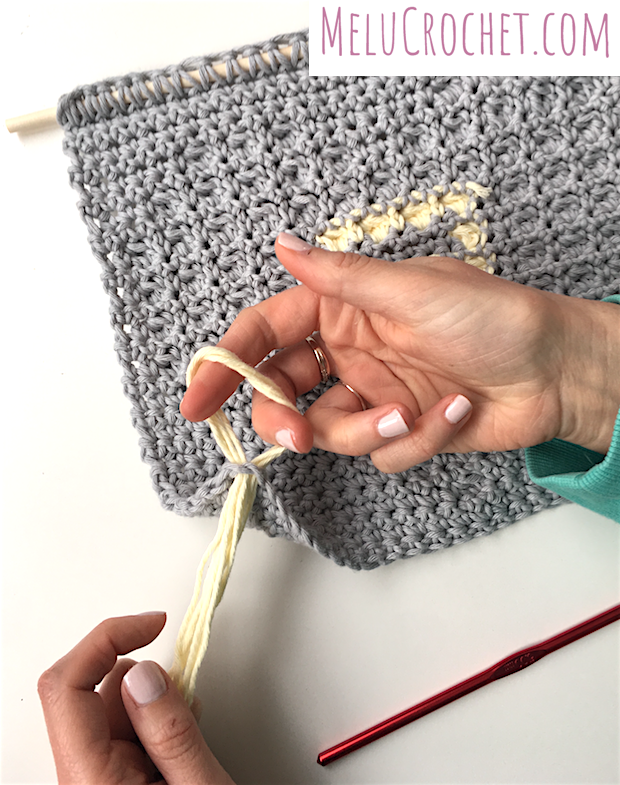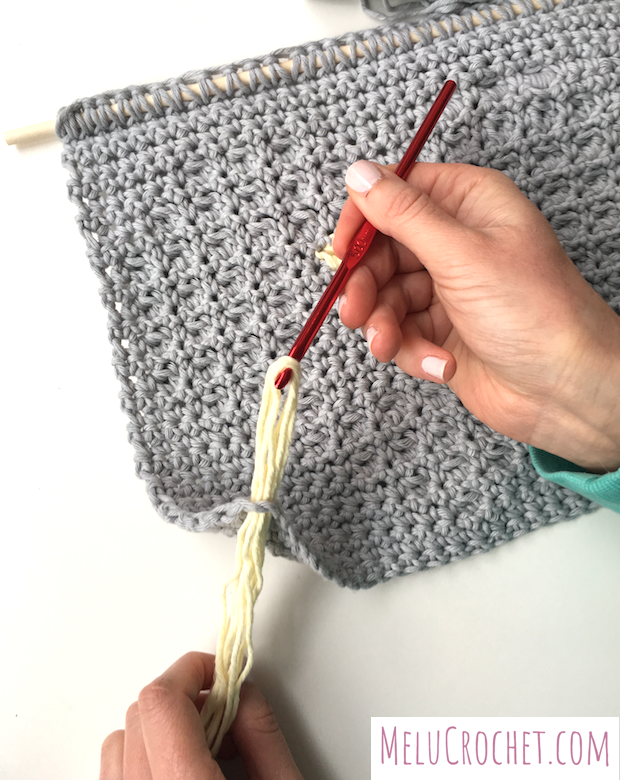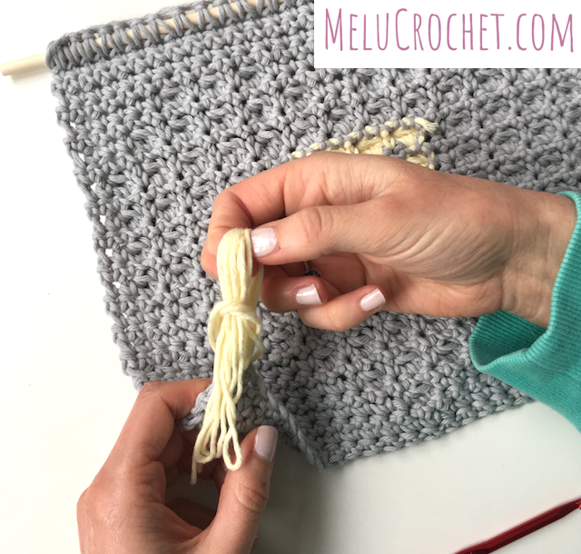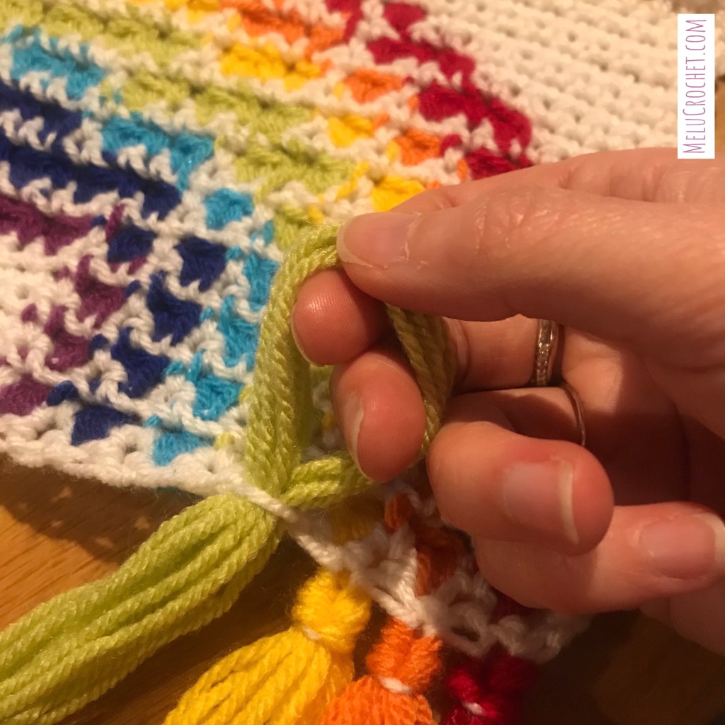 Continue to add tassels through each of the foundation chains. If adding tassels to the other end of your work, use the top of your stitches on your last row.
