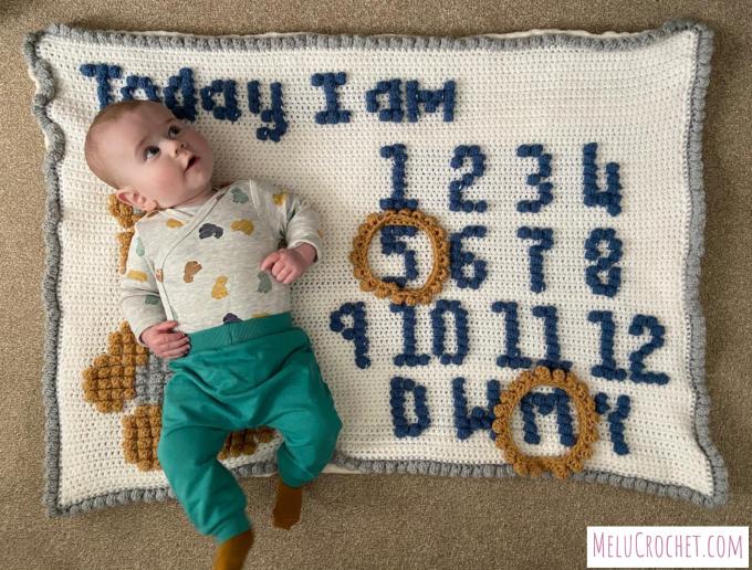 I have just received these beautiful photos of my Teddy Milestone Bobble Stitch Blanket Pattern being used each month to track this gorgeous baby as he grows!