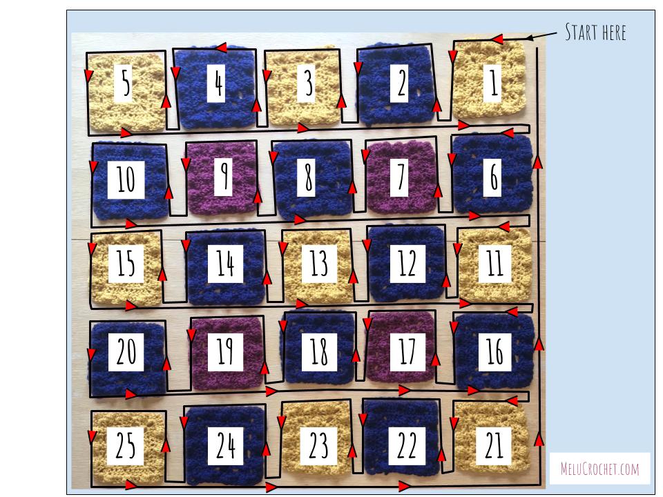 I joined using the continuous join as you go method, with the squares laid out like this: