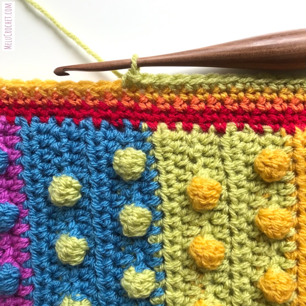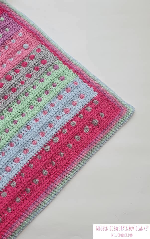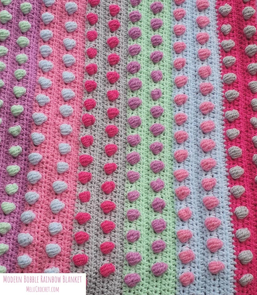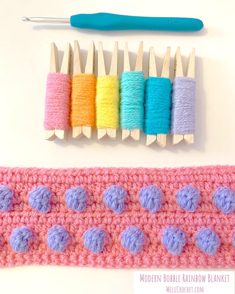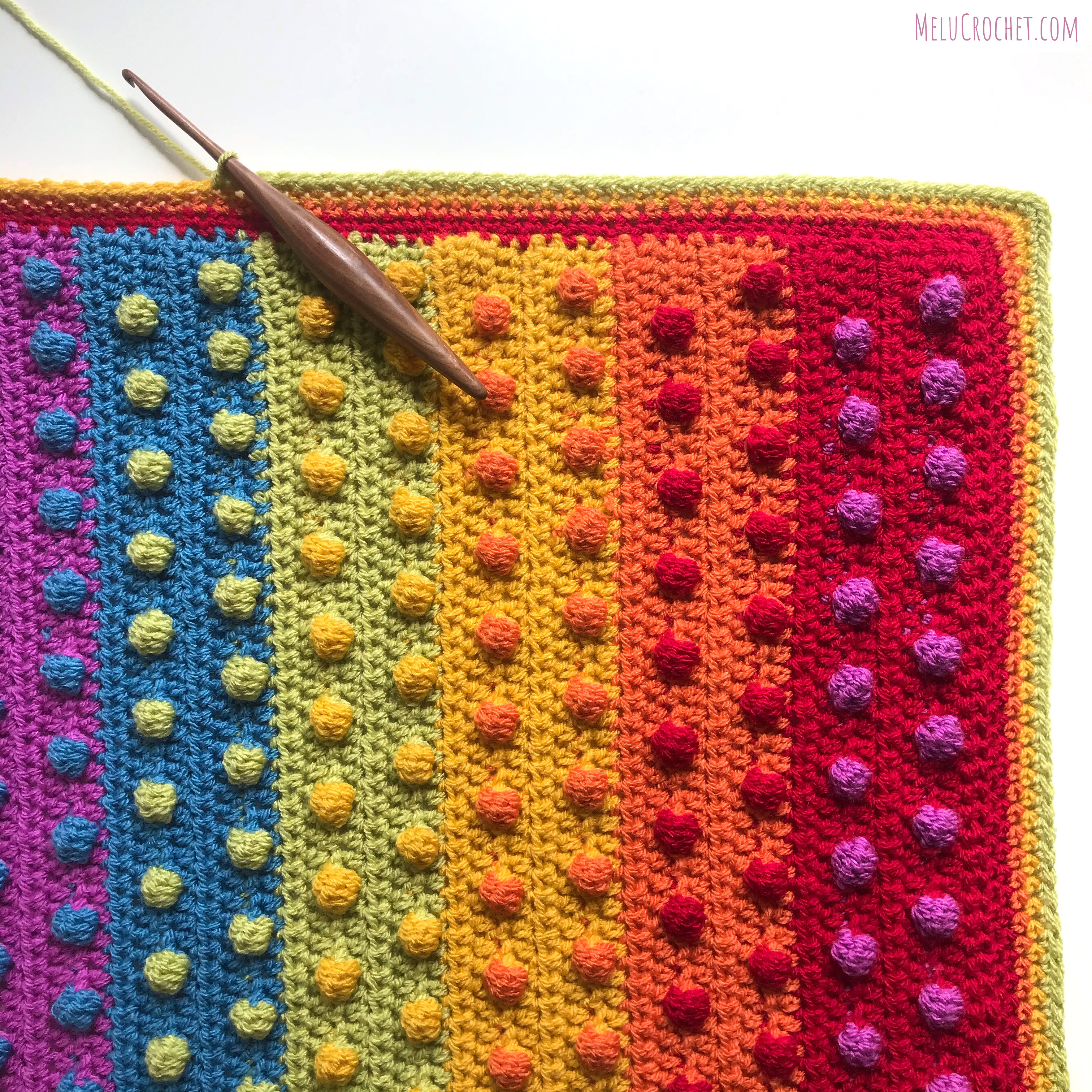 In this Modern Bobble Rainbow pattern I give you instructions with a colour recipe and photo tutorial to help you make the bobbles pop with a different colour than your working yarn, therefore previous knowledge of how to make a bobble stitch and carry yarn will be helpful.