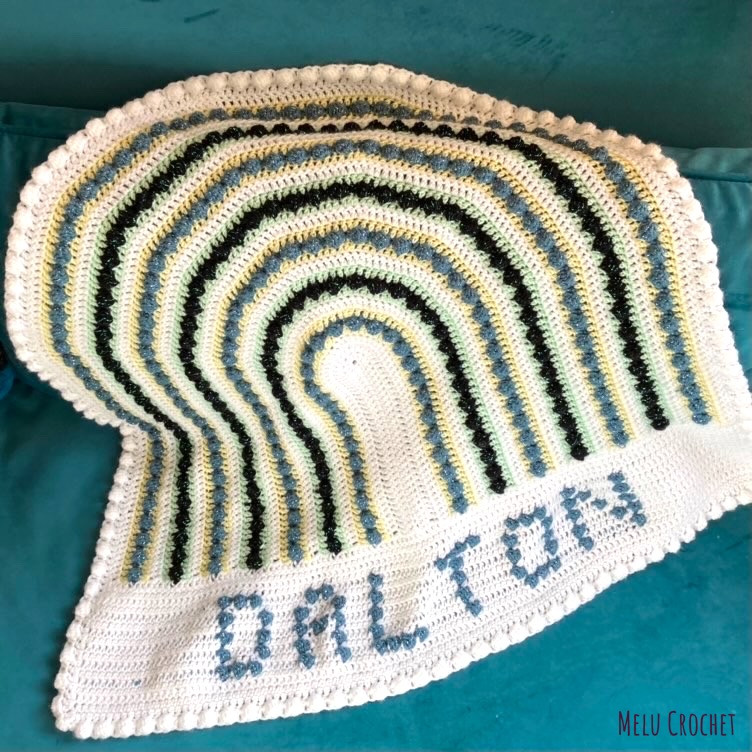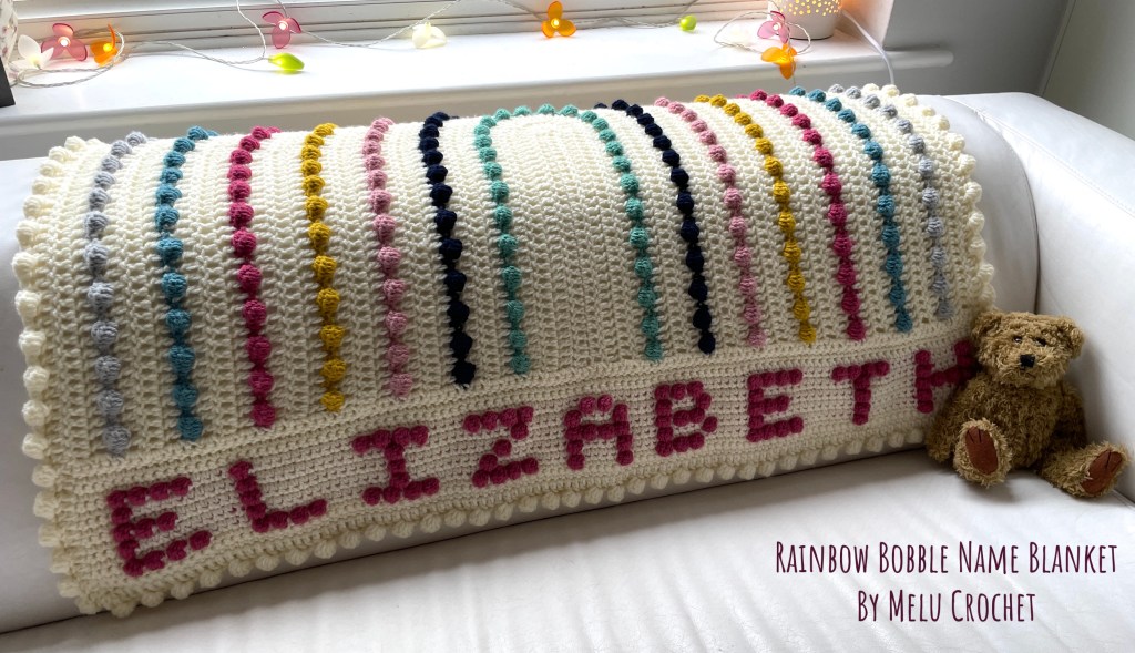 You can easily personalise your work using my customisable bobble blanket design to make something truly unique – your creation will be a perfect new baby gift. Using my template, you’ll create your own name chart so that you can add any name to this beautiful rainbow blanket design.