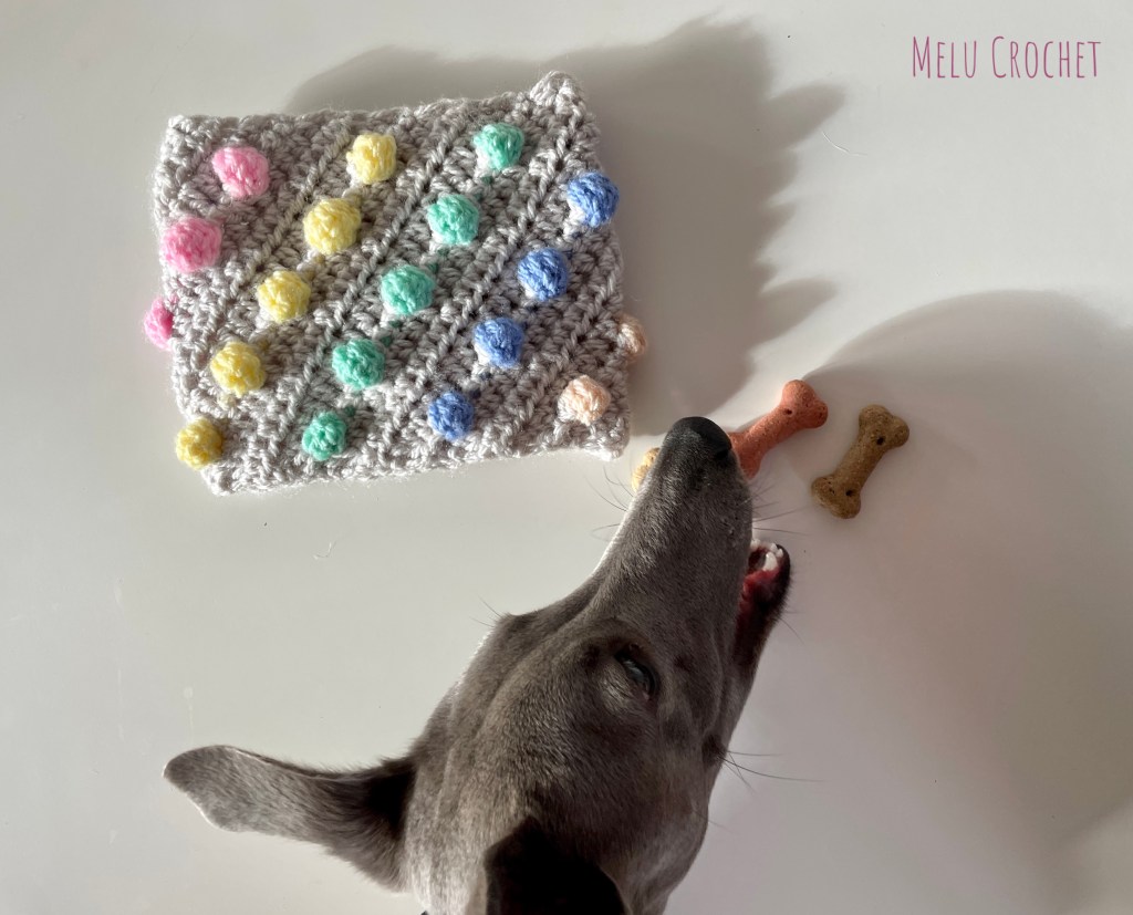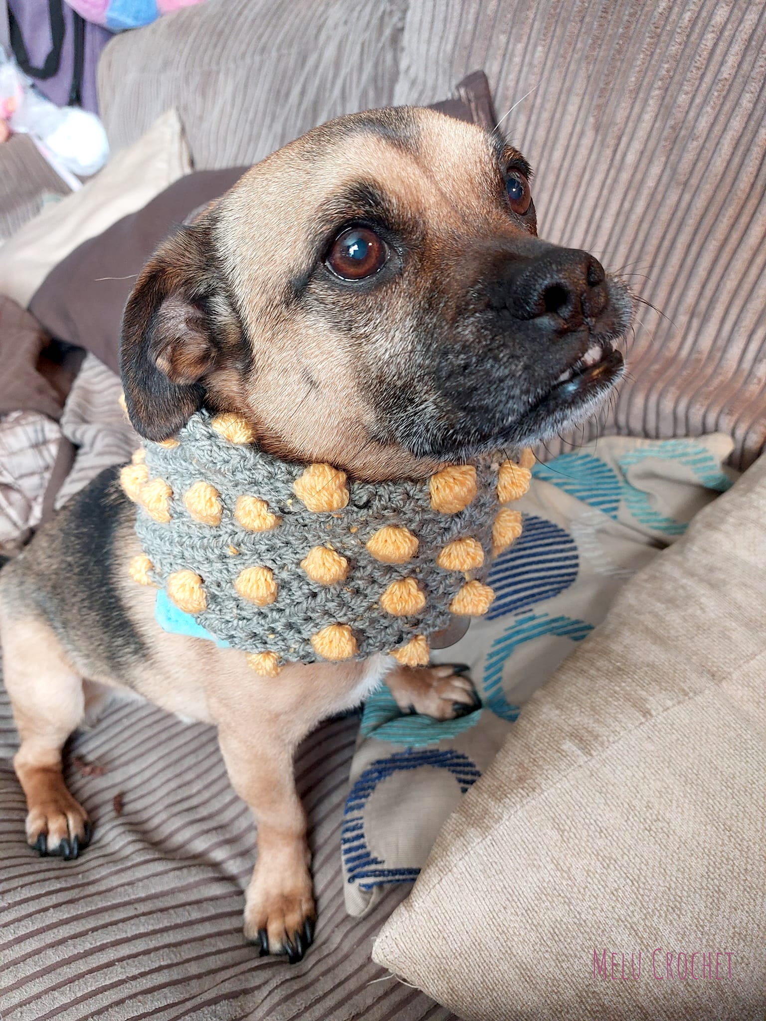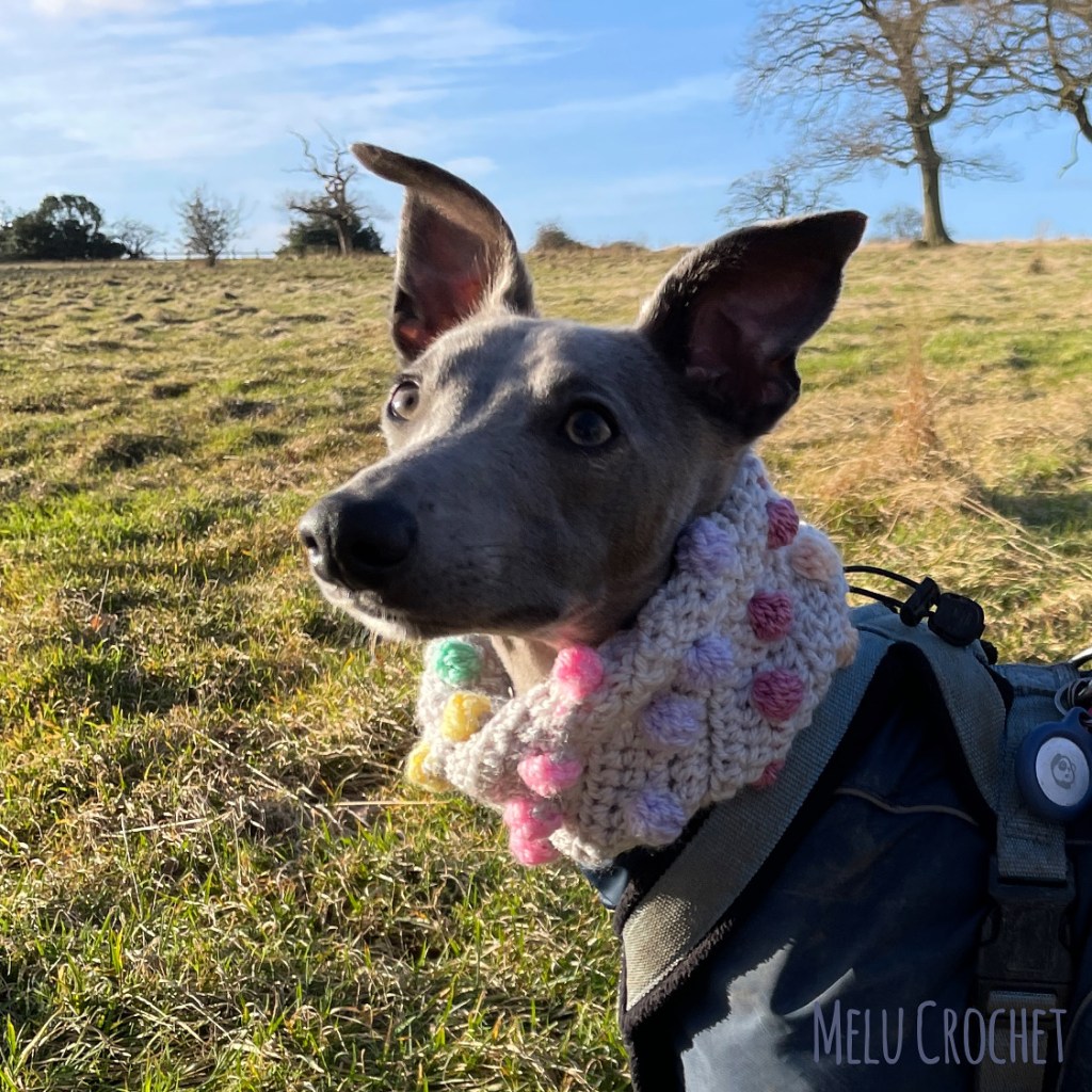 I have designed this cute crochet Rainbow Bobble Snood pattern to keep your doggy warm and stylish during the colder weather. It uses diagonal half trebles, dc and bobble stitches in a simple repeating pattern. Tried and tested by Ernie, Skye and a few cat friends too!!