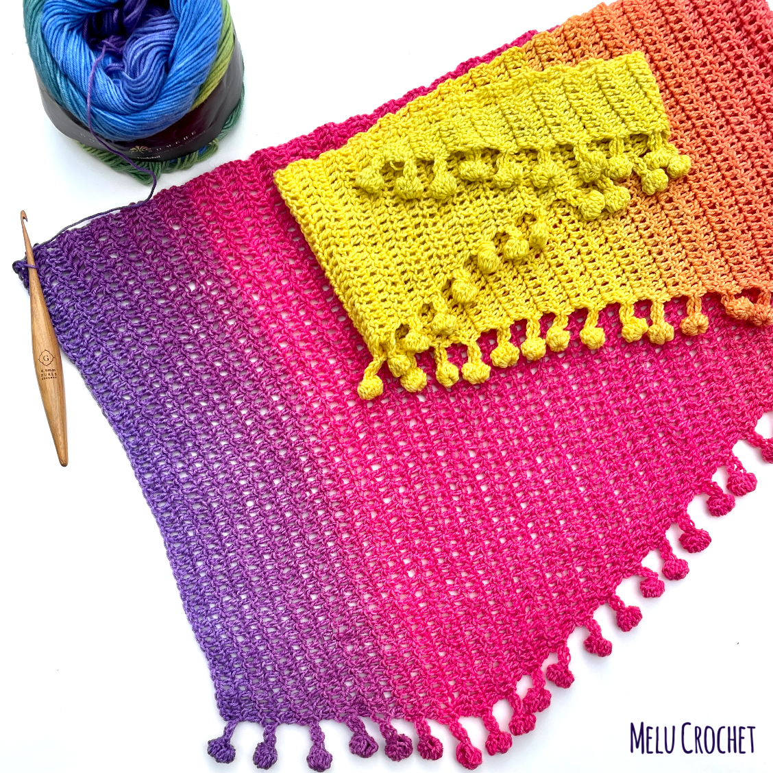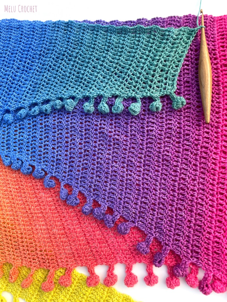 This is a quick and easy pattern, the pom pom edging is worked as you go along so it is a great pattern for using colour change yarn, as the pompoms will match the colour of your stripes. Unlike tassels or sewn on pom-poms, you don’t need to worry about them coming off.