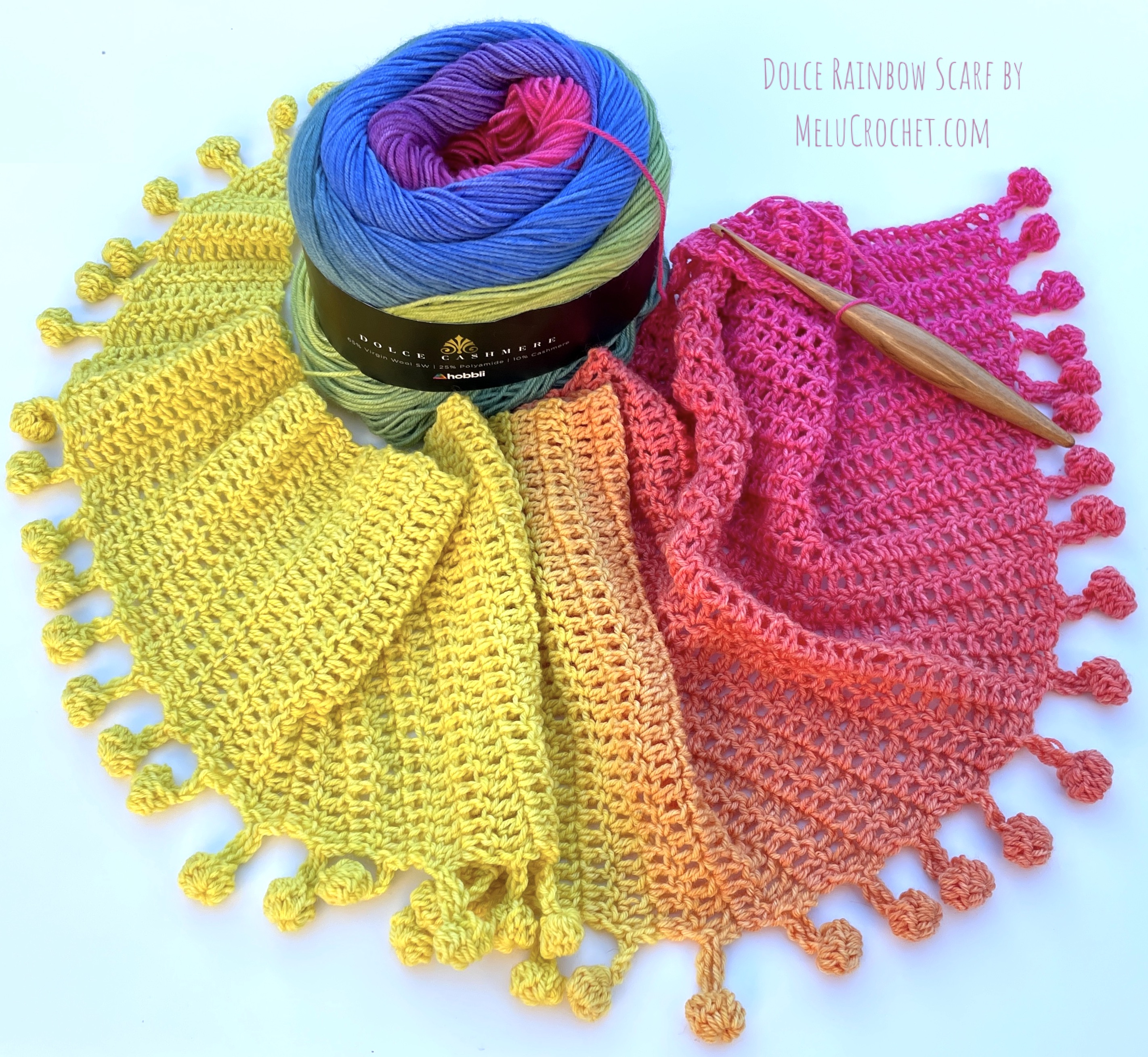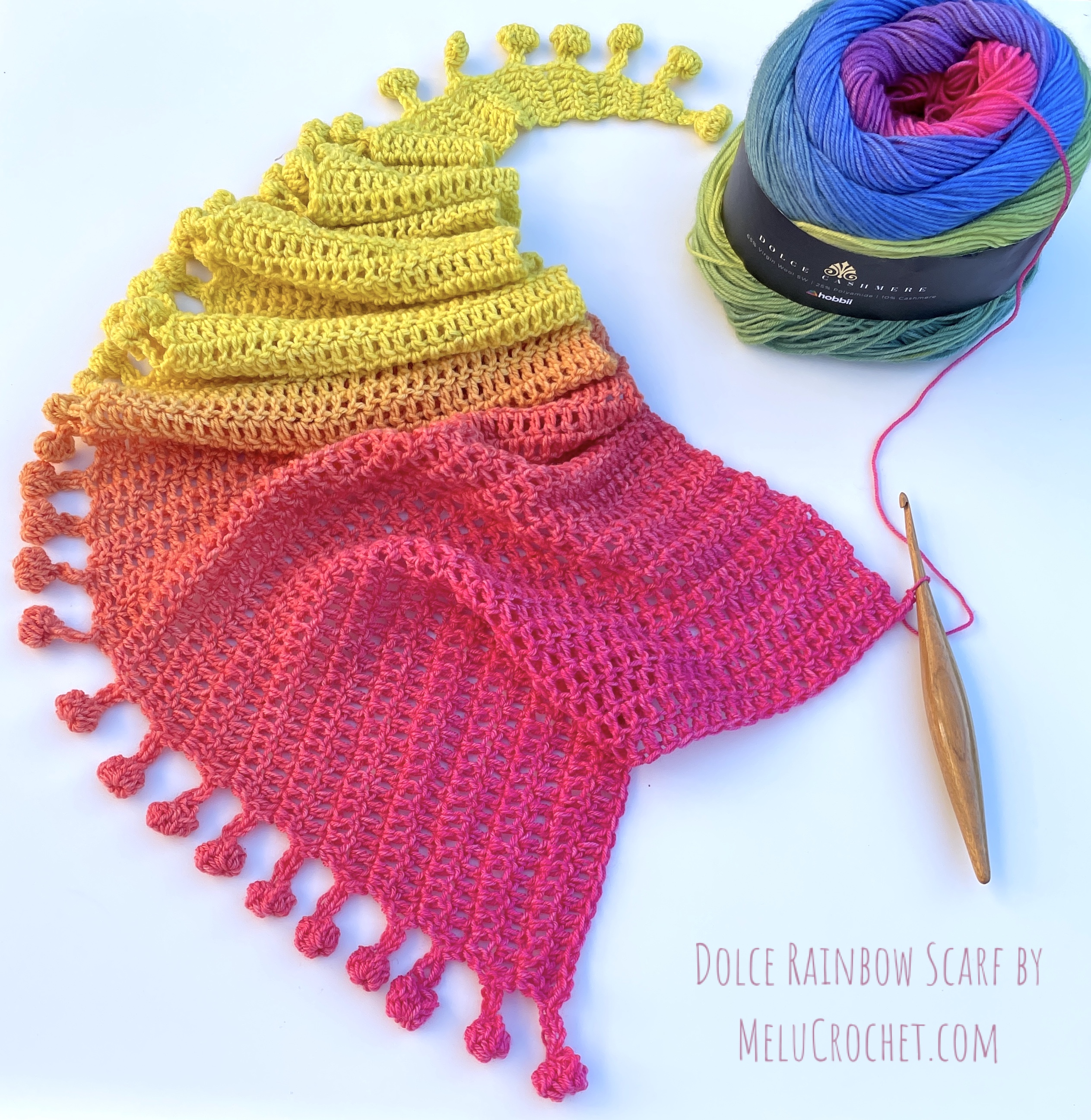 My Dolce Rainbow Scarf is now available in my Etsy shop, LoveCrafts shop, Hobbii.com, Ribblr and Buy now on Ravelry