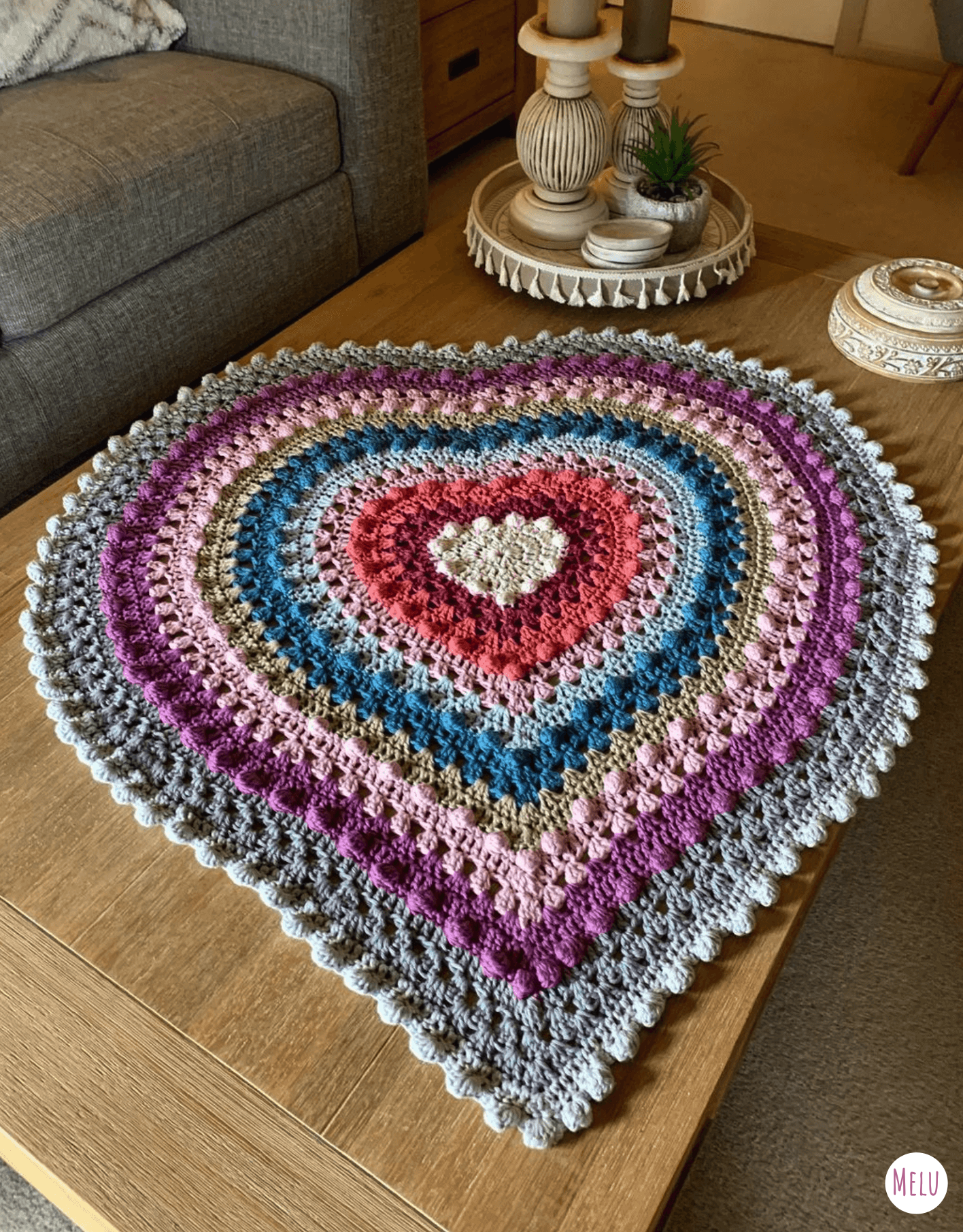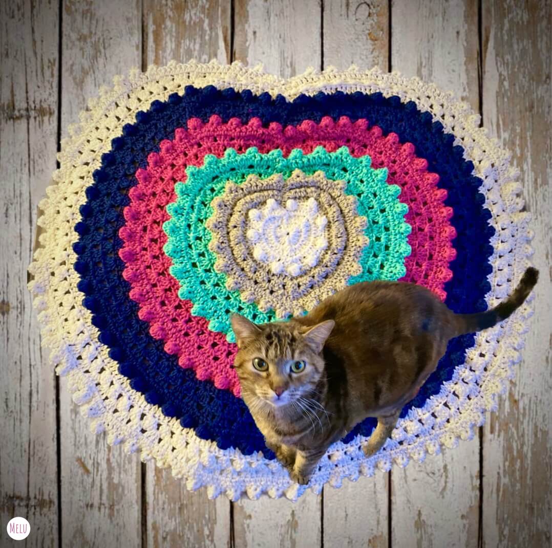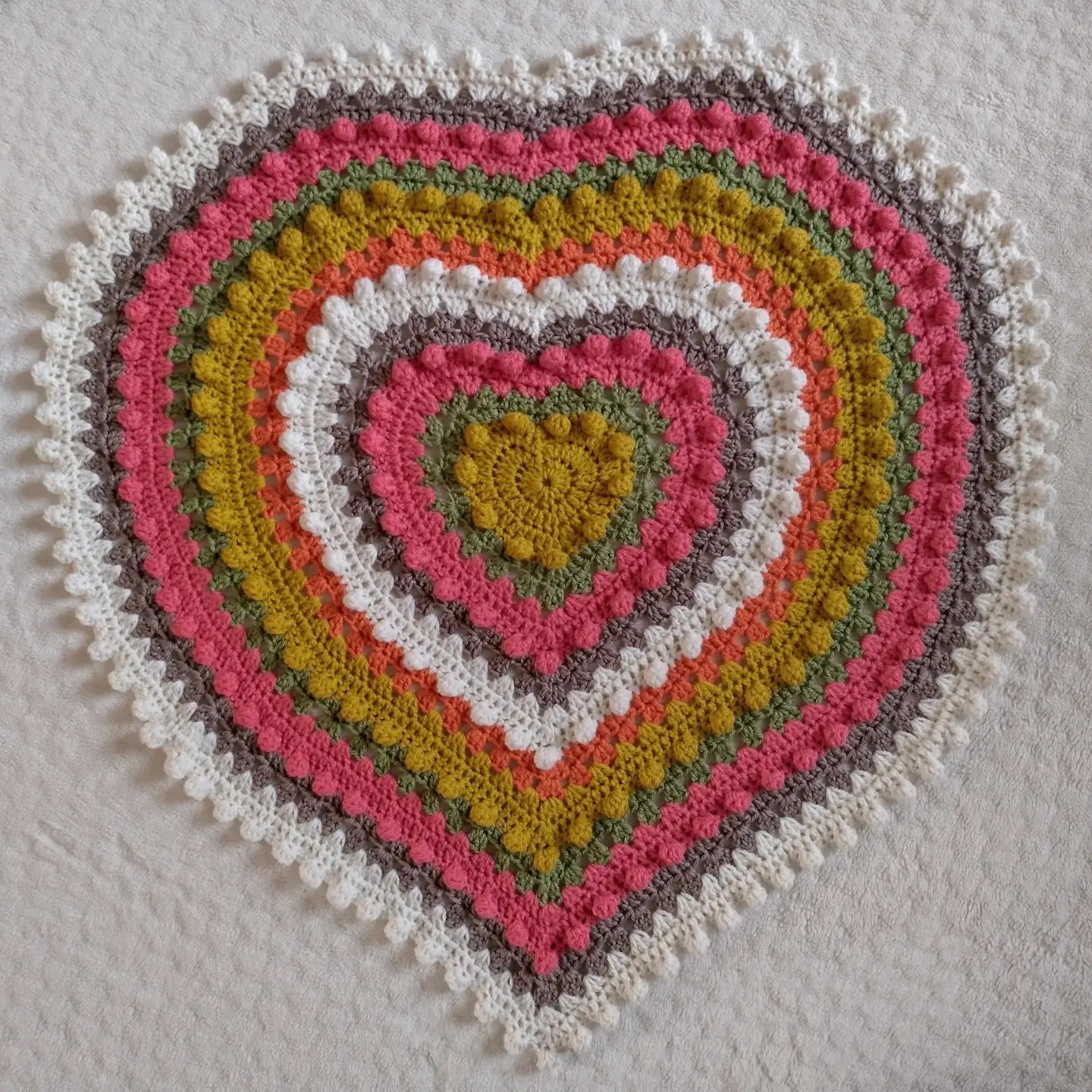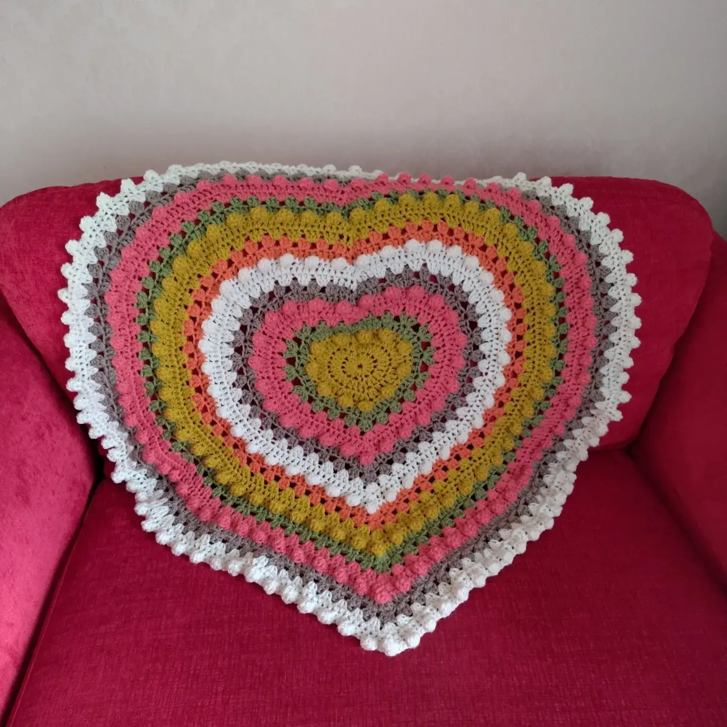 Create a stunning heart-shaped blanket with this intermediate-level crochet pattern! Designed with care to achieve the perfect shape, this cozy and stylish blanket features granny clusters and bobble stitches arranged in concentric hearts, bringing texture and warmth to any space.