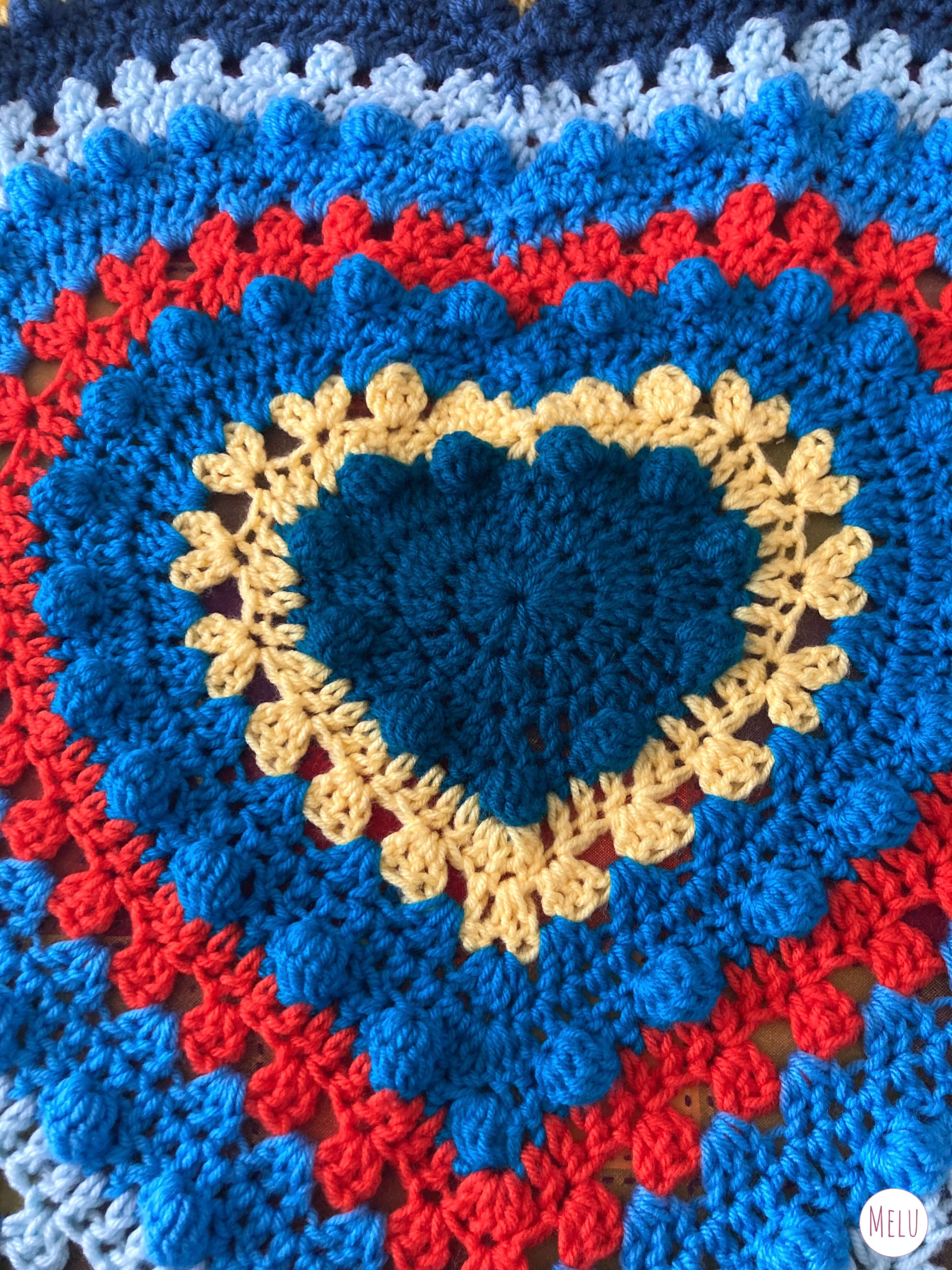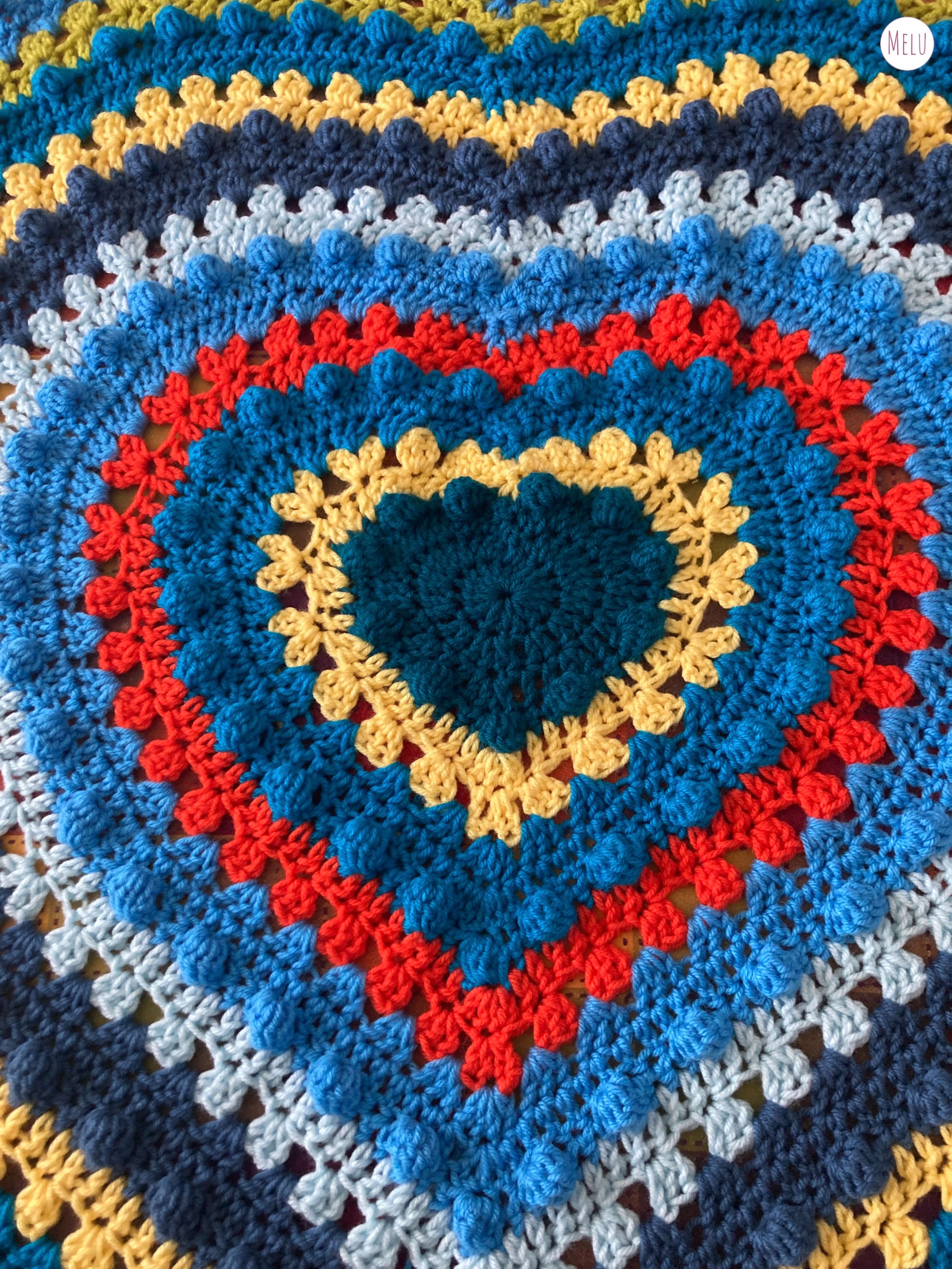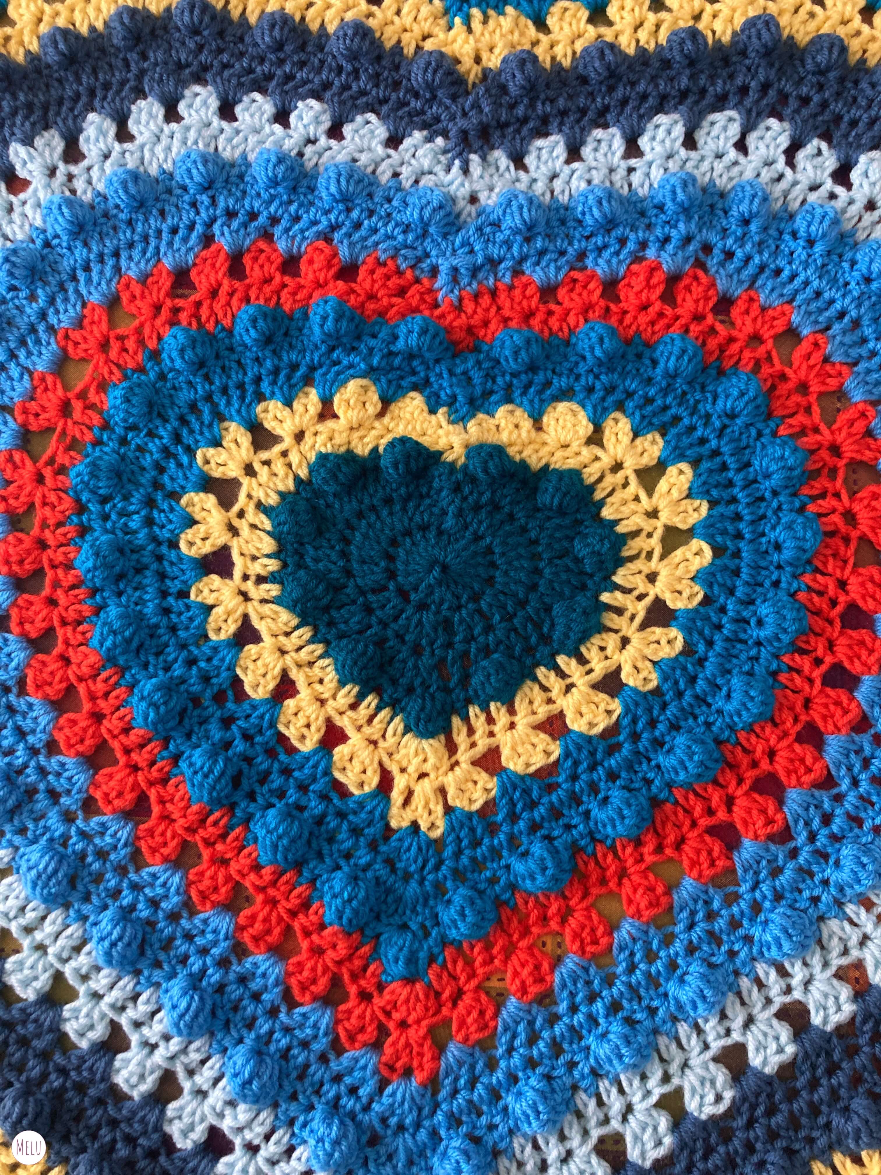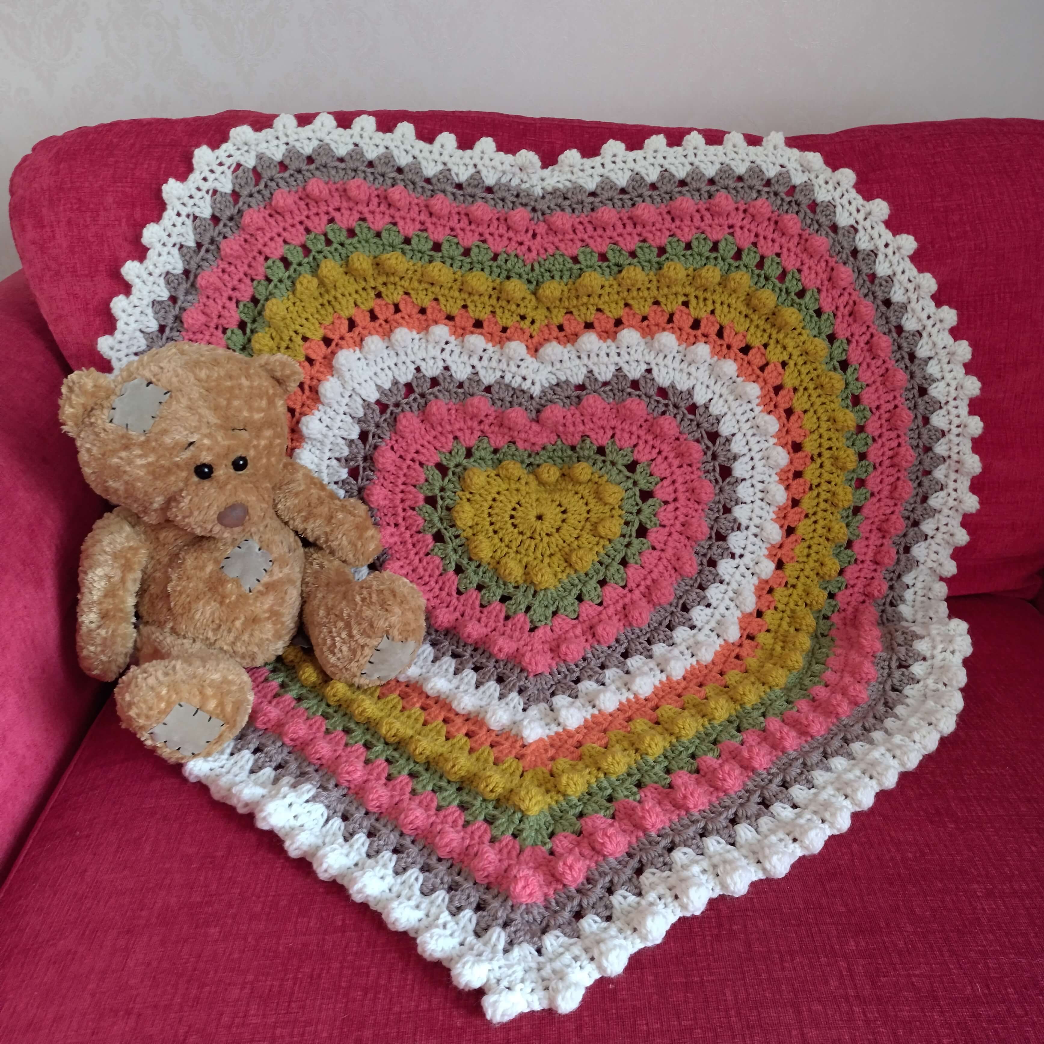 This lovely blanket combines granny clusters and the bobble stitch worked in rounds to highlight coordinating colours in concentric hearts.
