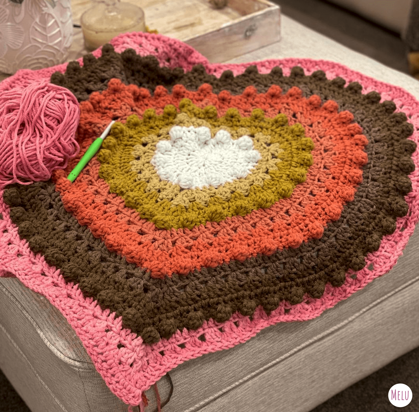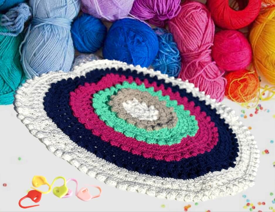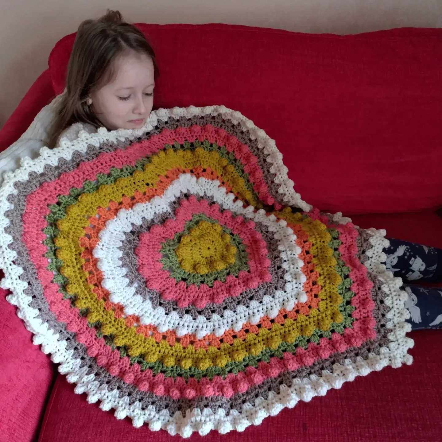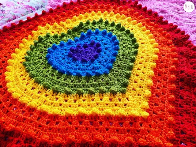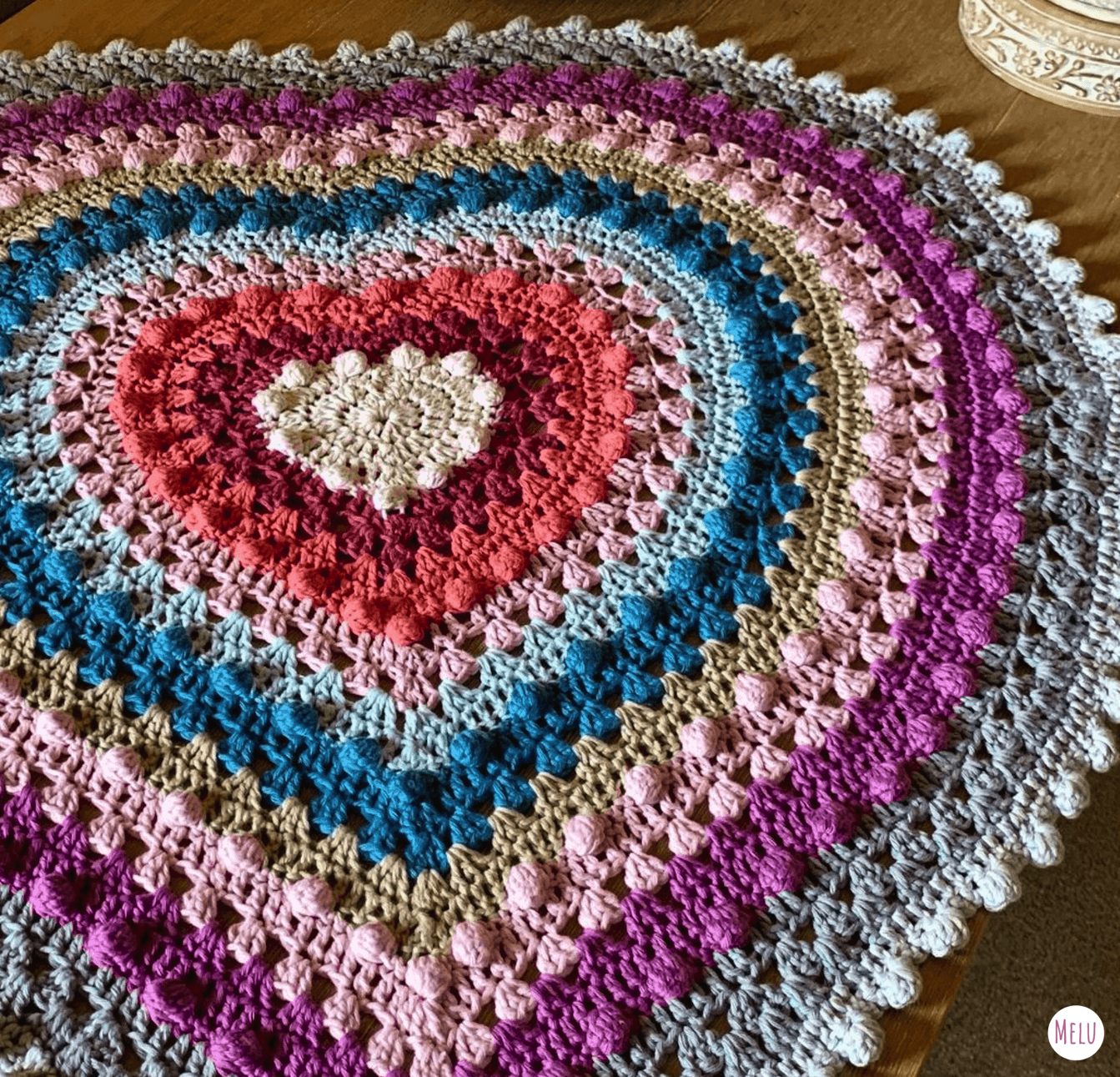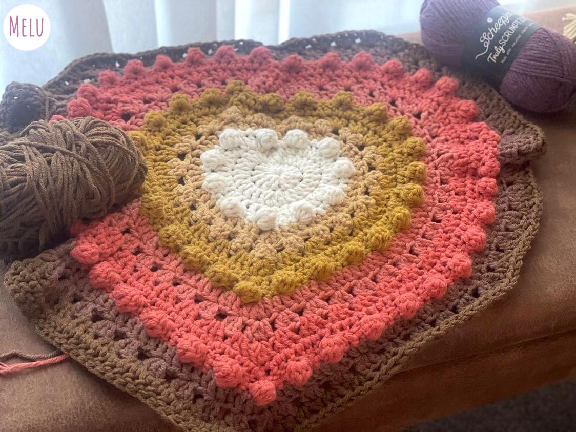 This lovely blanket combines granny clusters and the bobble stitch worked in rounds to highlight coordinating colours in concentric hearts.