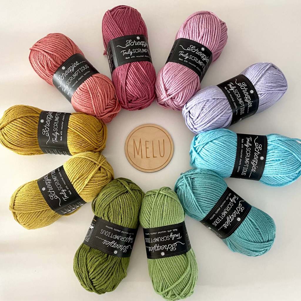 I have used ‘Truly Scrumptious’ yarn, this is a sustainable yarn with 50% Recycled Polyester (recycled plastic bottles) x 50% Acrylic fibre content, which is amazingly soft and feels cozy against your skin.