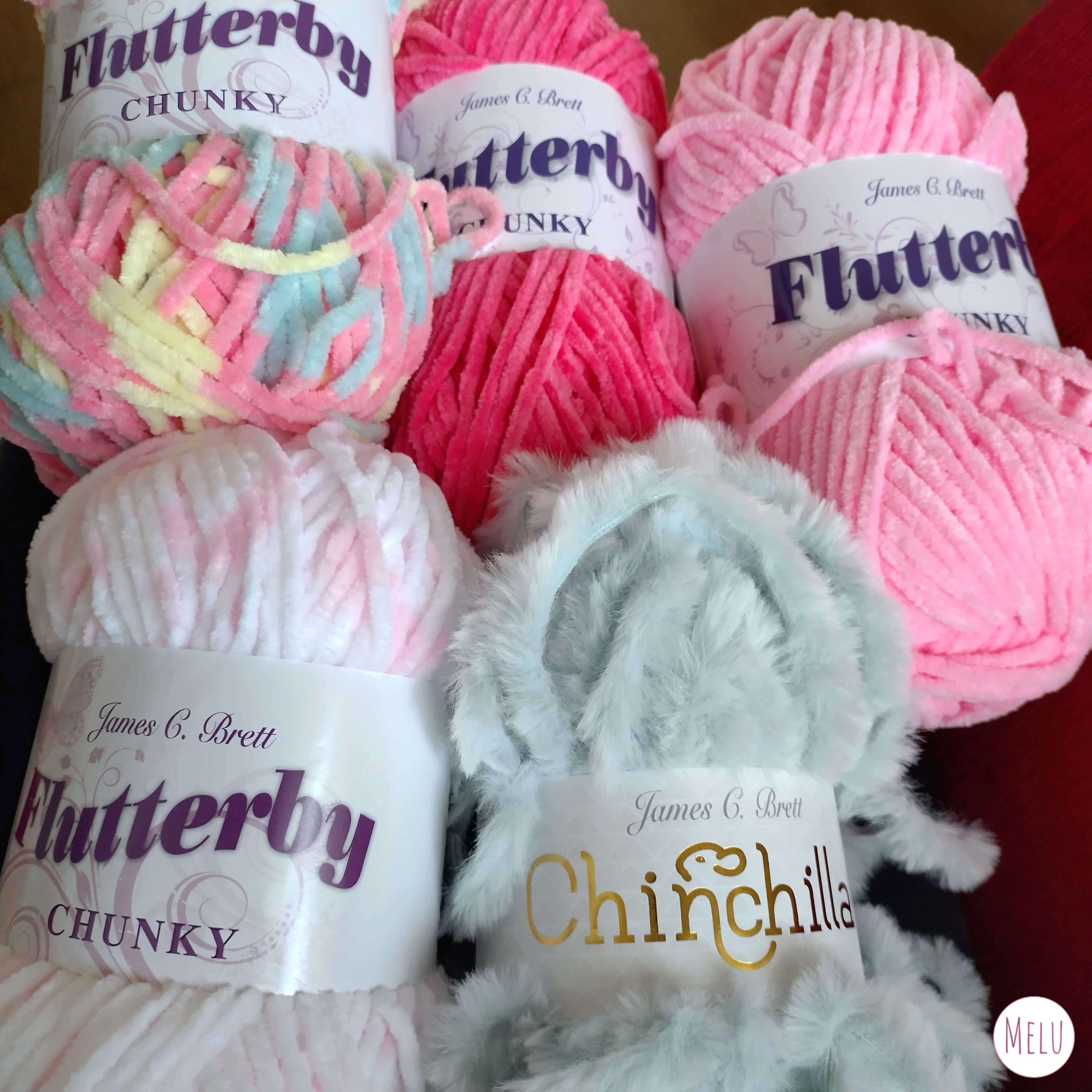Leanne @Hooked.by.leanne used James C Brett Flutterby Chunky for the cushion and James C Brett Chinchilla for the Faux Fur, approximately: