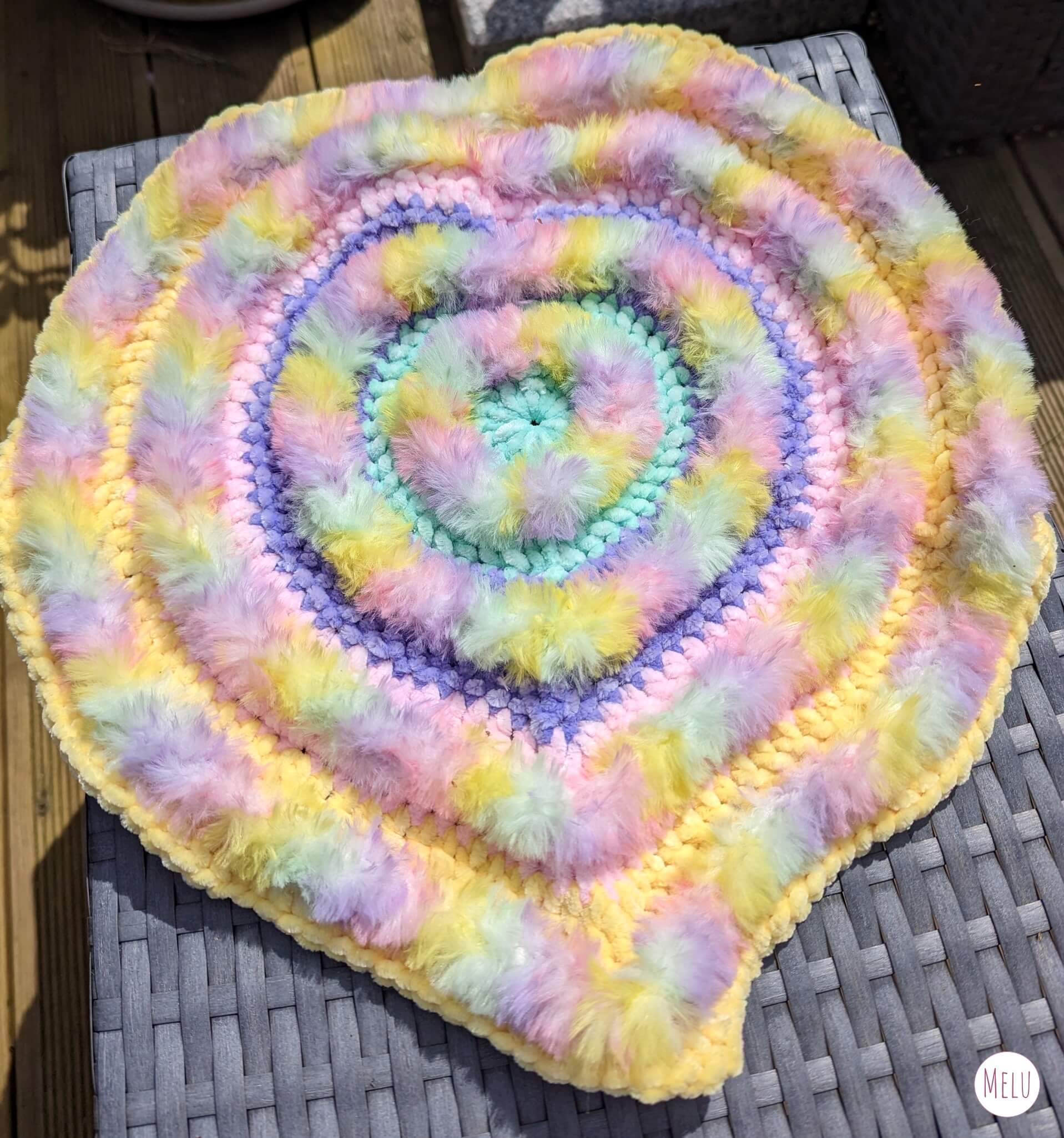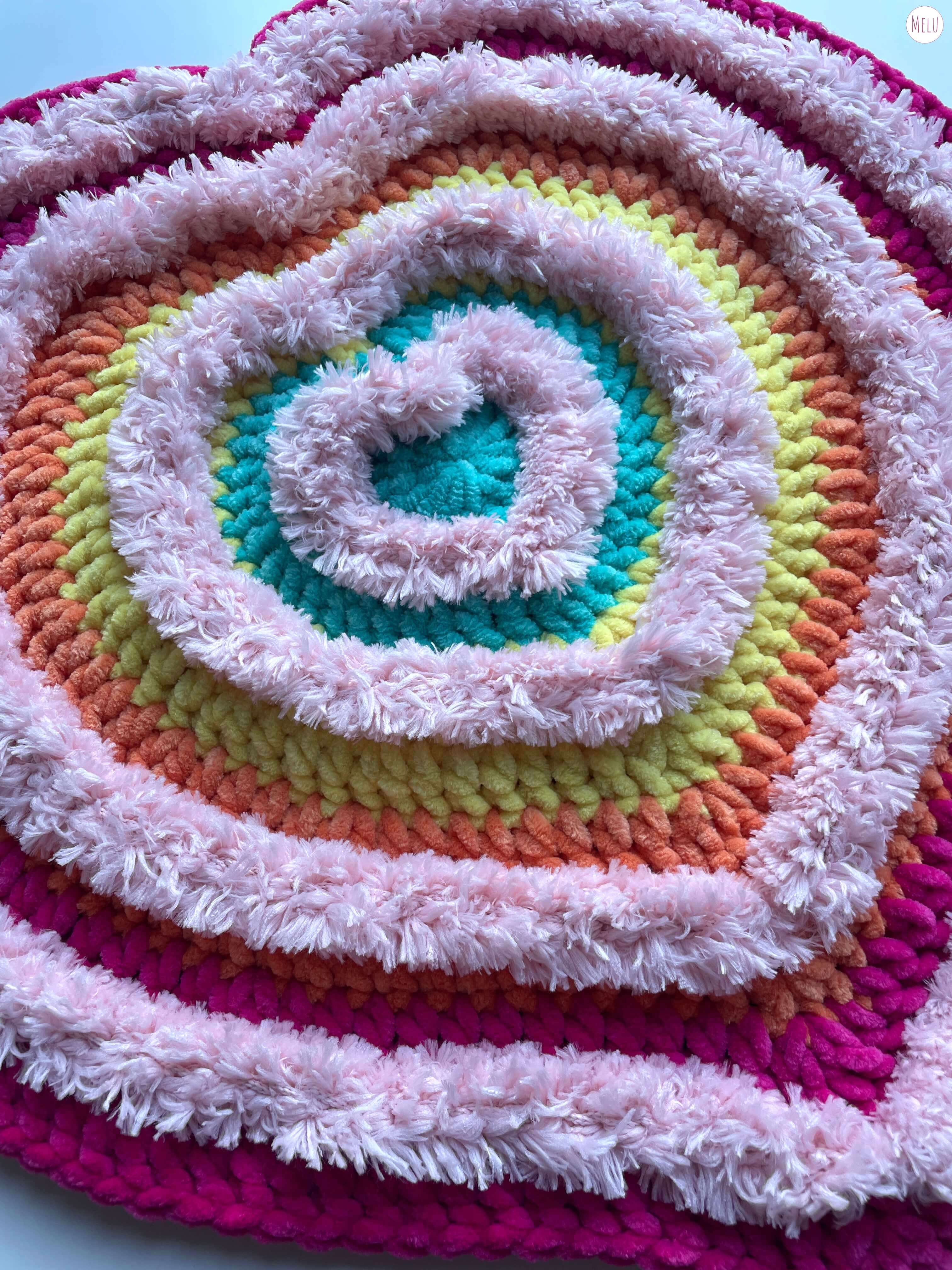 You will be surface crocheting into the ‘post’ of the stitches from the rounds that have been made using Honey Bunny yarn, which means that you will only do one round, but this will be shaped by the stitches that you will crochet into, giving a heart shaped round of fluff. Here is a short video on how to add the fluff!