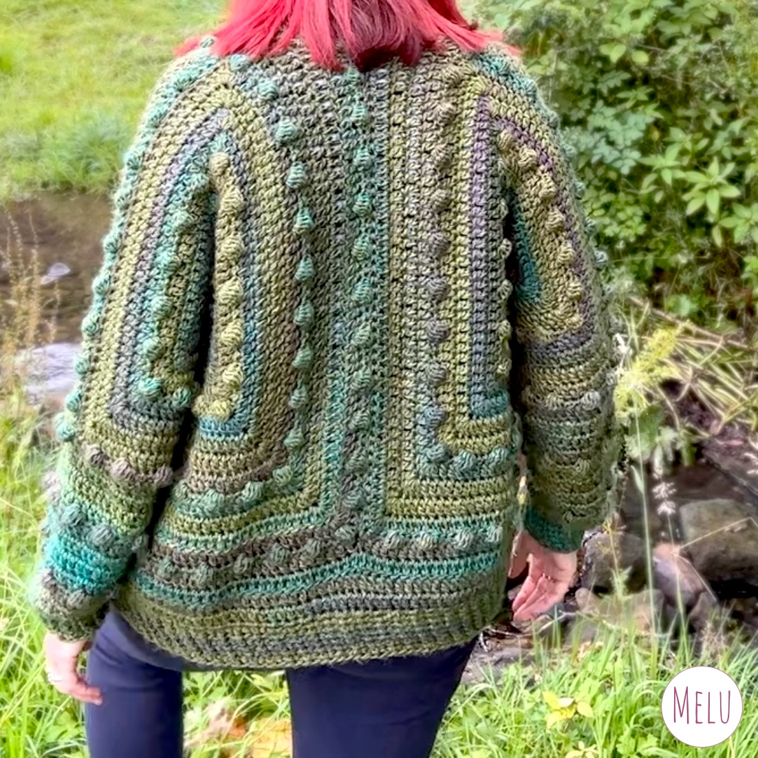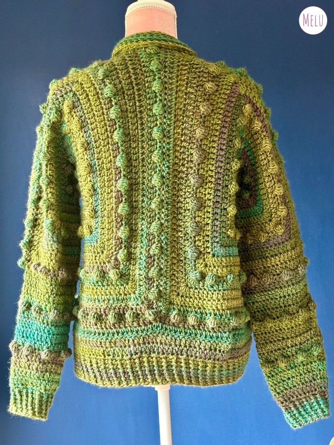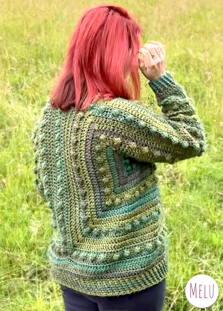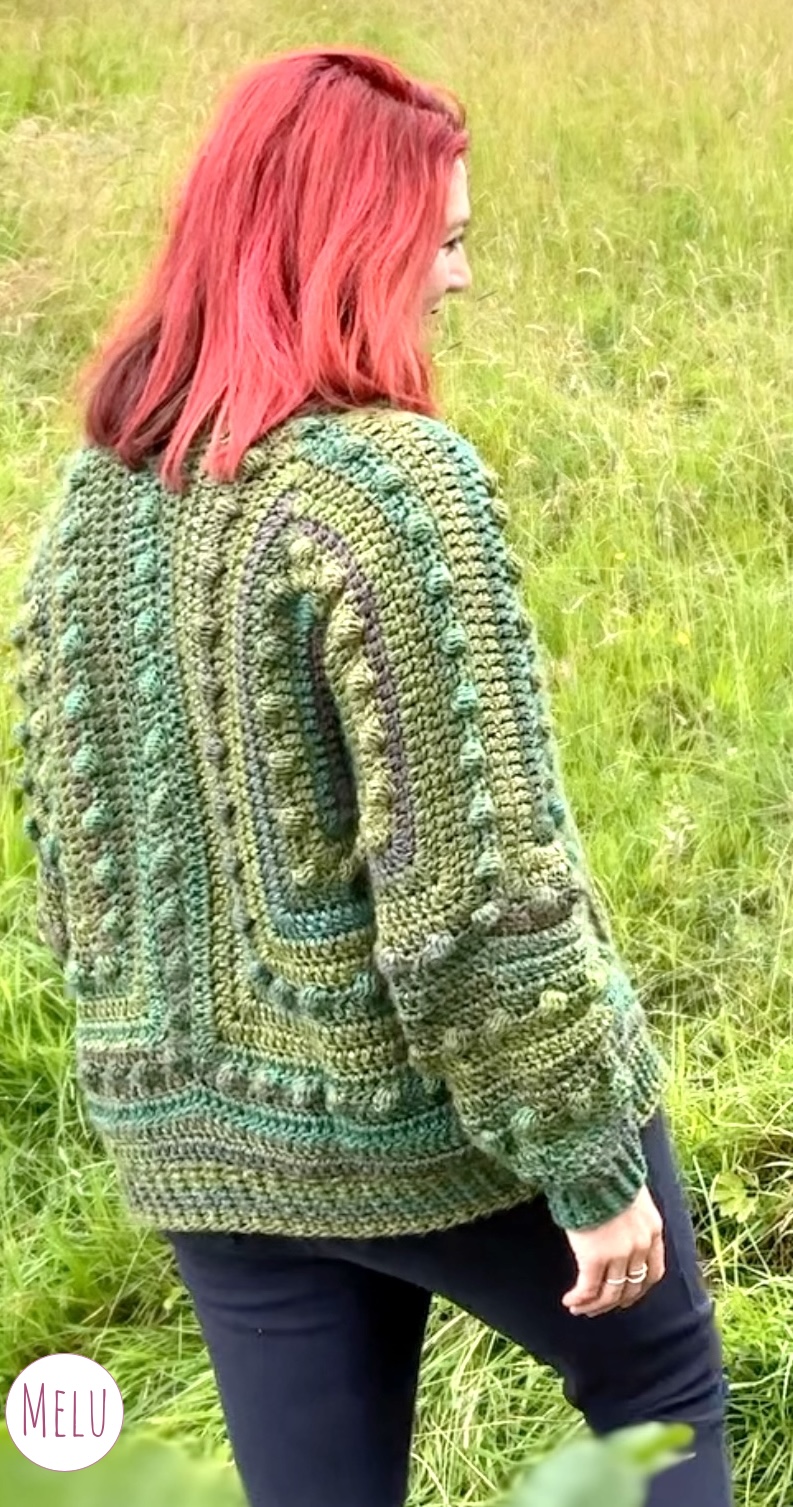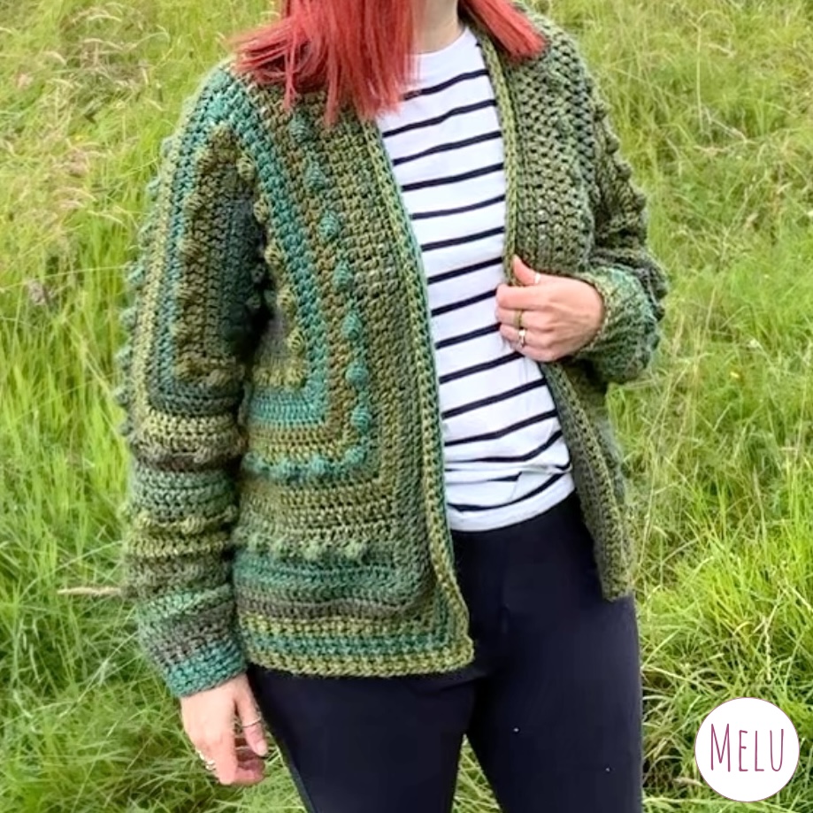 This hexi cardigan is crocheted using two hexagons joined together, the raised bumps are created with bobble stitch which is crocheted as you go. It has a ribbed edging to finish it off perfectly.