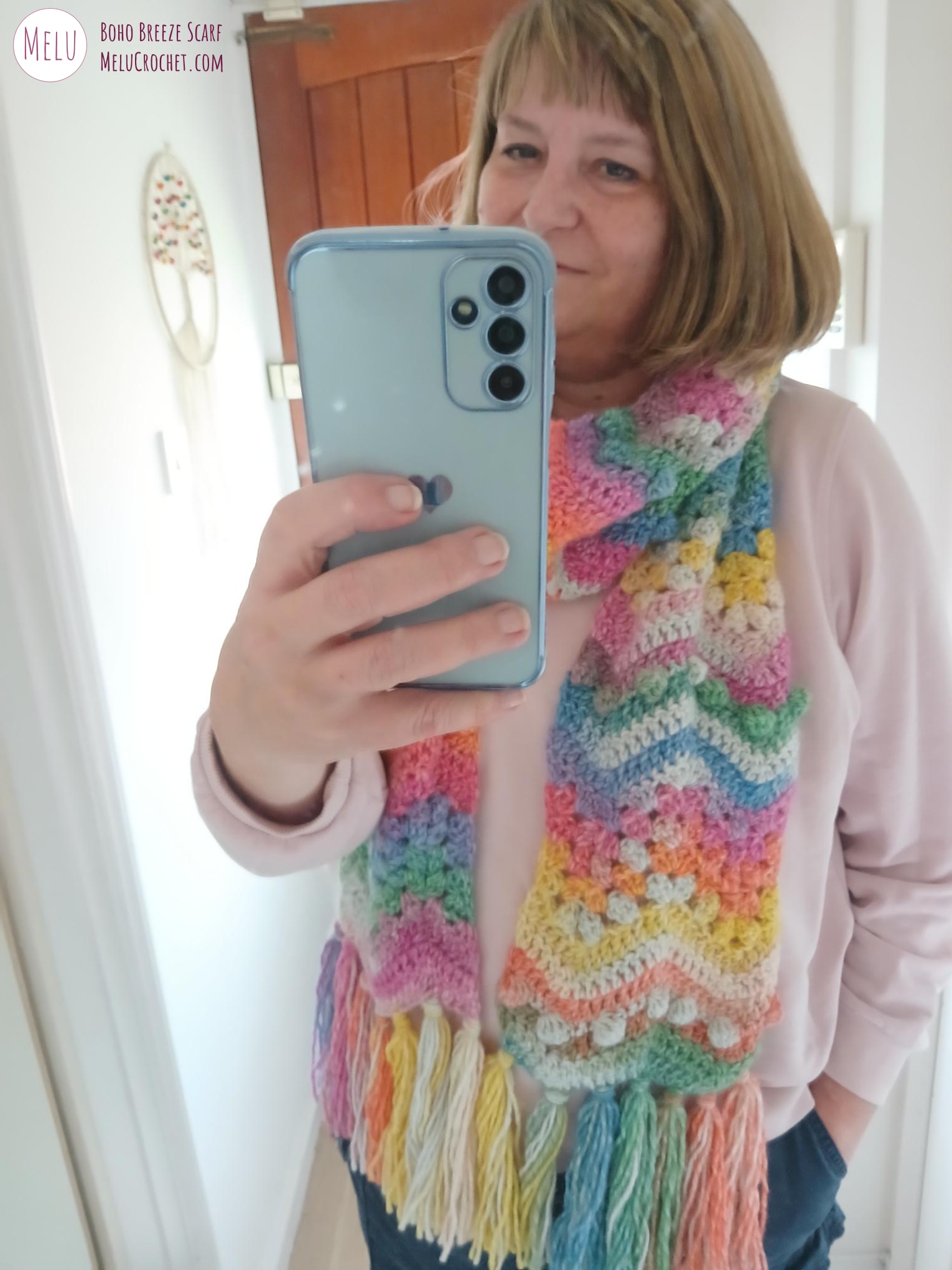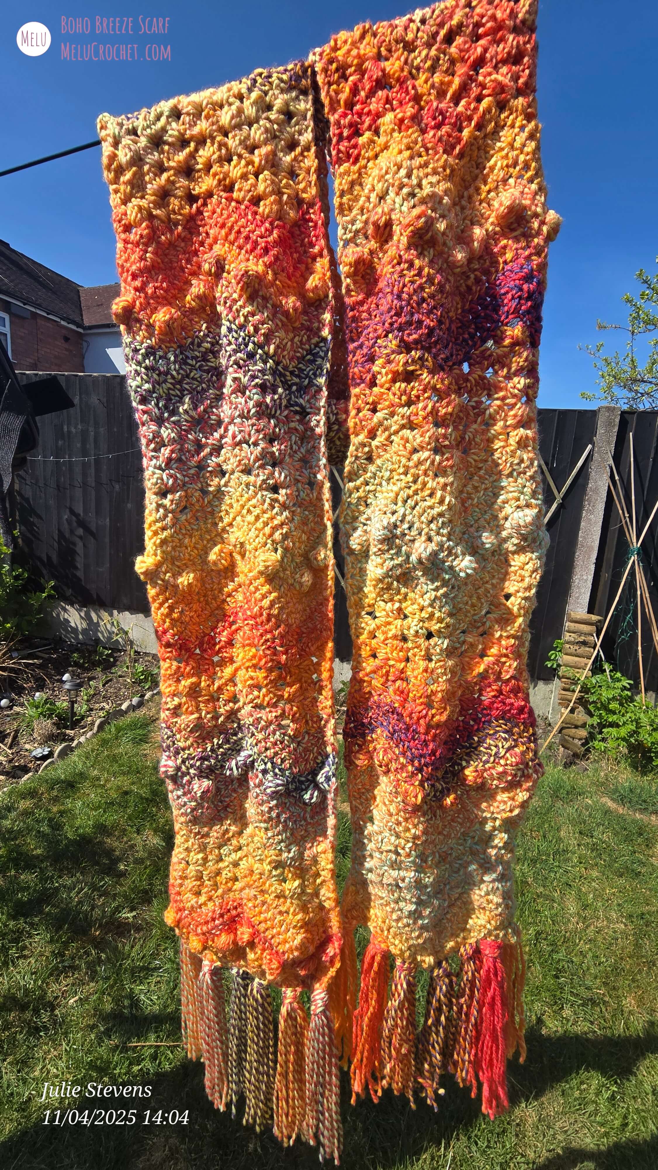 A huge thank you to my amazing testers below for thoroughly testing the Boho Breeze Scarf pattern and helping ensure the instructions, including the step-by-step photo tutorials and stitch chart are clear, easy to follow, and enjoyable to use! This intermediate-level pattern features wavy edges, bobble stitches, and granny clusters, and it’s been such a joy to see how each of you brought it to life with your unique colour choices and yarns. It’s incredible how different they all look! Which one is your favourite? 😊