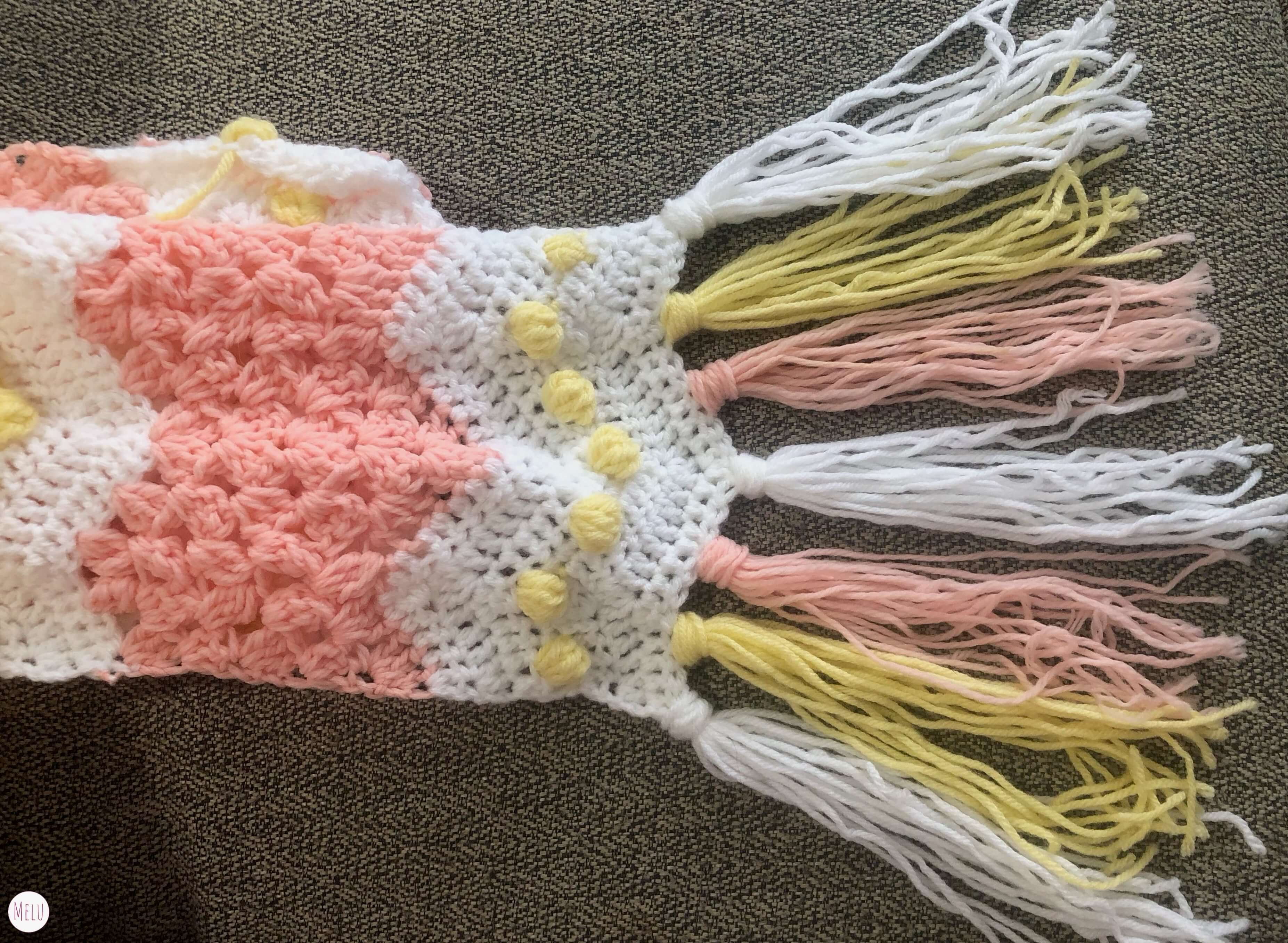 Sara @saragutierrez190 used Big Twist in white and yellow, and some thrifted pink yarn that didn’t have a label, but was a similar weight!