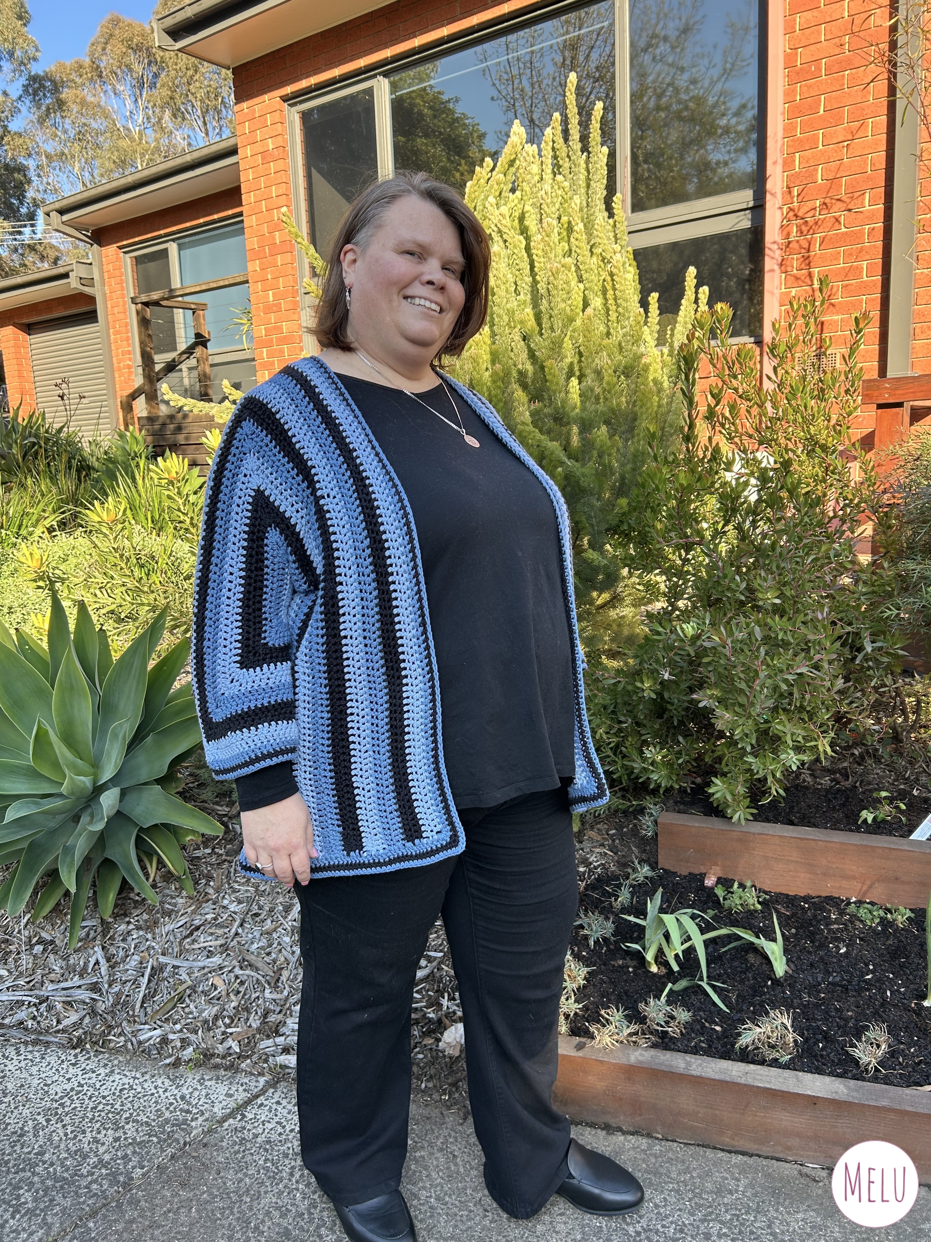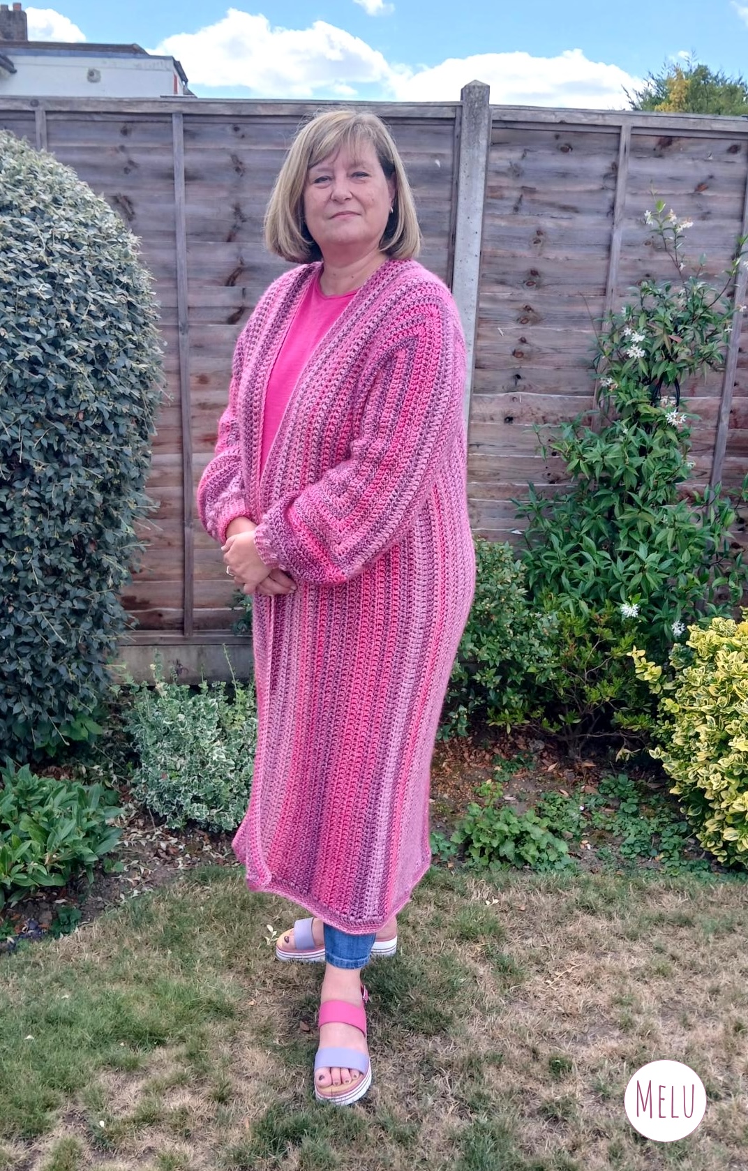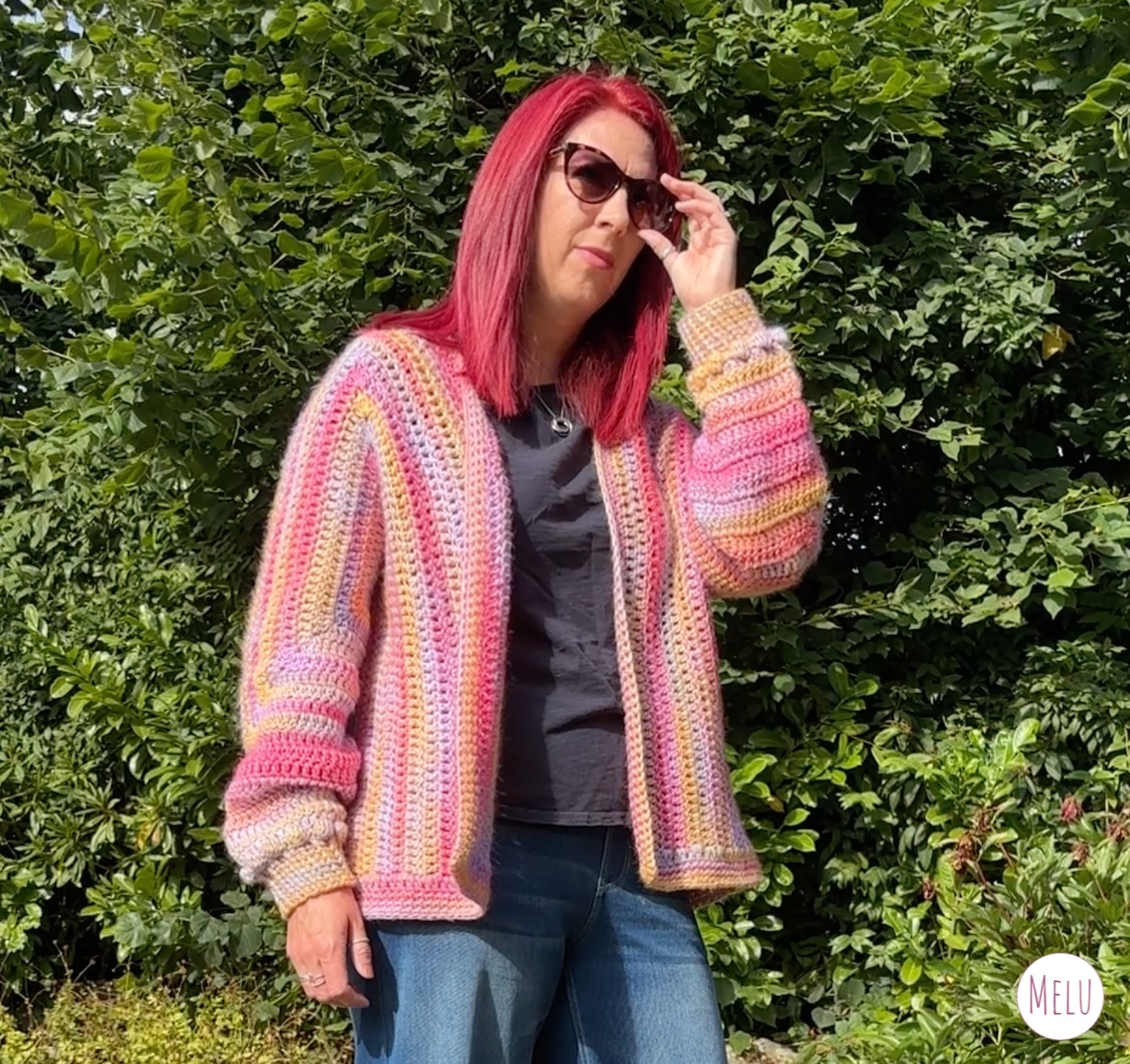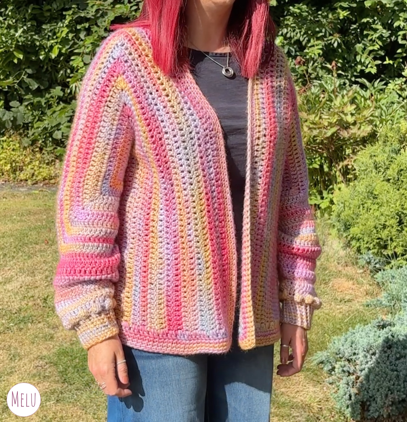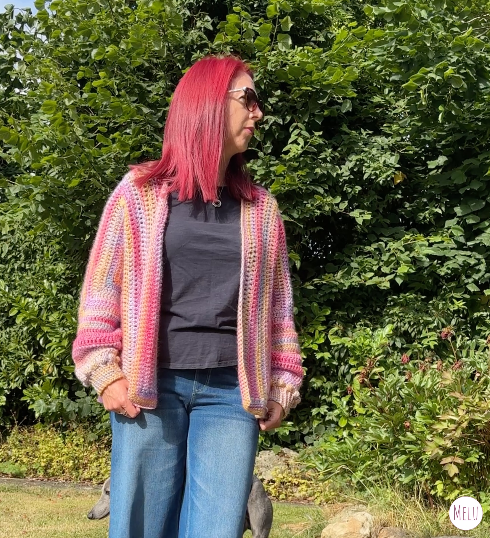 I wanted to design a cardi that felt approachable for everyone, whether you’ve made lots of garments or are picking up your hook for your very first one. The elongated hexagon construction keeps things simple while giving you plenty of room to customise, from cropped to floor-length, in your favourite yarns and colours.