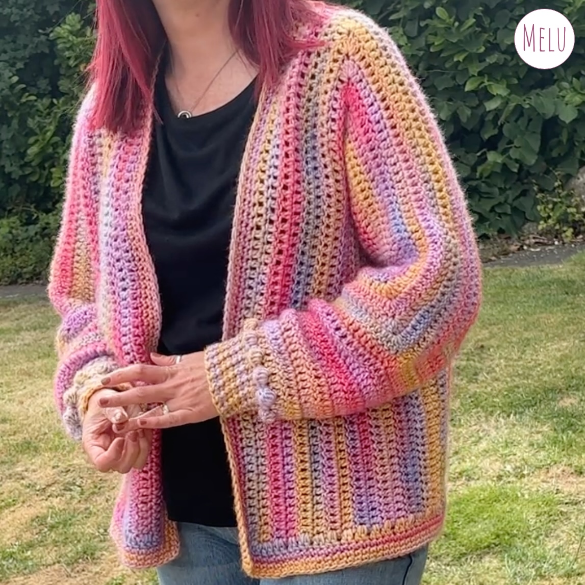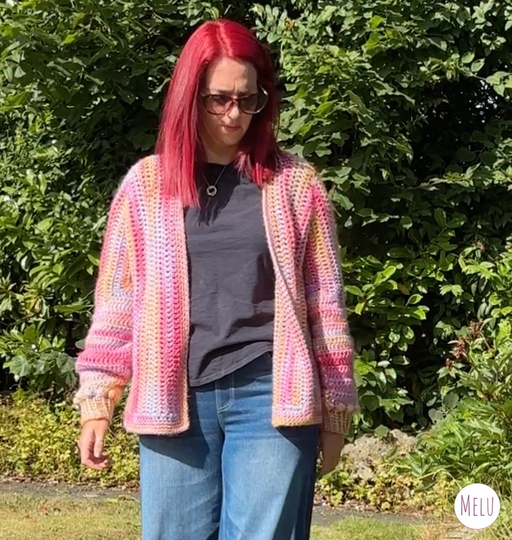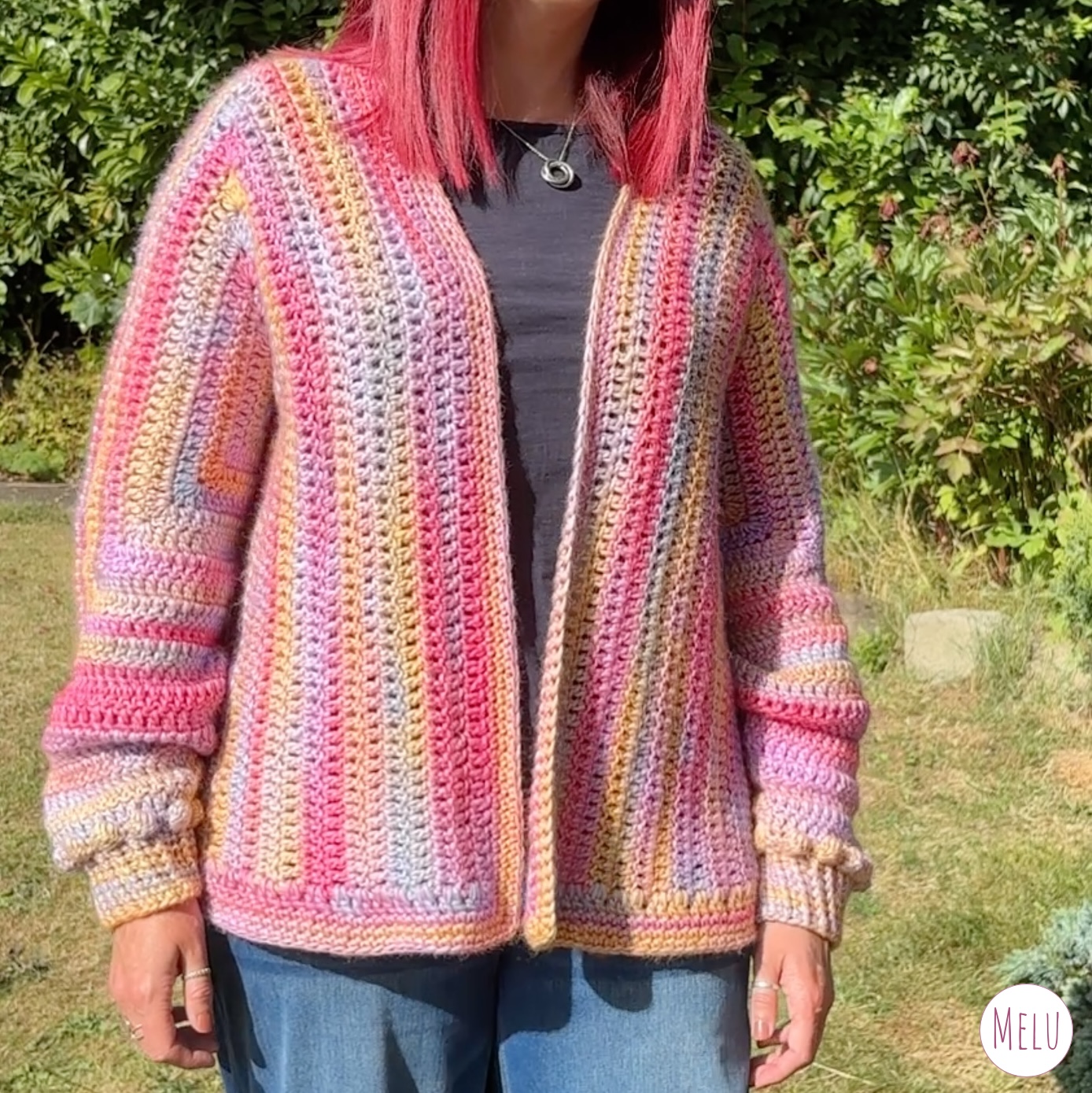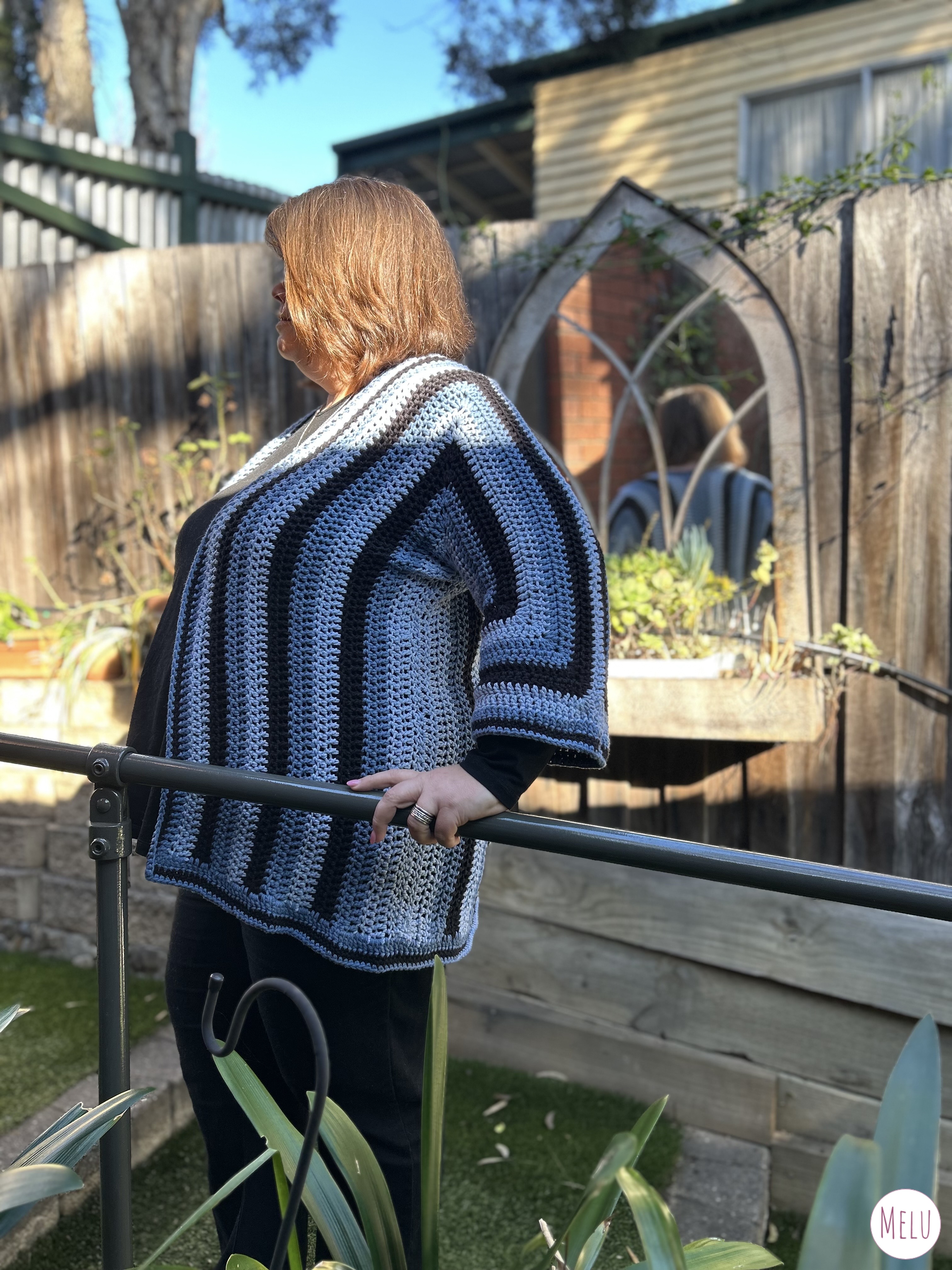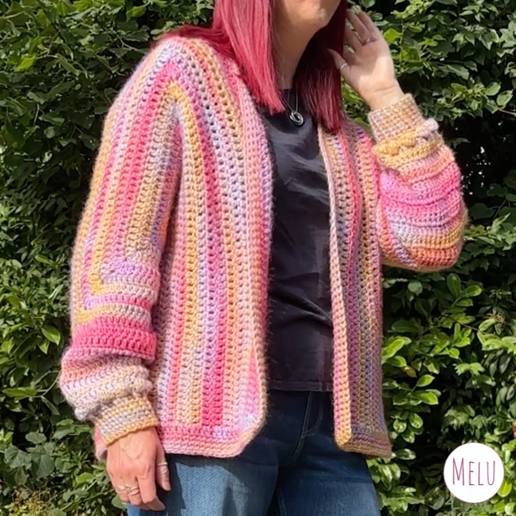 I wanted to design a cardi that felt approachable for everyone, whether you’ve made lots of garments or are picking up your hook for your very first one. The elongated hexagon construction keeps things simple while giving you plenty of room to customise, from cropped to floor-length, in your favourite yarns and colours.