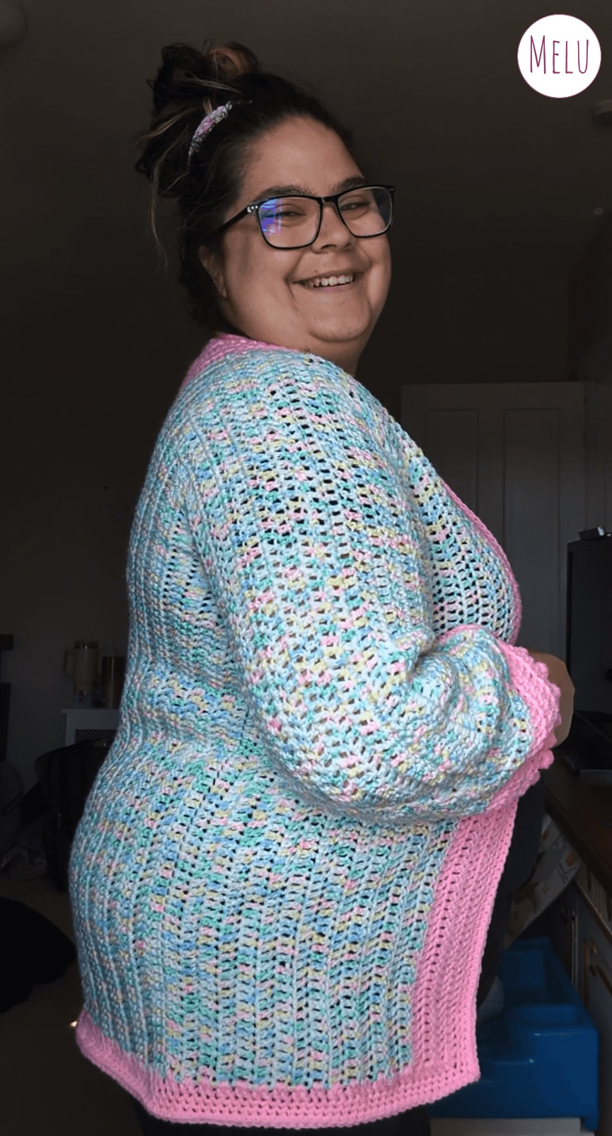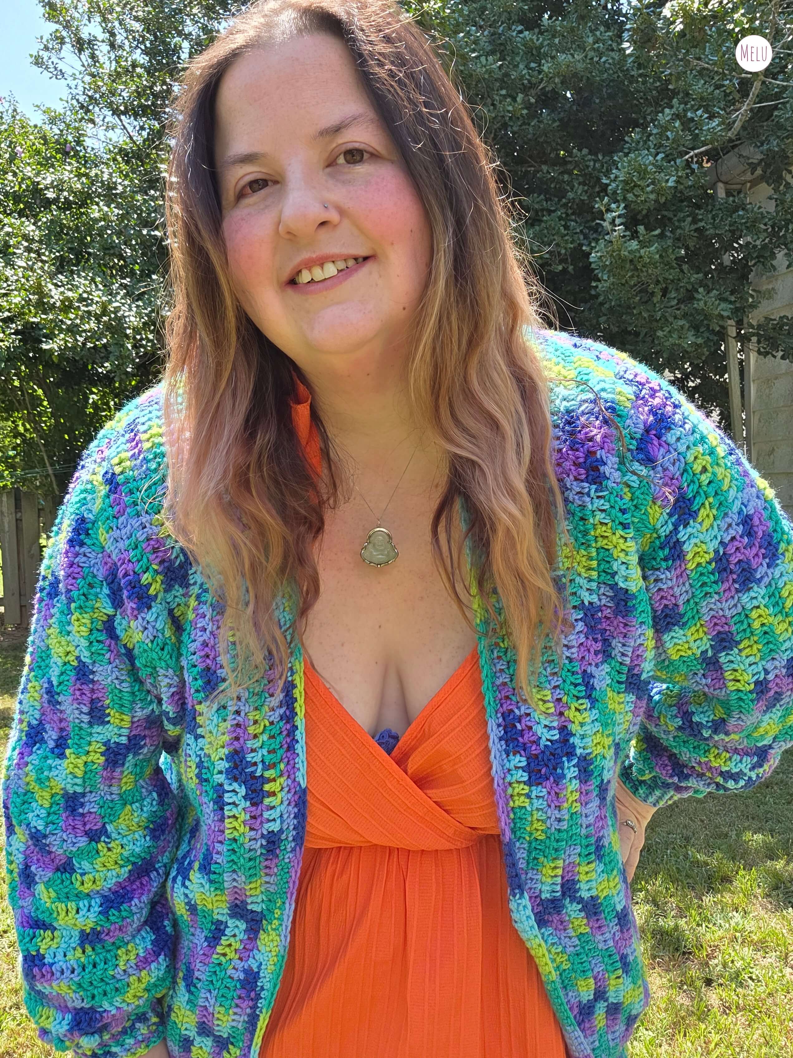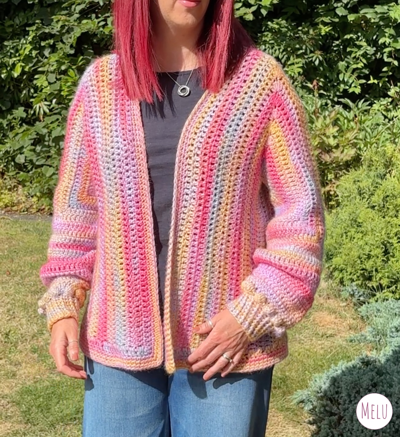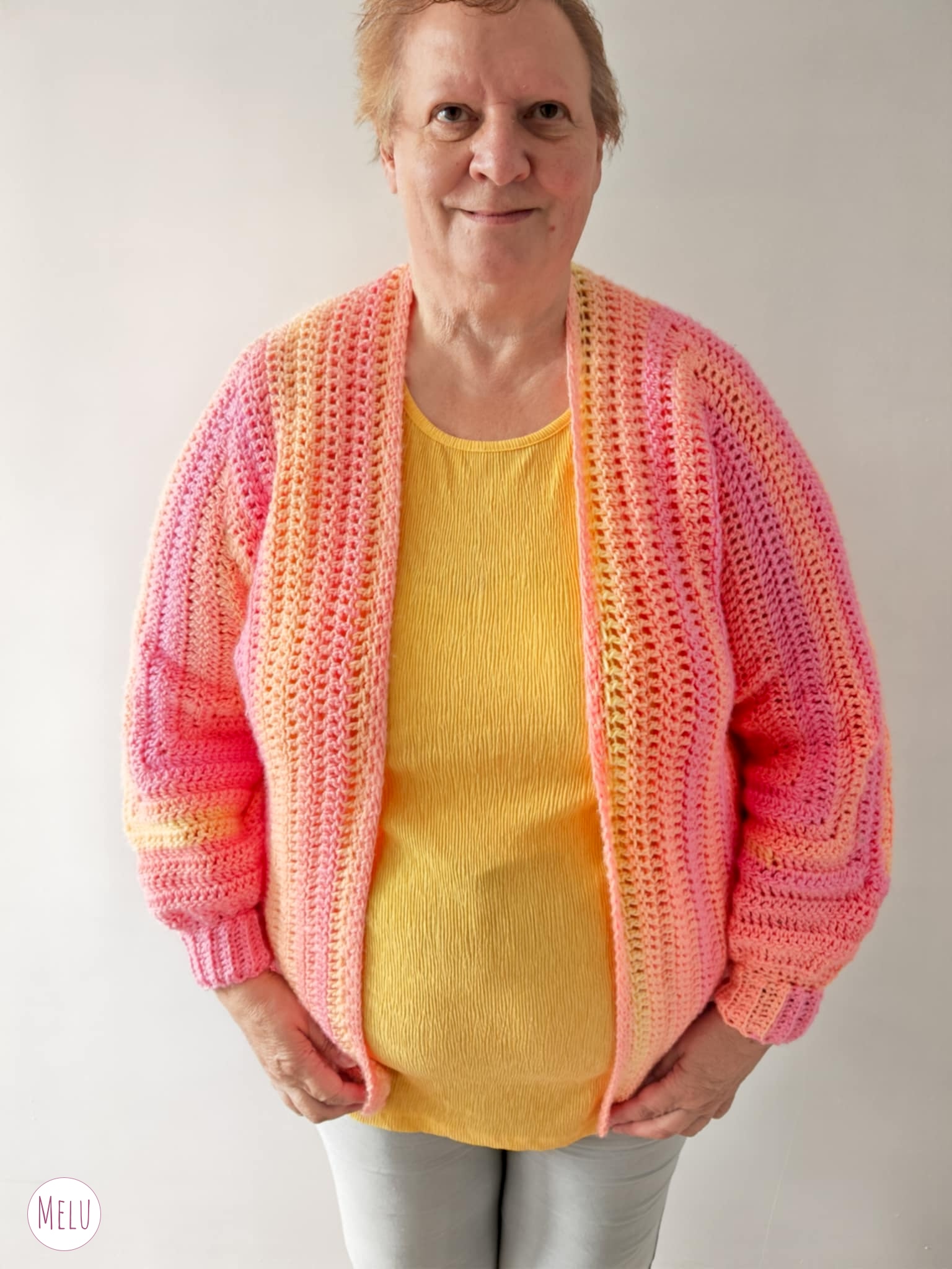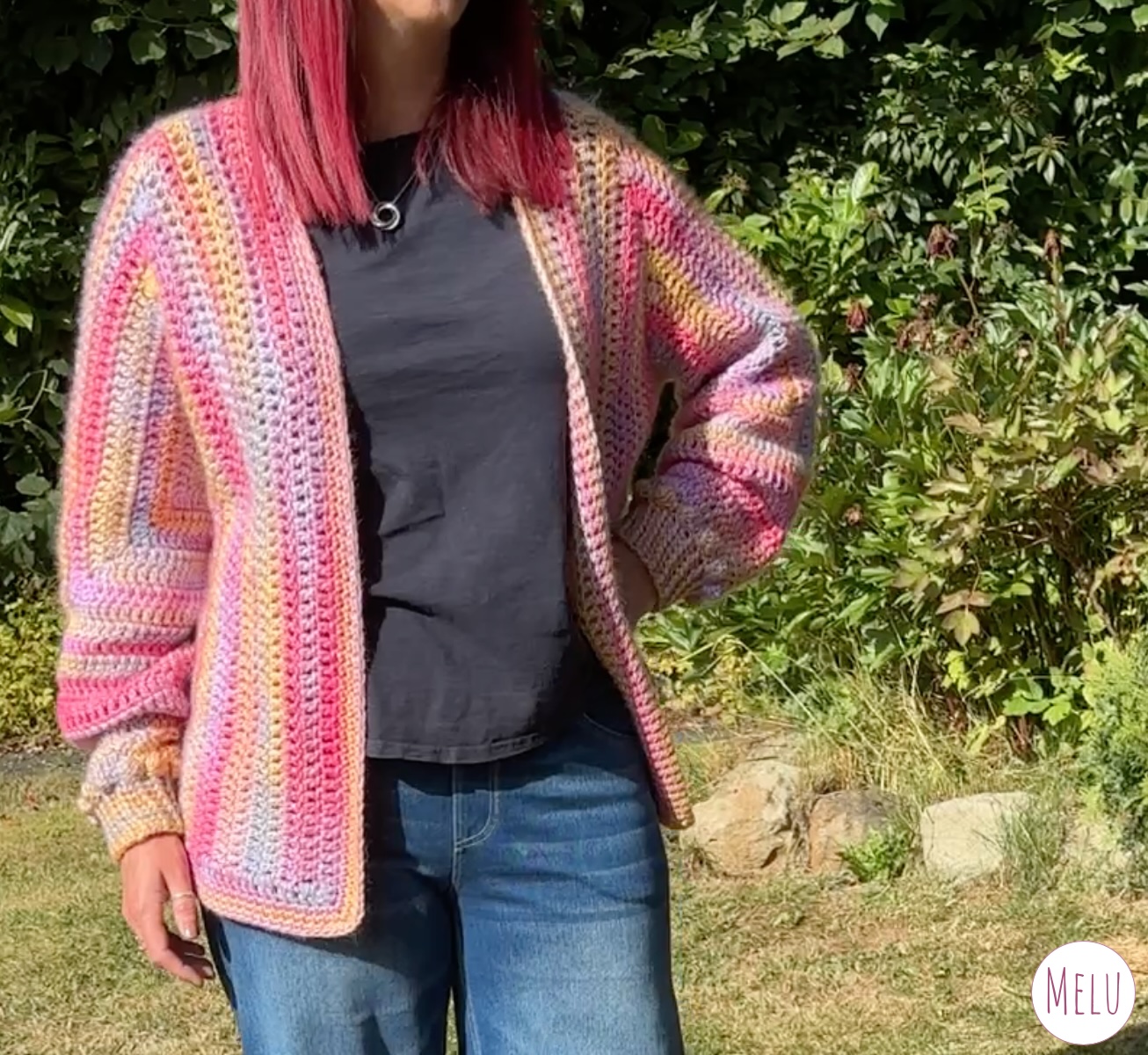 I wanted to design a cardi that felt approachable for everyone, whether you’ve made lots of garments or are picking up your hook for your very first one. The elongated hexagon construction keeps things simple while giving you plenty of room to customise, from cropped to floor-length, in your favourite yarns and colours.