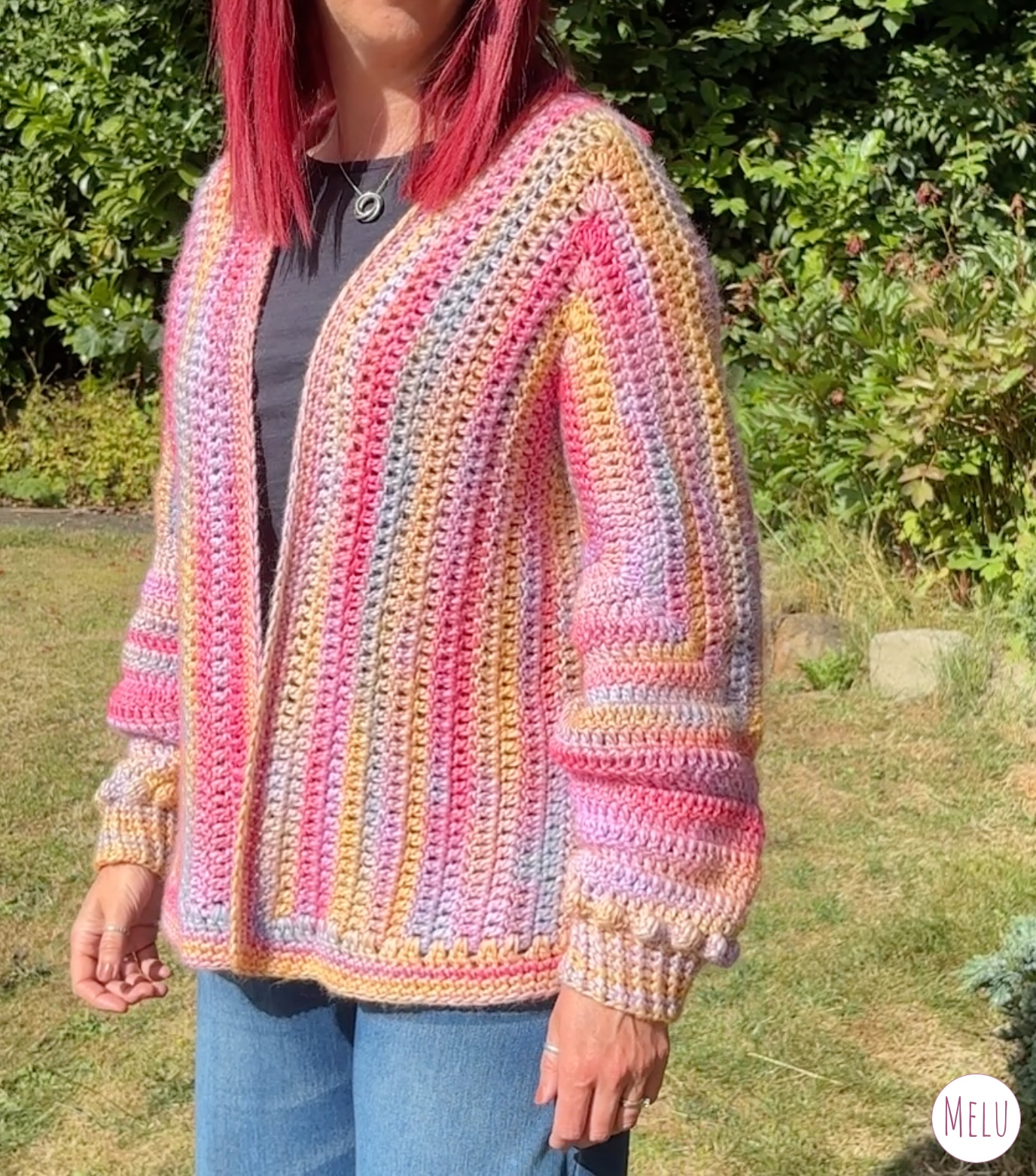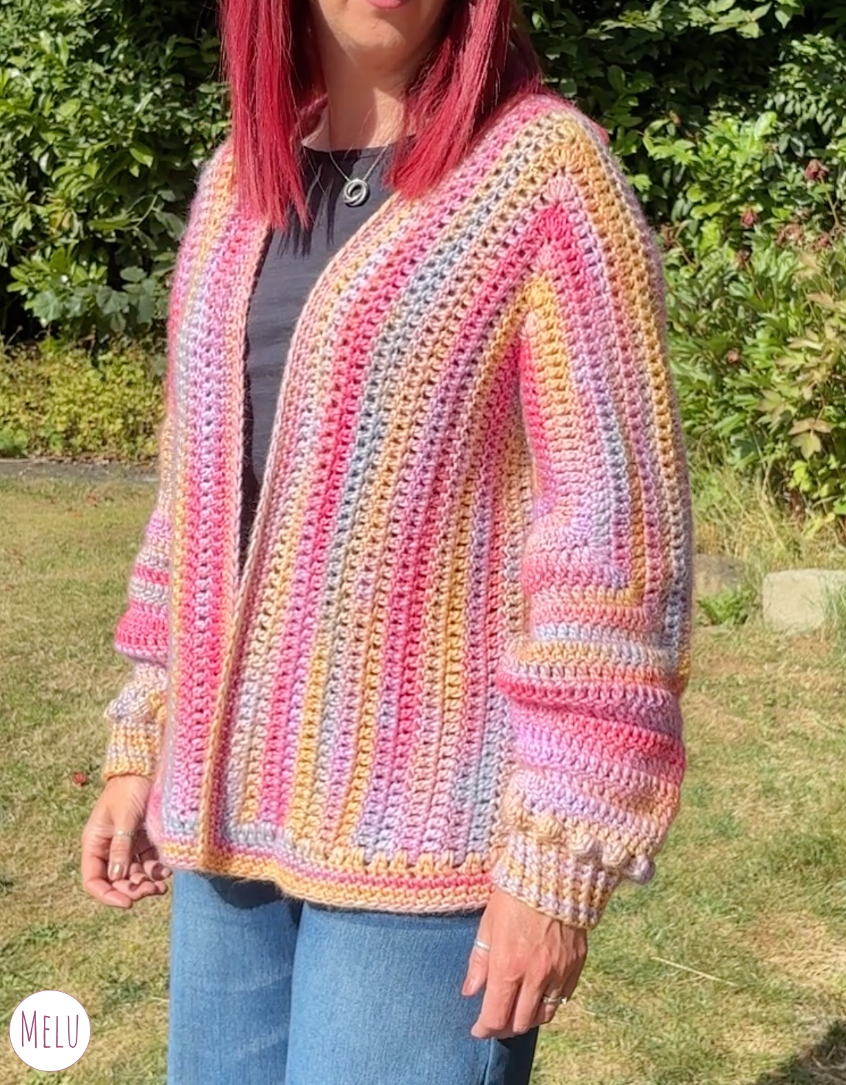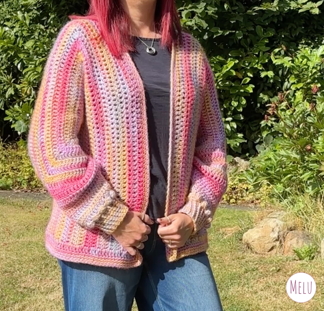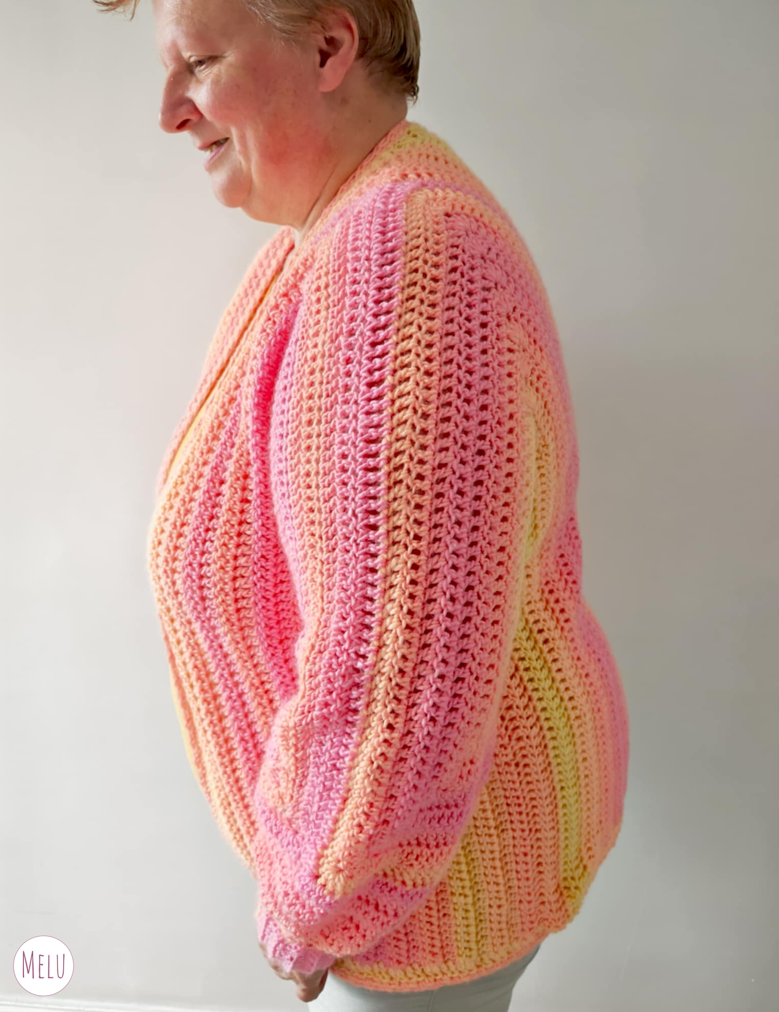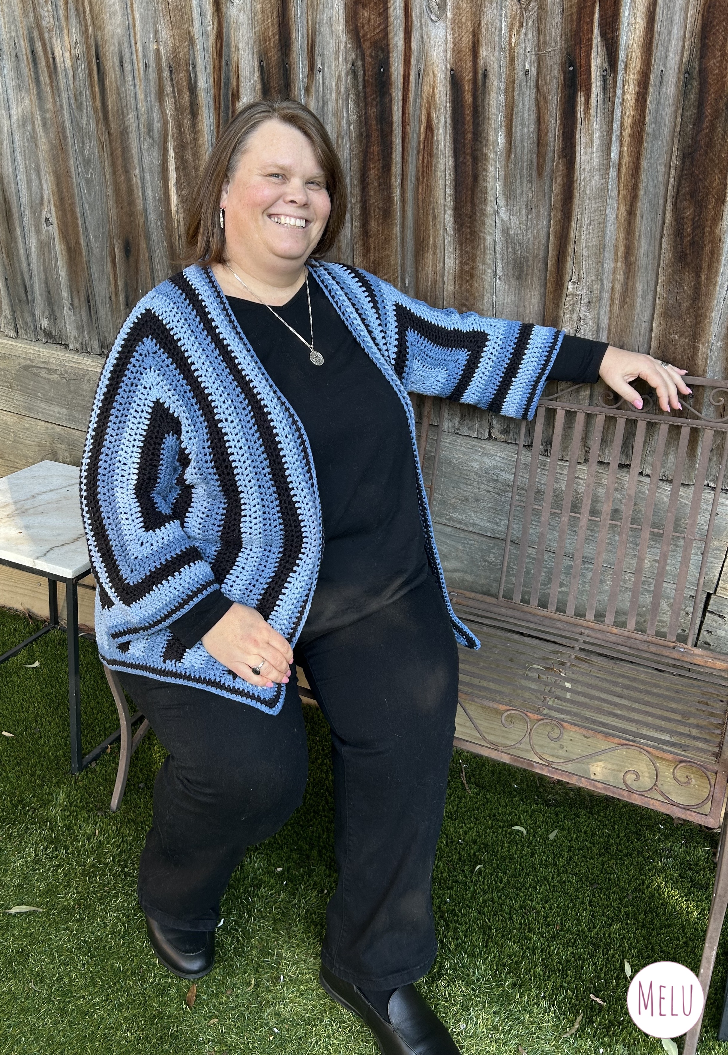 I wanted to design a cardi that felt approachable for everyone, whether you’ve made lots of garments or are picking up your hook for your very first one. The elongated hexagon construction keeps things simple while giving you plenty of room to customise, from cropped to floor-length, in your favourite yarns and colours.