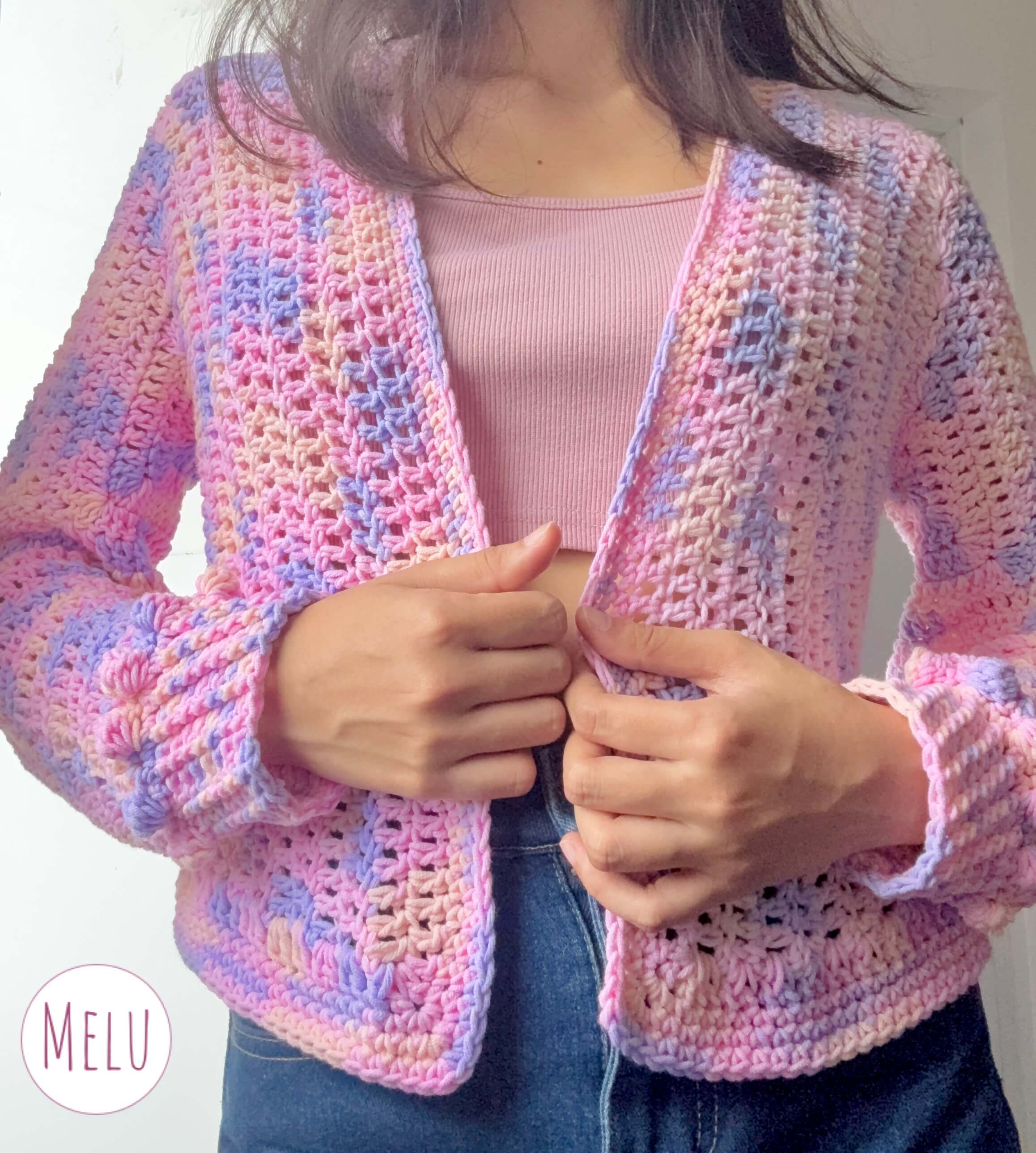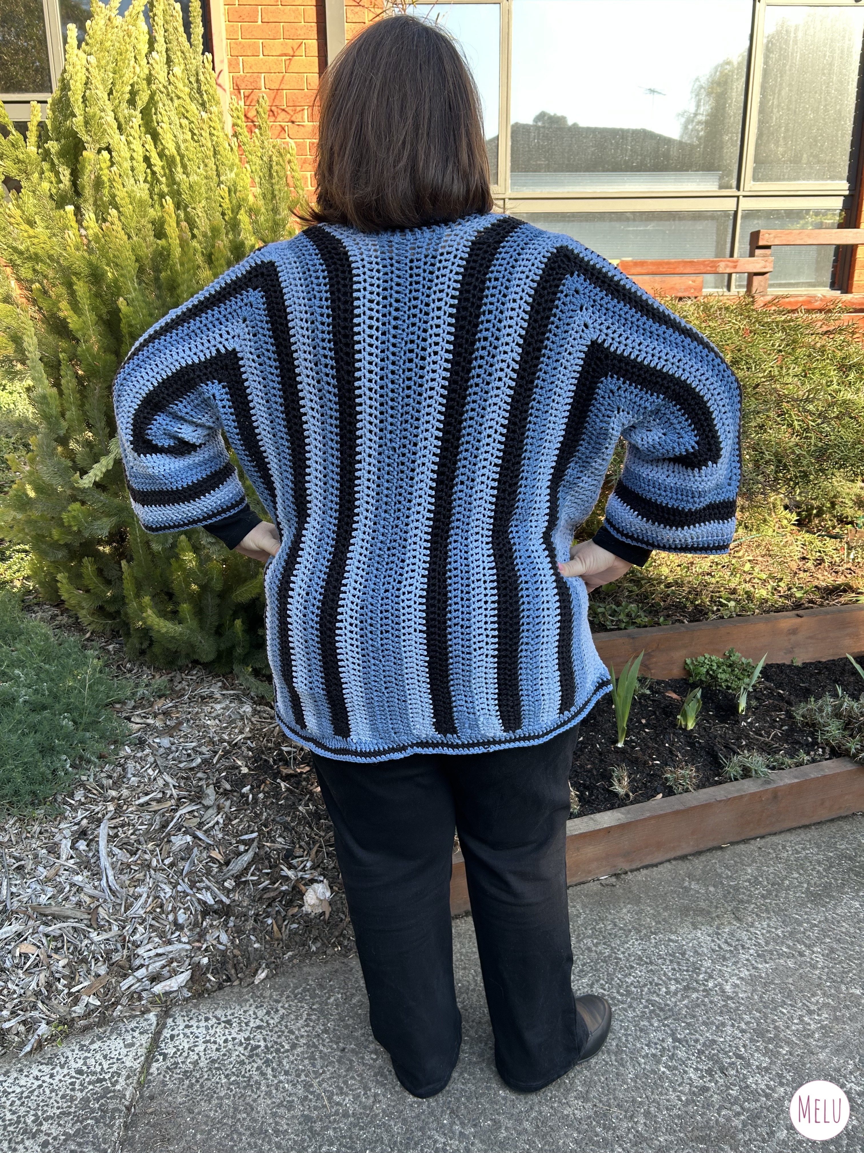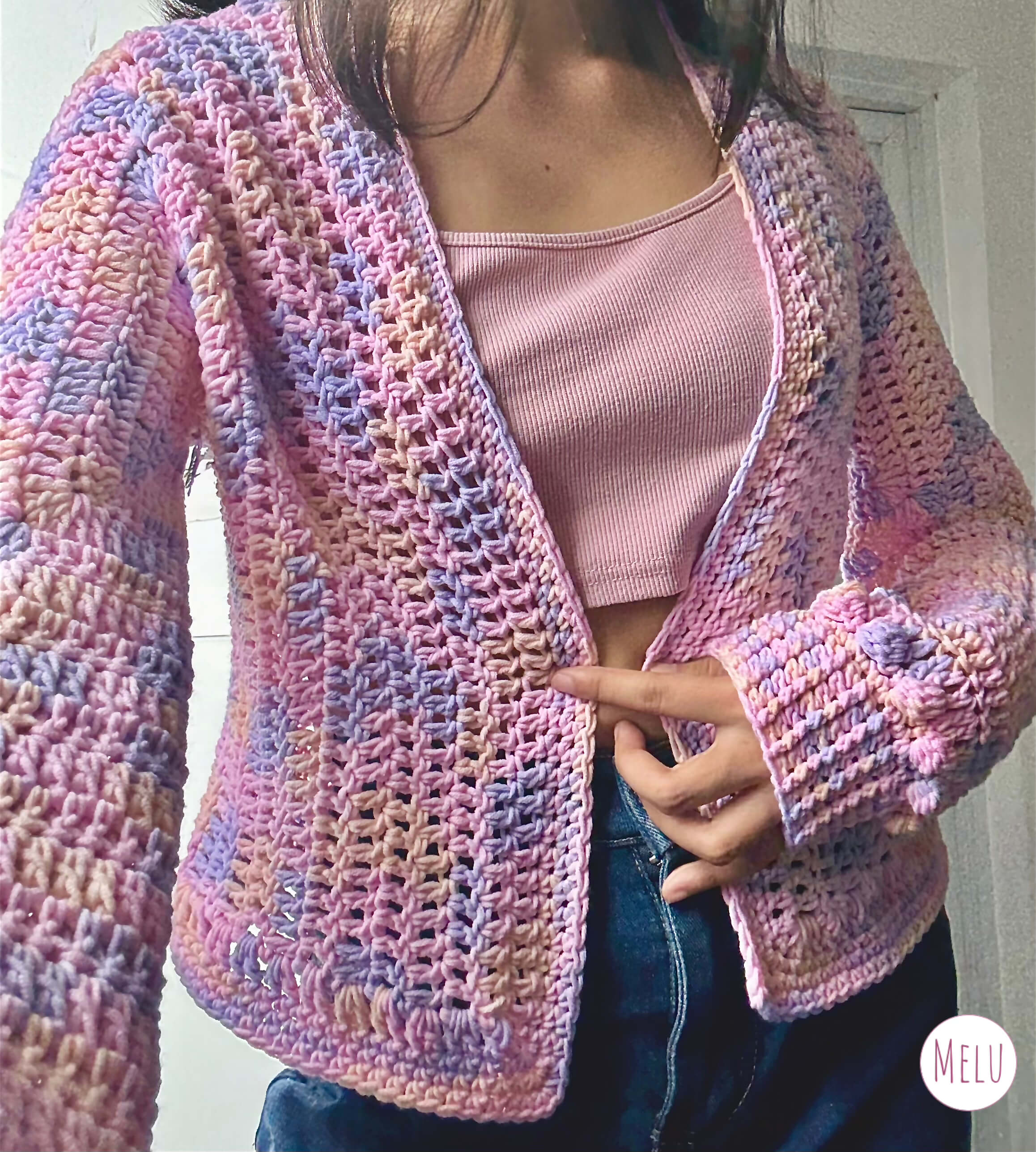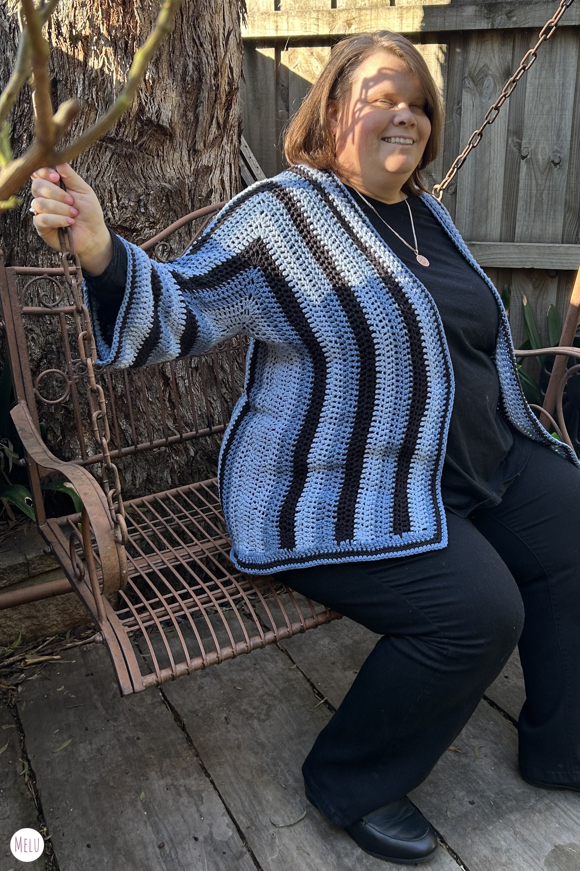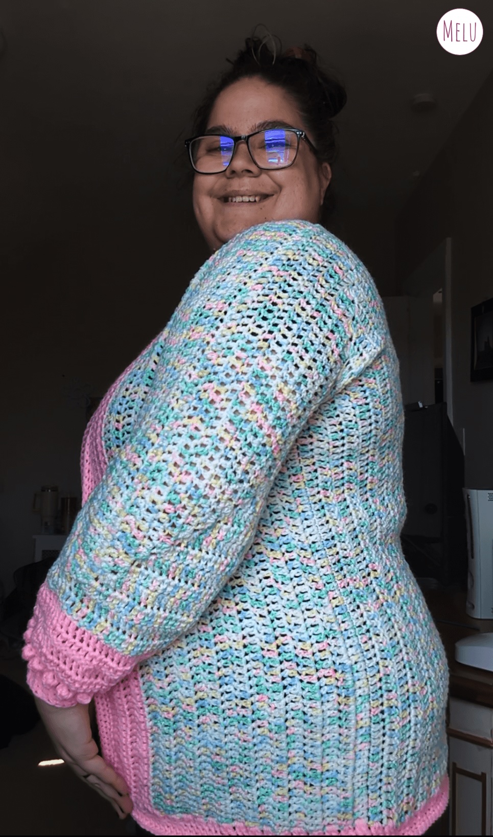 I wanted to design a cardi that felt approachable for everyone, whether you’ve made lots of garments or are picking up your hook for your very first one. The elongated hexagon construction keeps things simple while giving you plenty of room to customise, from cropped to floor-length, in your favourite yarns and colours.