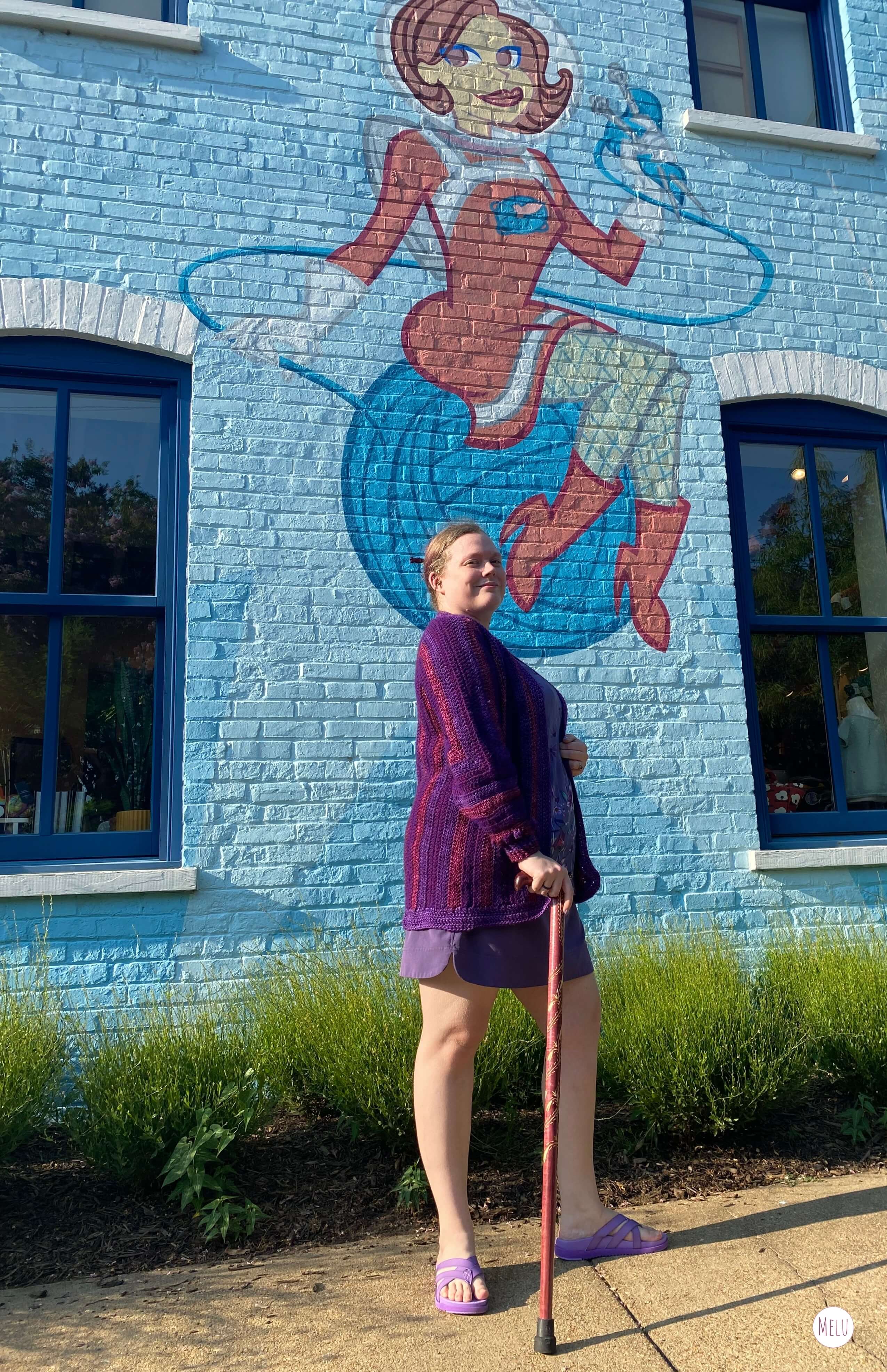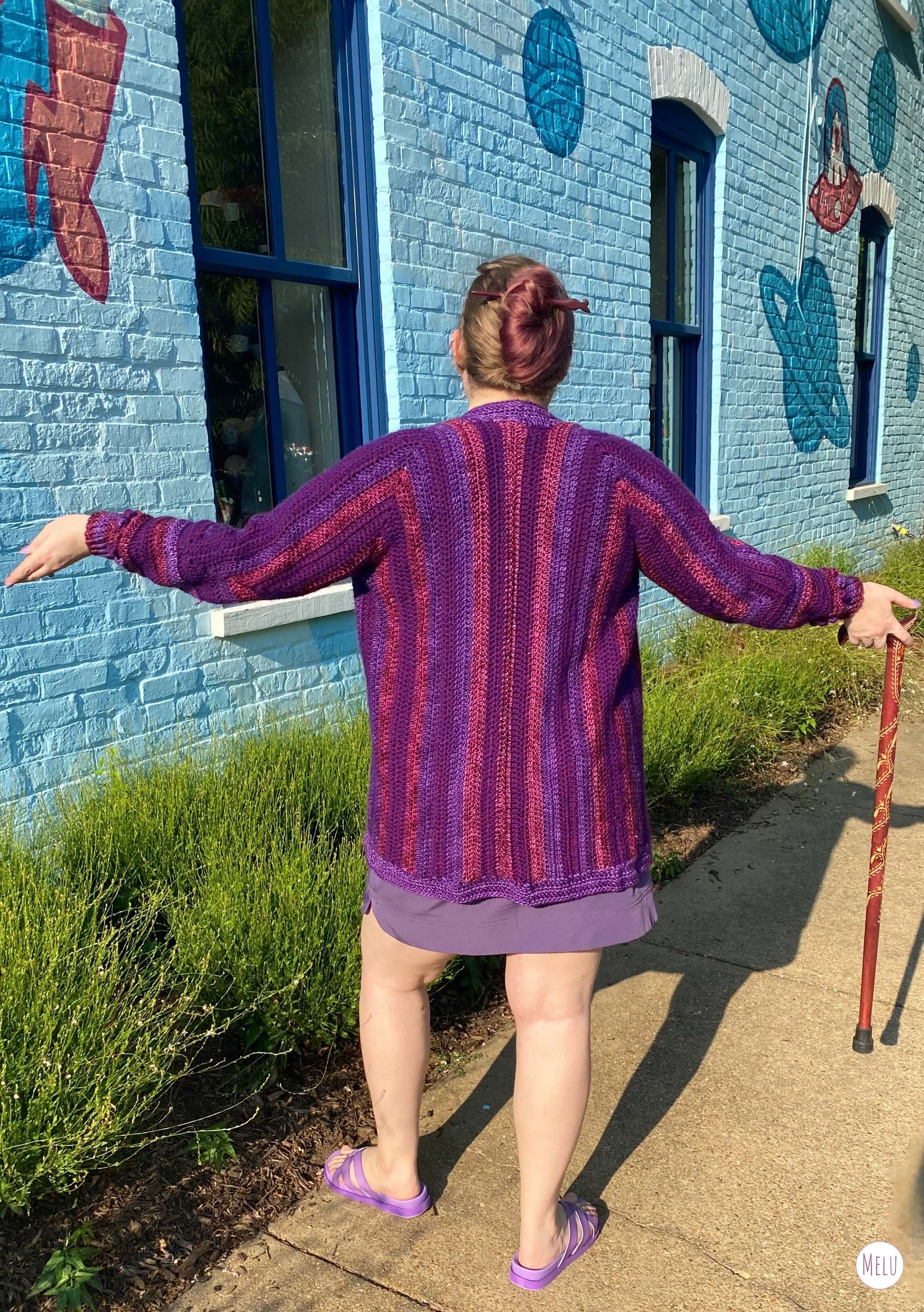 Beth @dela.bunny made size XL/2X and length D using K&C superwash merino wool hand dyed (the two brighter colors) in purple coleus flower & plum jam (RIP JOANN), “Peruvian Baby Alpaca” from Temu in sauce purple.