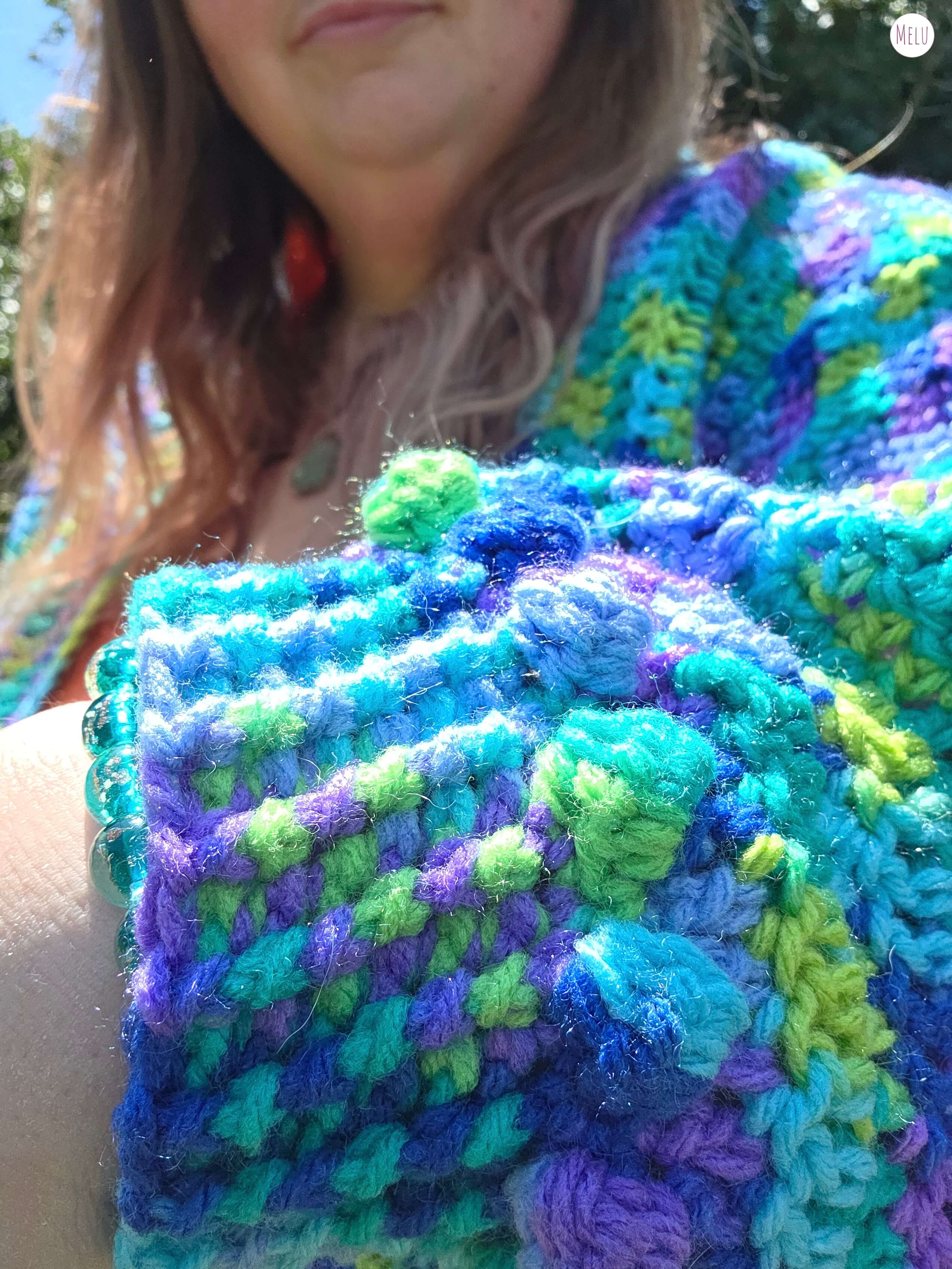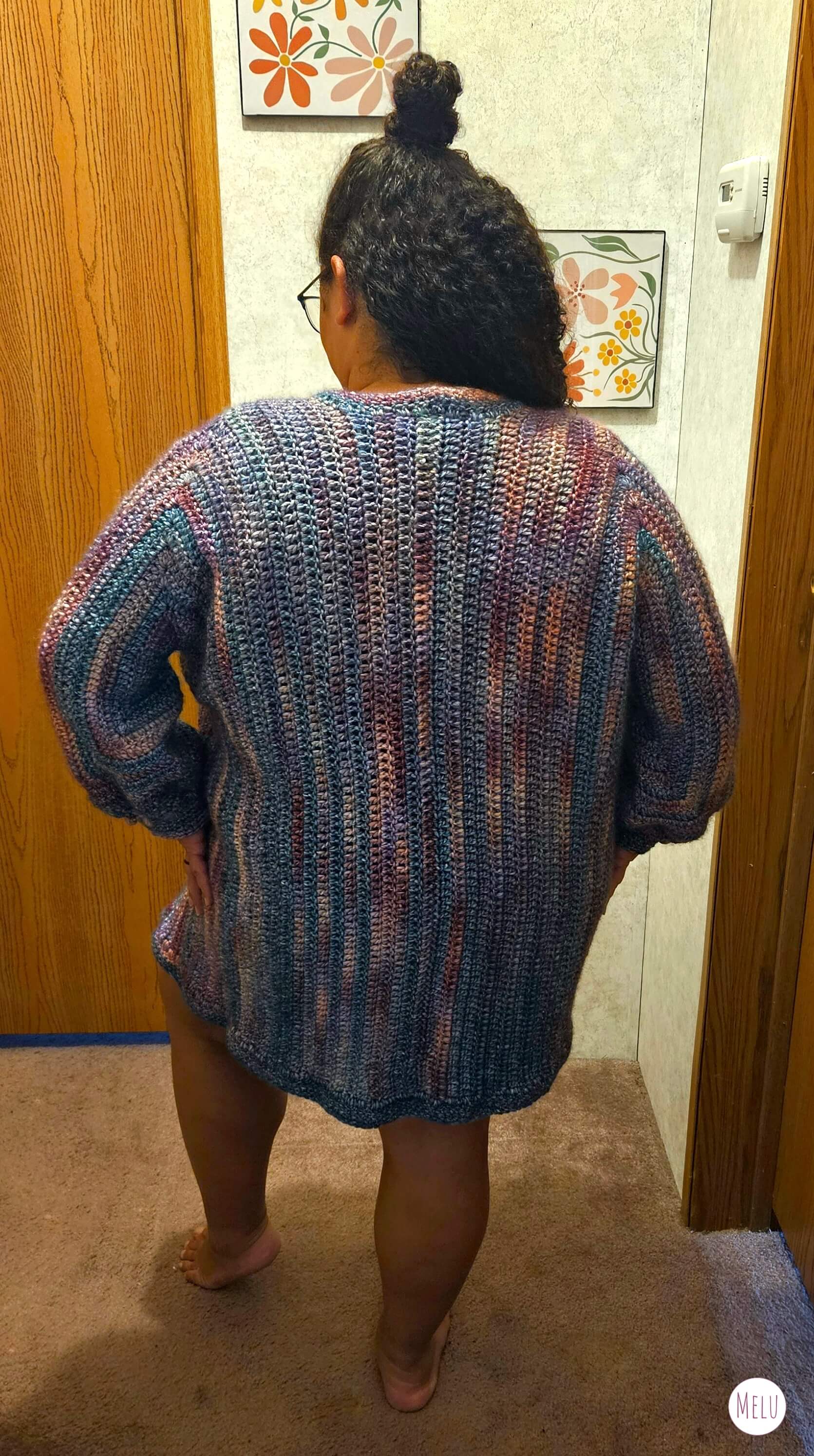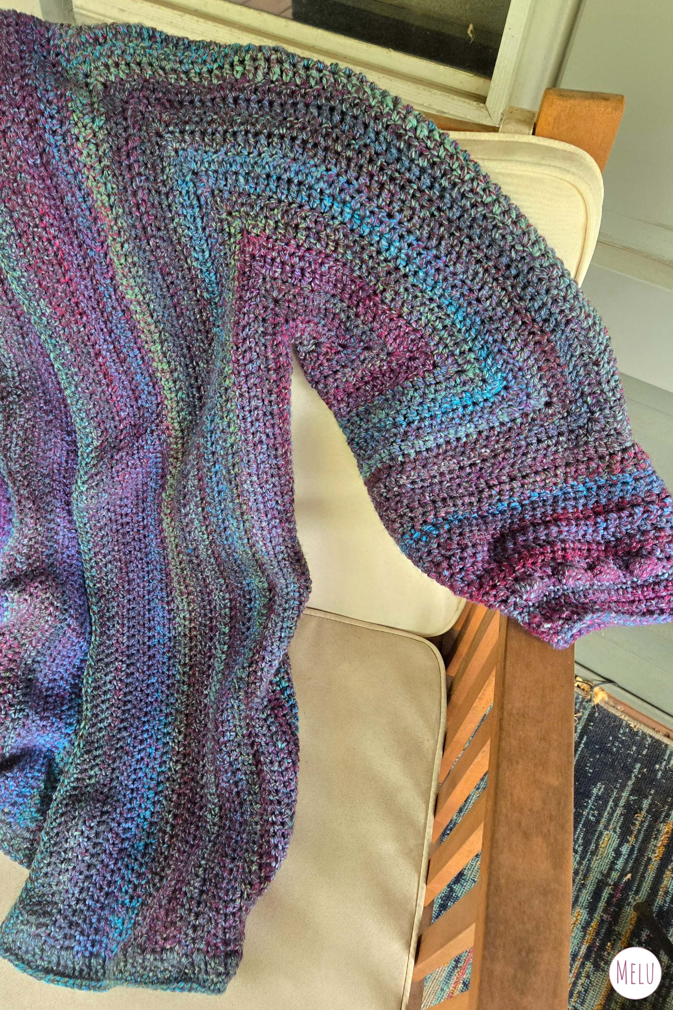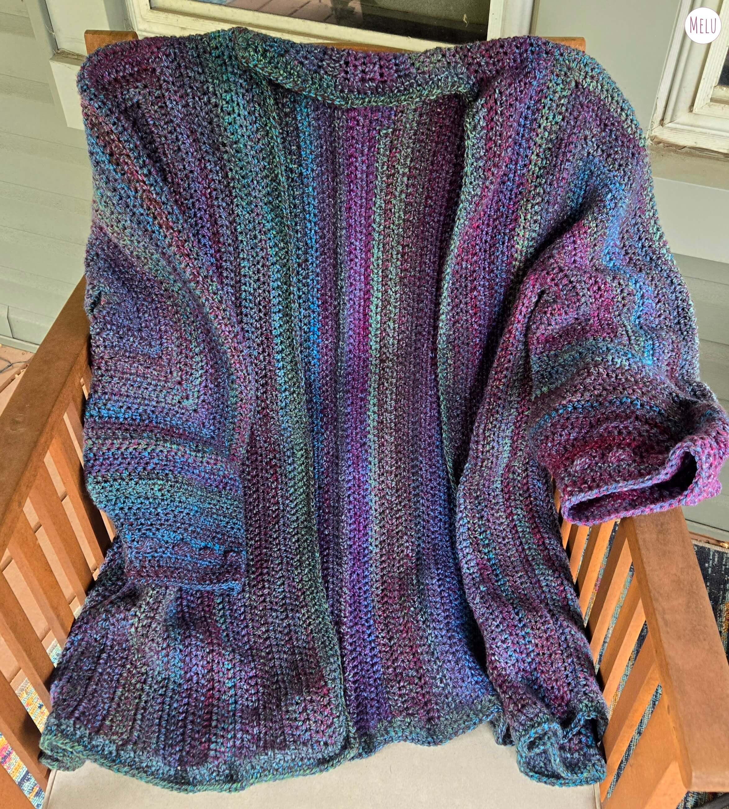 Barbara @crochetbybarbaragayle used Lion Brand Mandala Ombré yarn in the Felicity colorway to make size XL-2X in length D