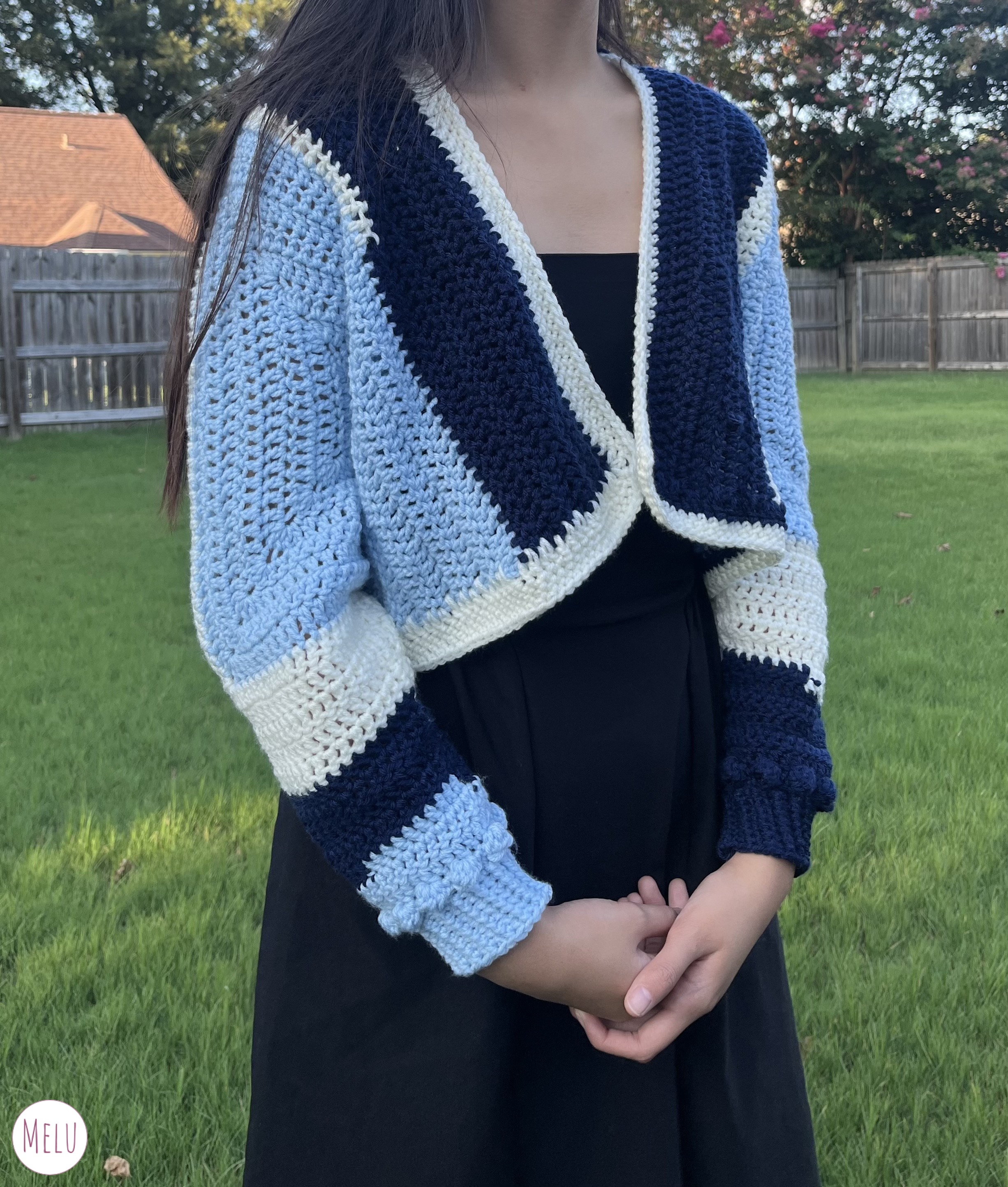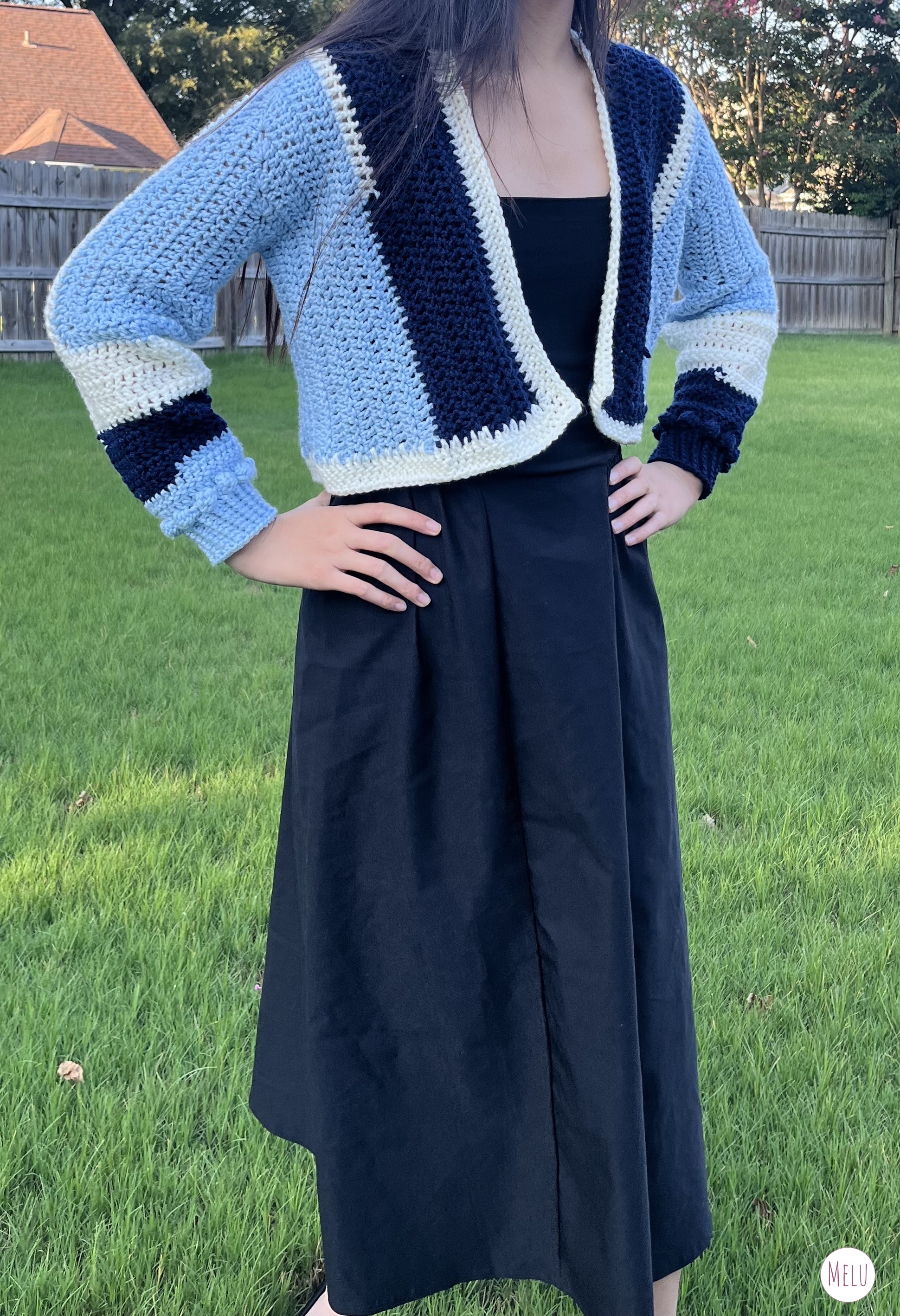 Shino @shino_the_octopus made size XS/S in length A. She used I Love This Yarn in Navy. Crafter’s Secret in white and light blue