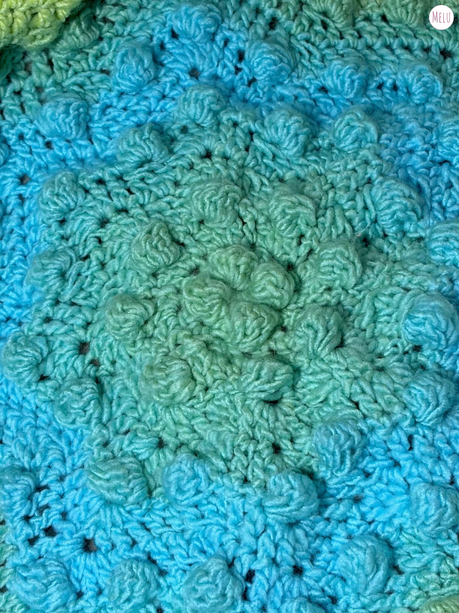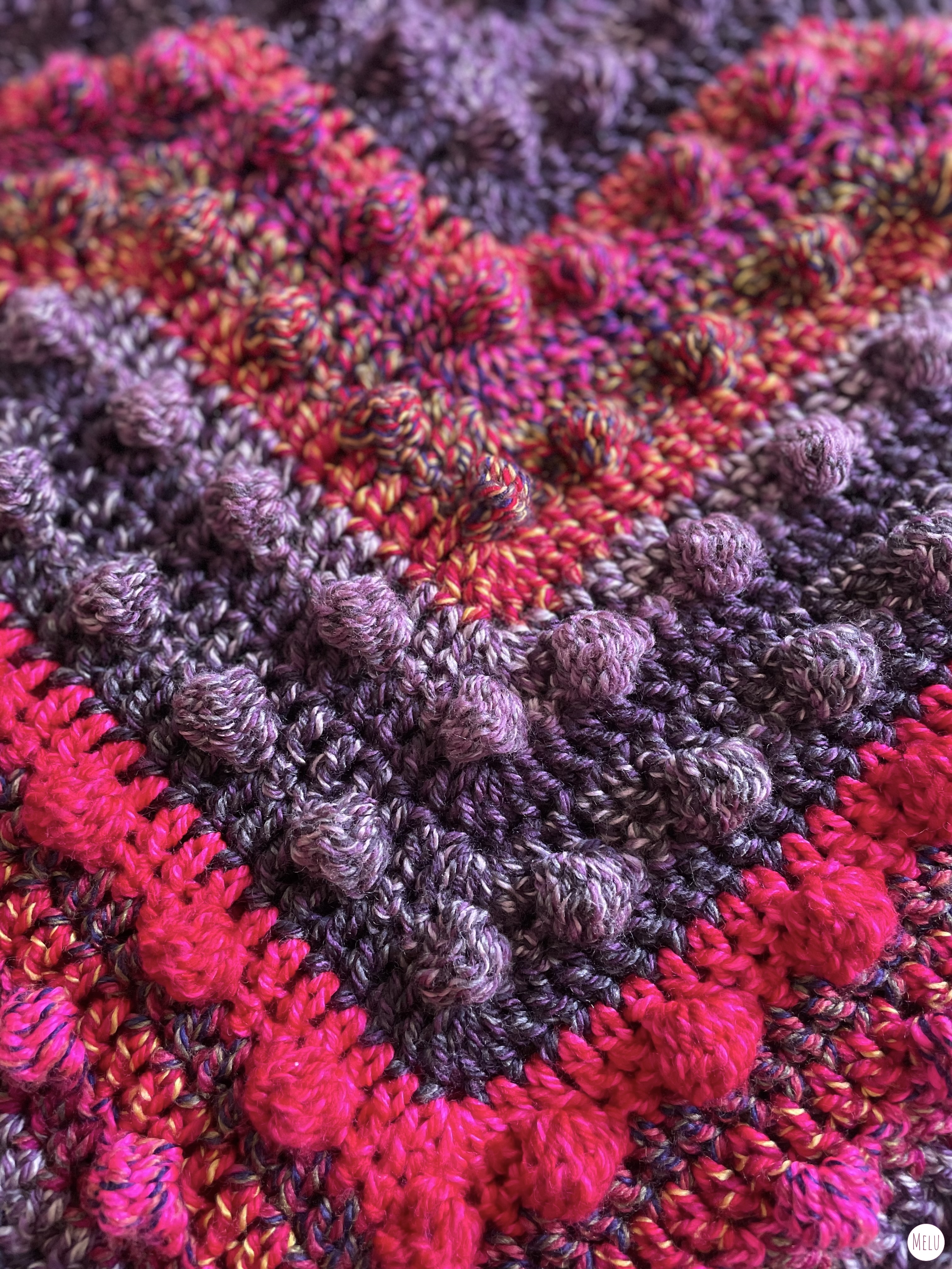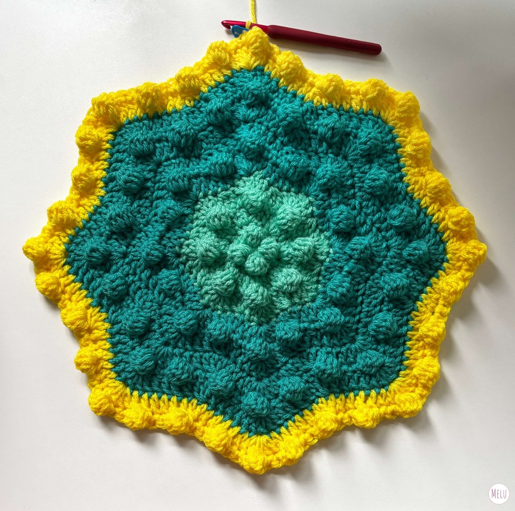 The design forms a repeating, rhythmic sequence that is calming and mindful to work through. It uses simple crochet stitches alongside a classic bobble stitch to create a rich, textured fabric that looks impressive without being fiddly or frustrating to make.