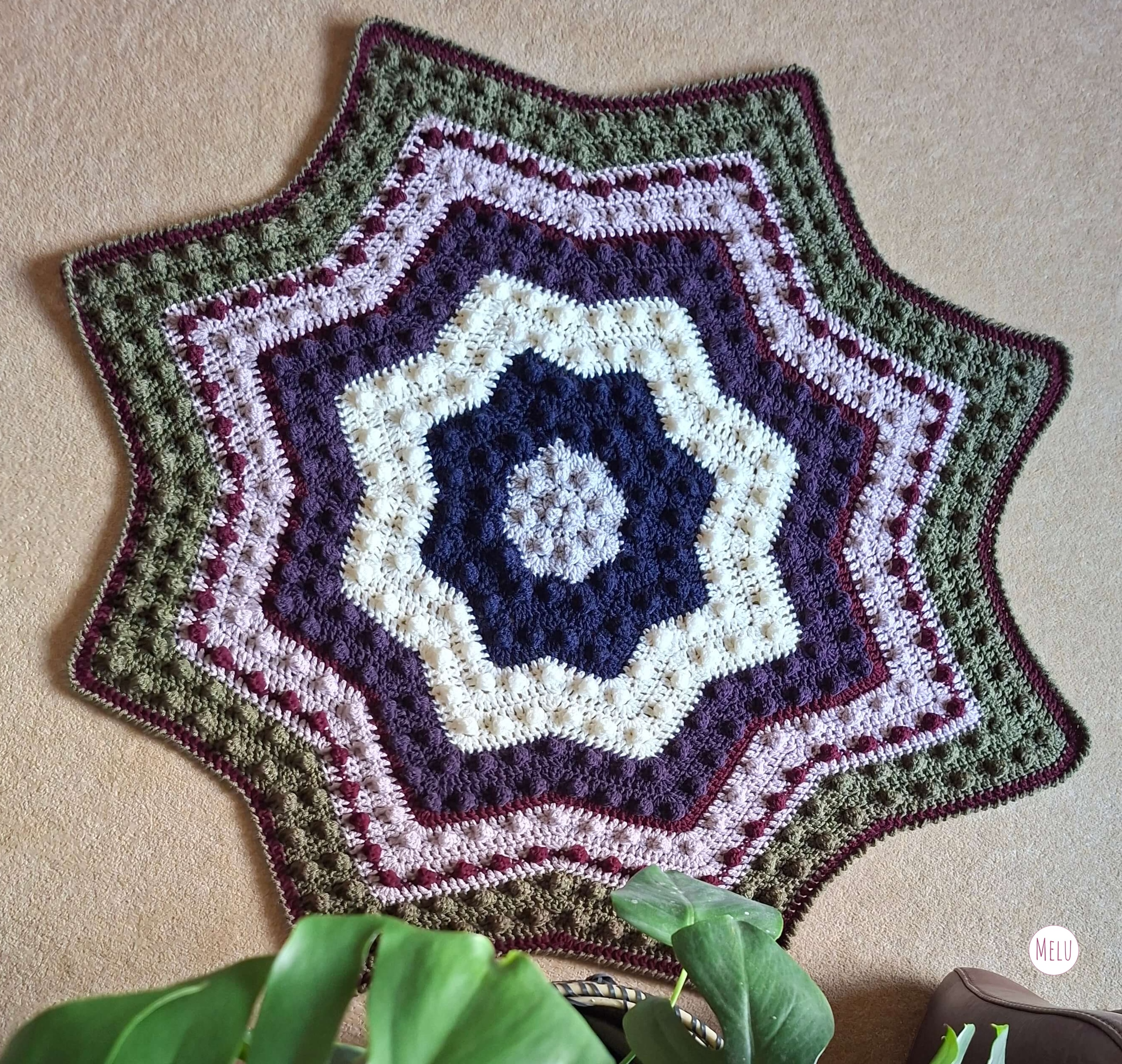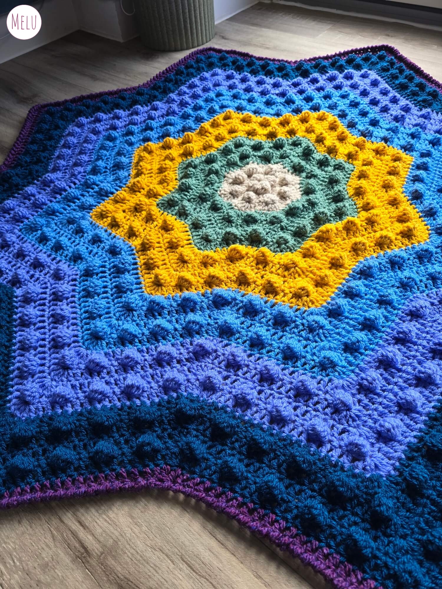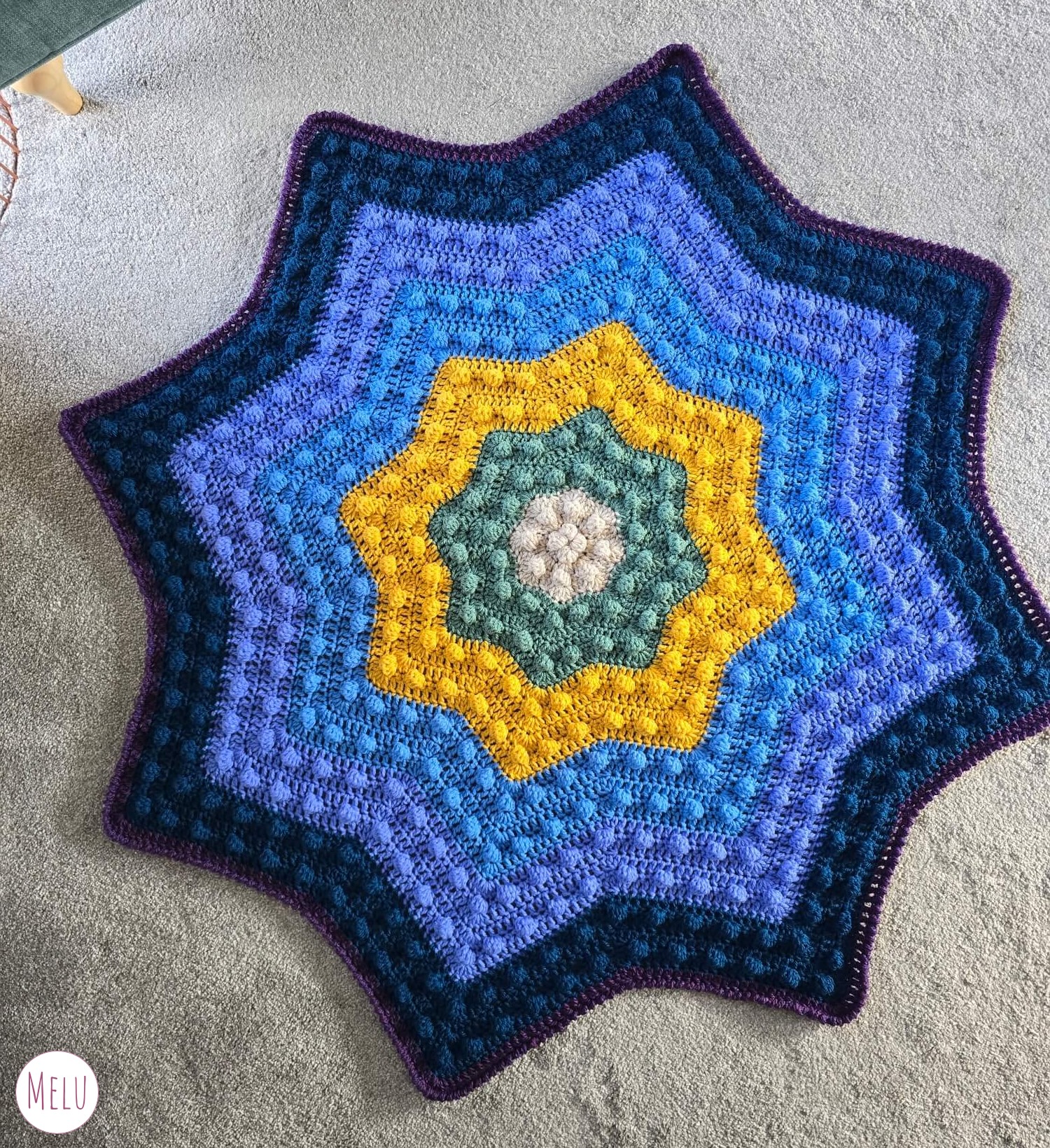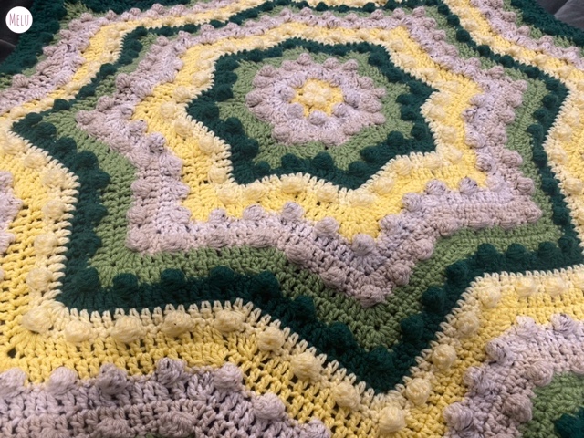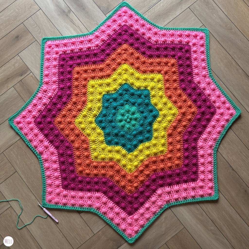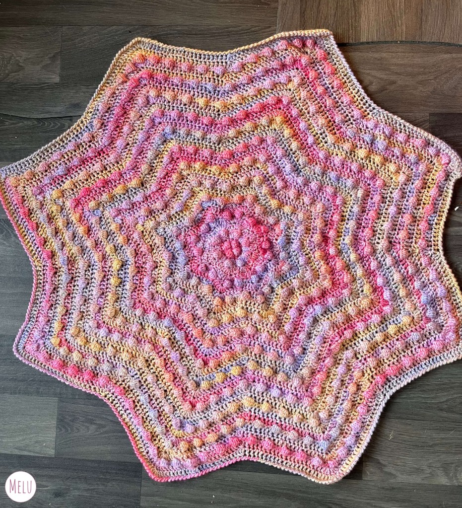 The Nebula Bobble Star Blanket is a striking, star shaped crochet blanket featuring a beautifully textured bobble pattern that radiates outwards like a glowing nebula.