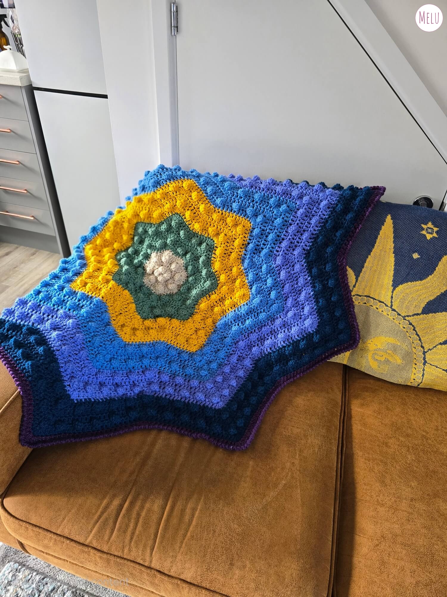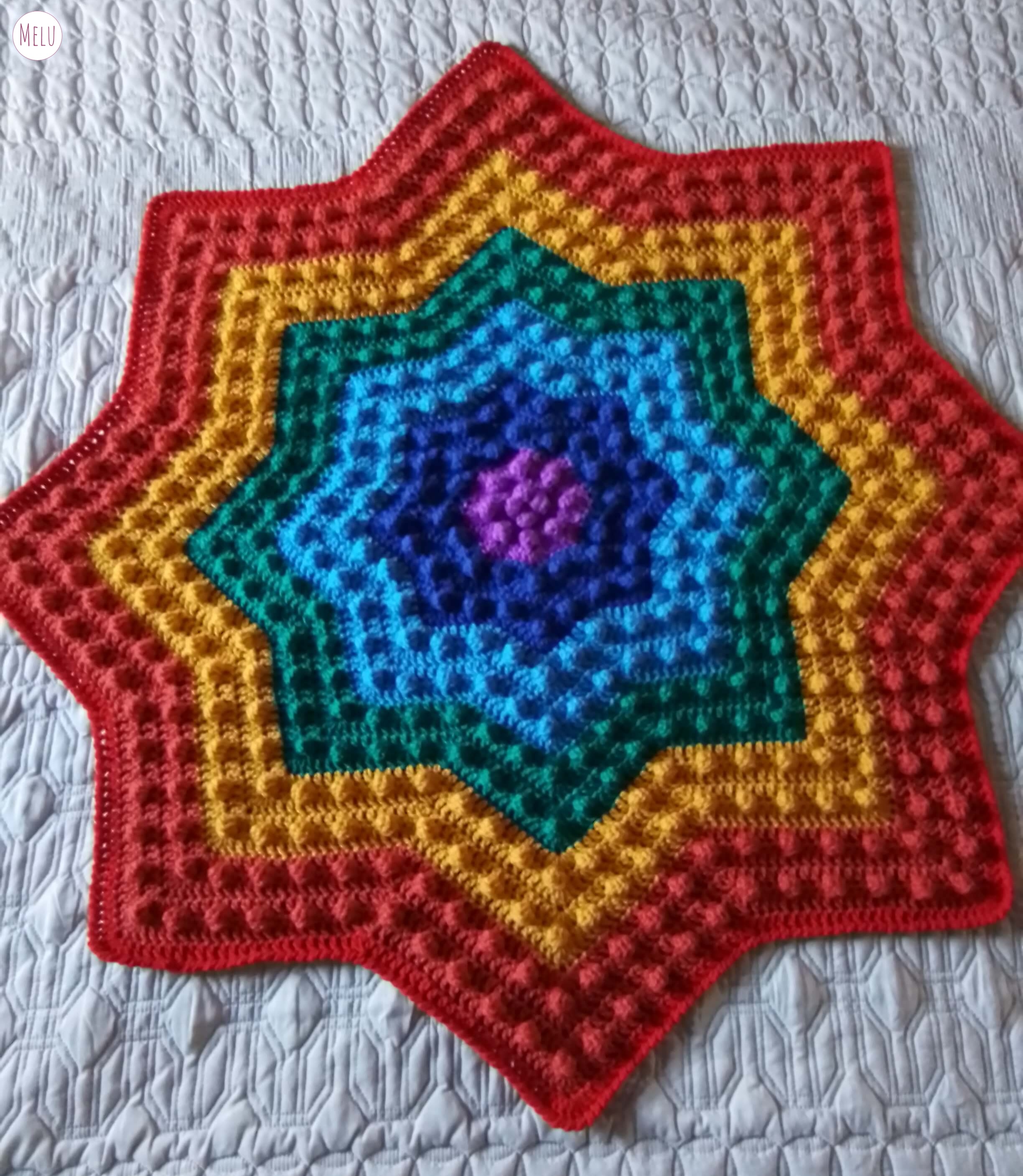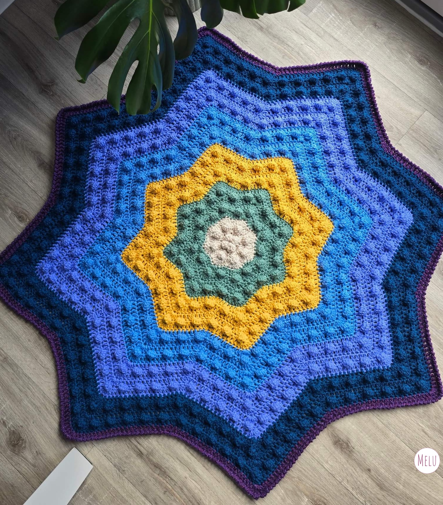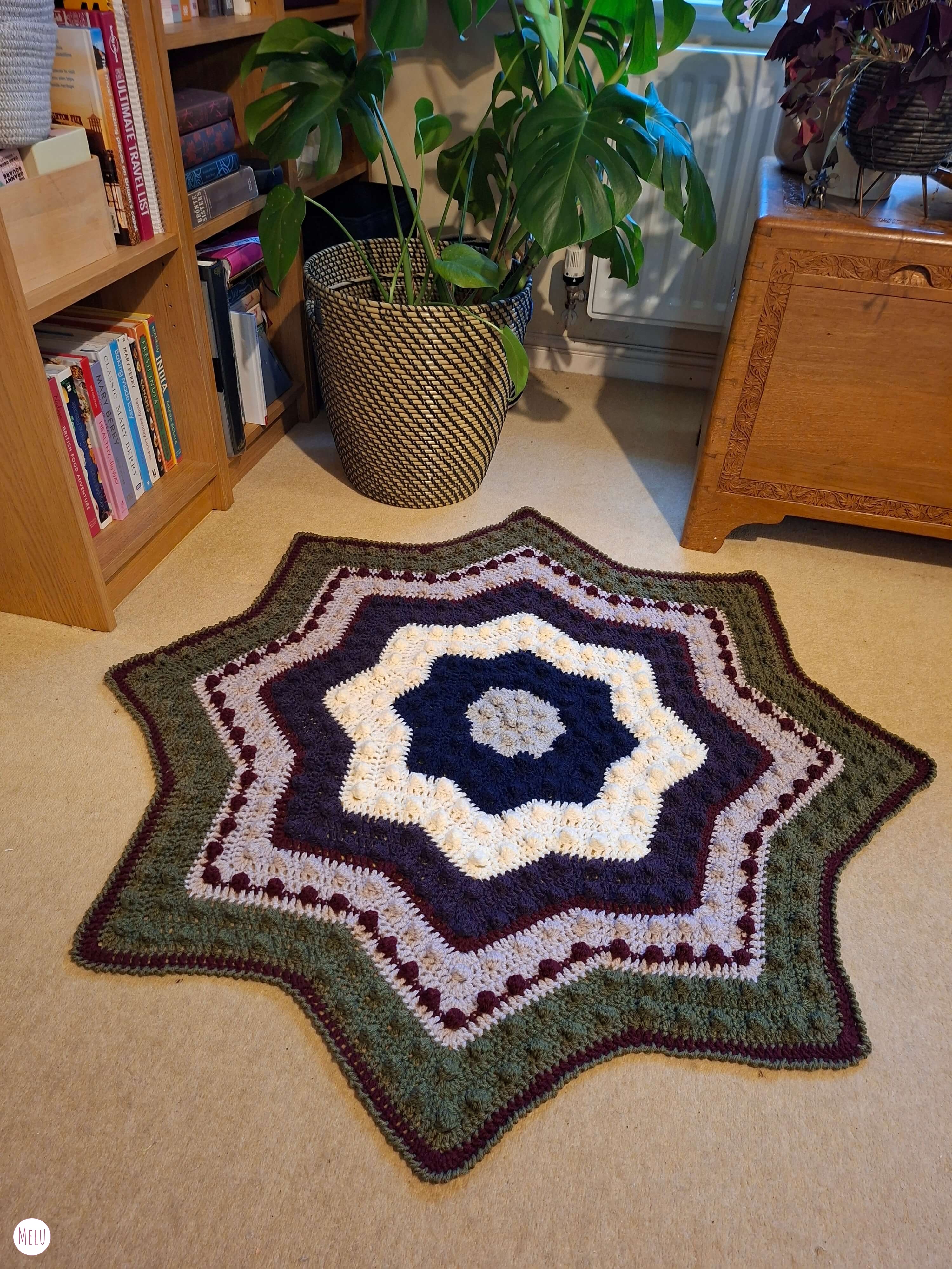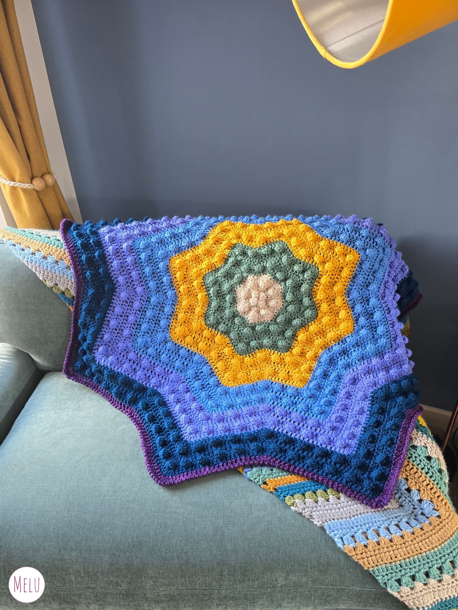 The Nebula Bobble Star Blanket is a striking, star shaped crochet blanket featuring a beautifully textured bobble pattern that radiates outwards like a glowing nebula.
