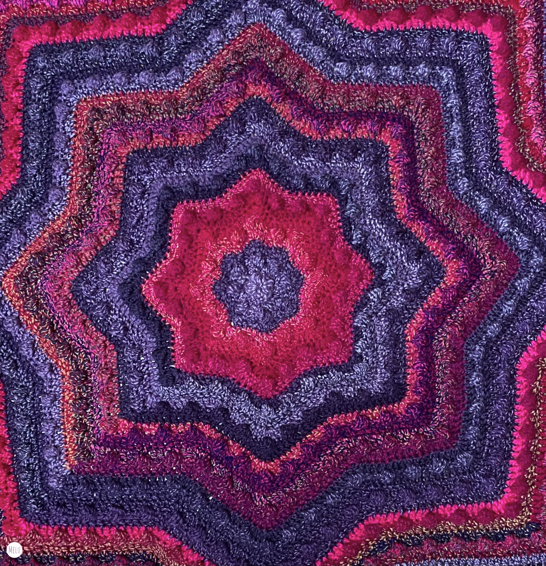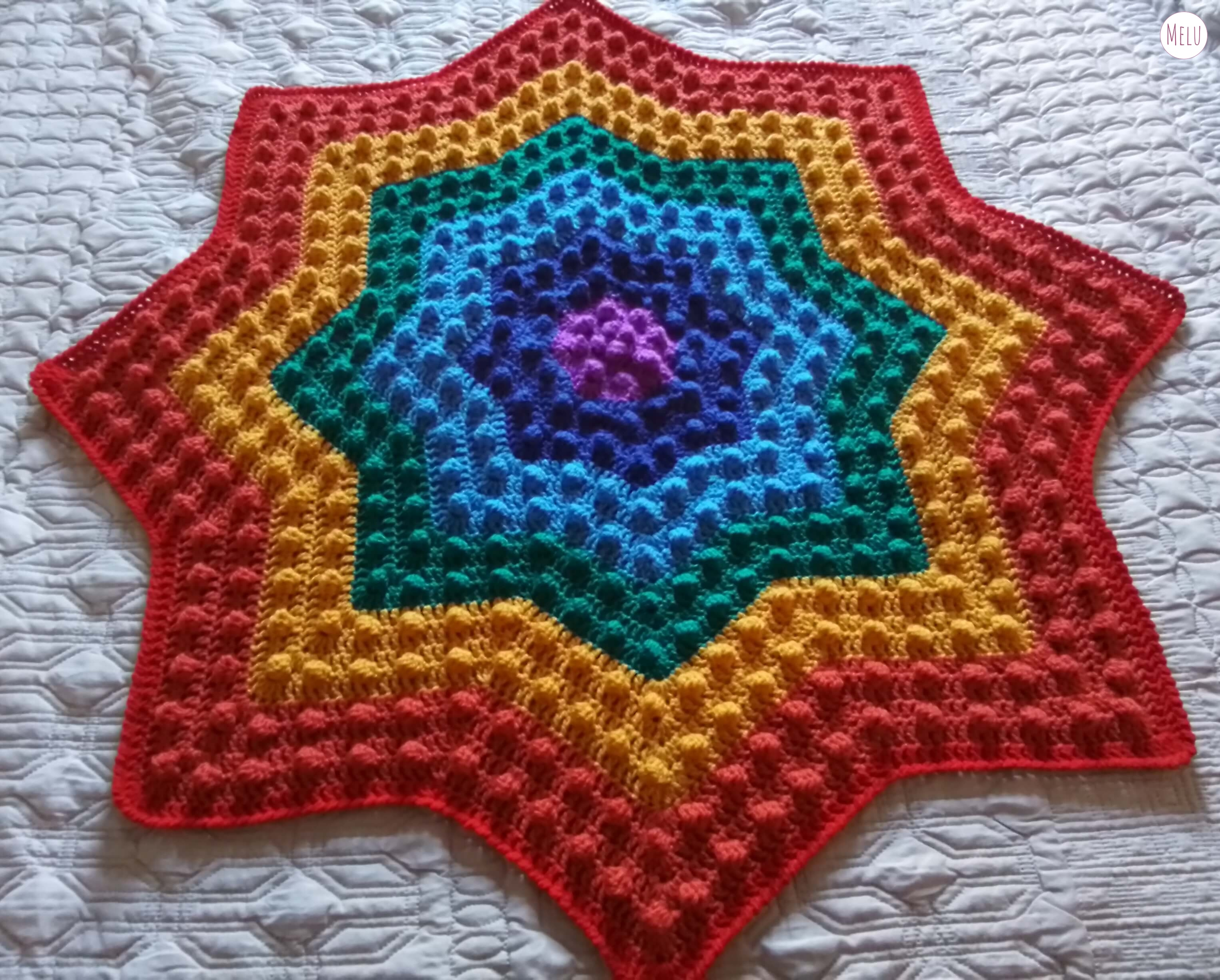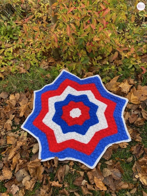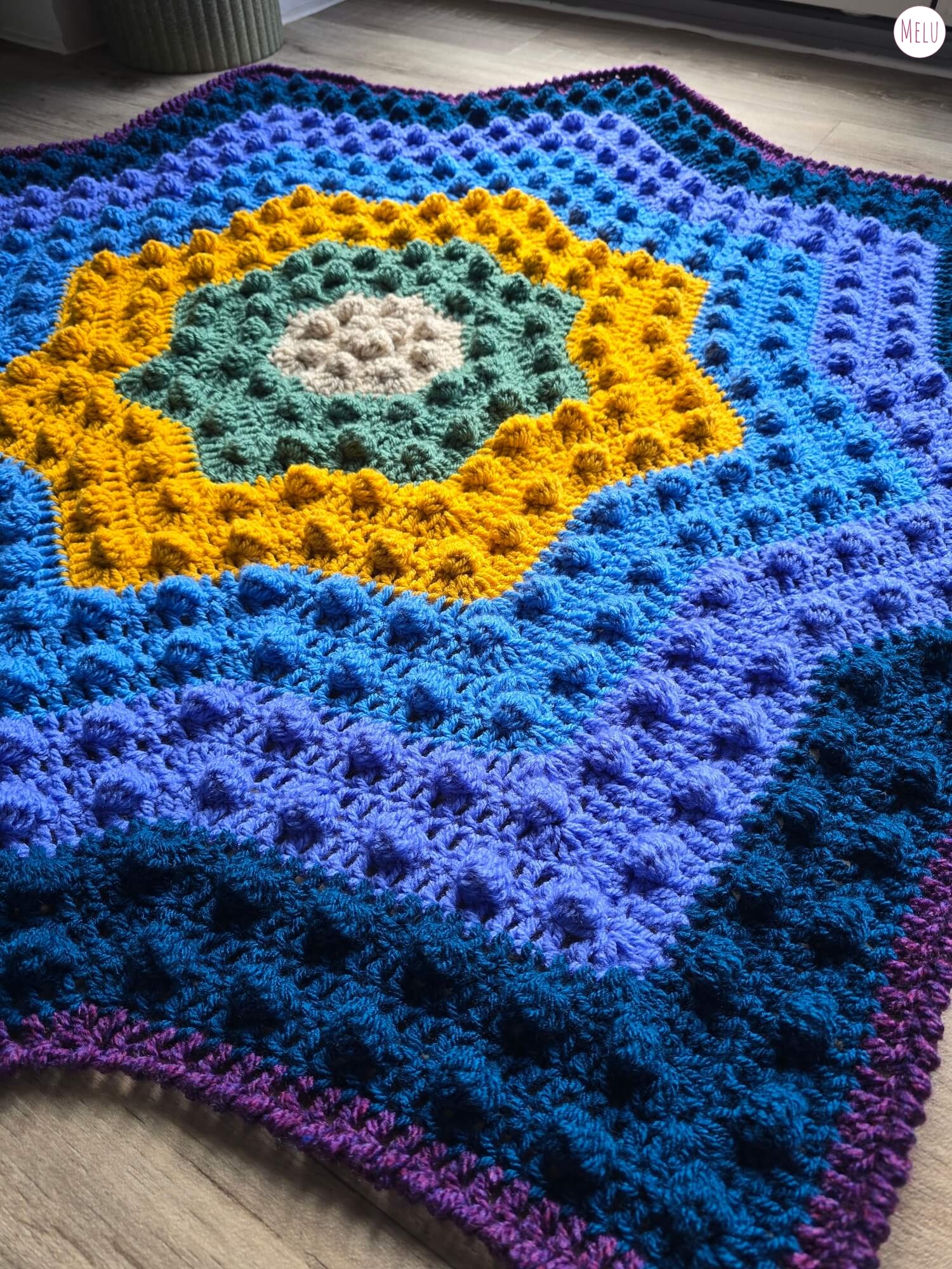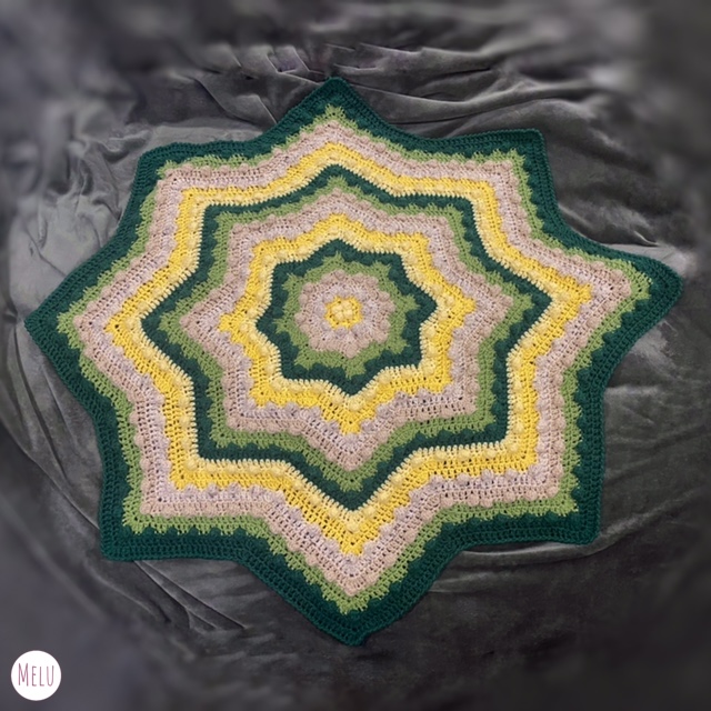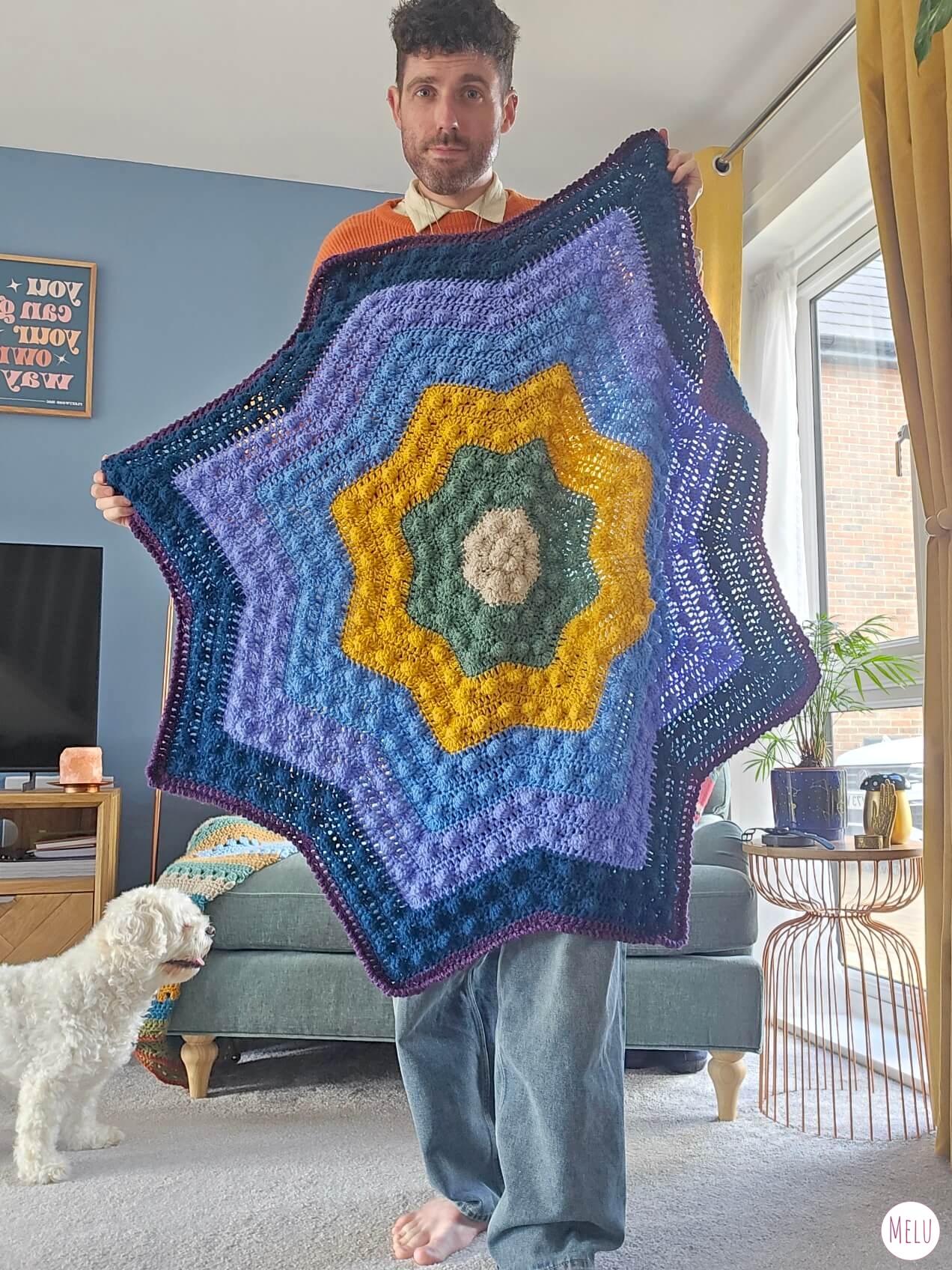 The Nebula Bobble Star Blanket is a striking, star shaped crochet blanket featuring a beautifully textured bobble pattern that radiates outwards like a glowing nebula.