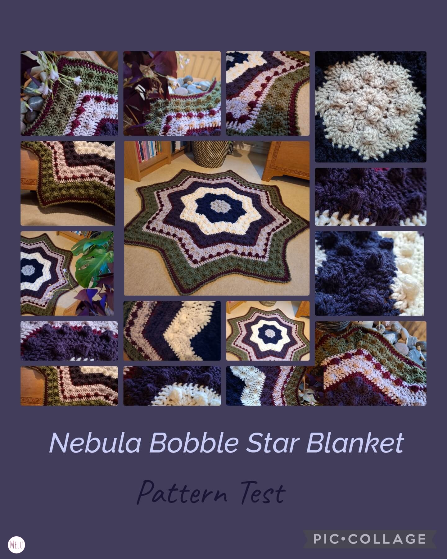 The pattern includes full written instructions, stitch guidance, a yarn colour chart, and photo tutorials, giving you everything you need to create your own Nebula Bobble Star Blanket with confidence and enjoyment.